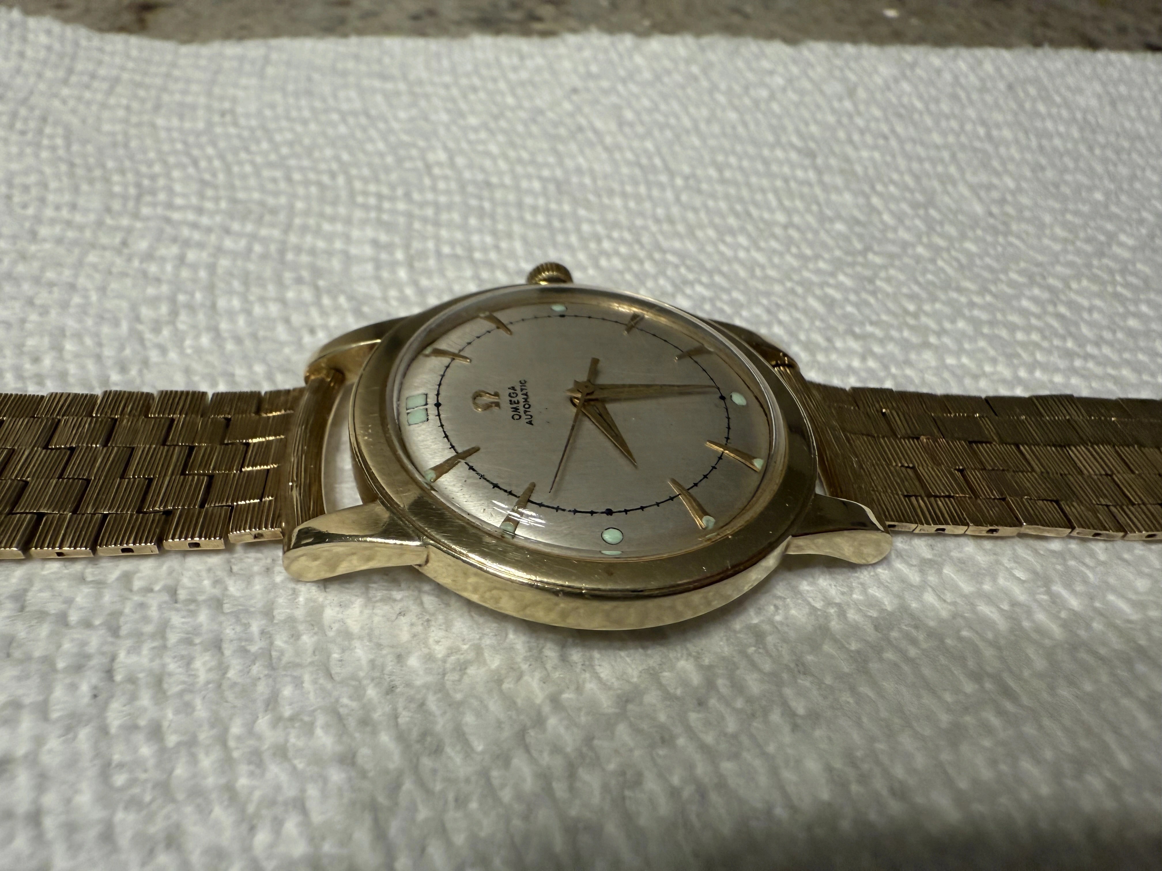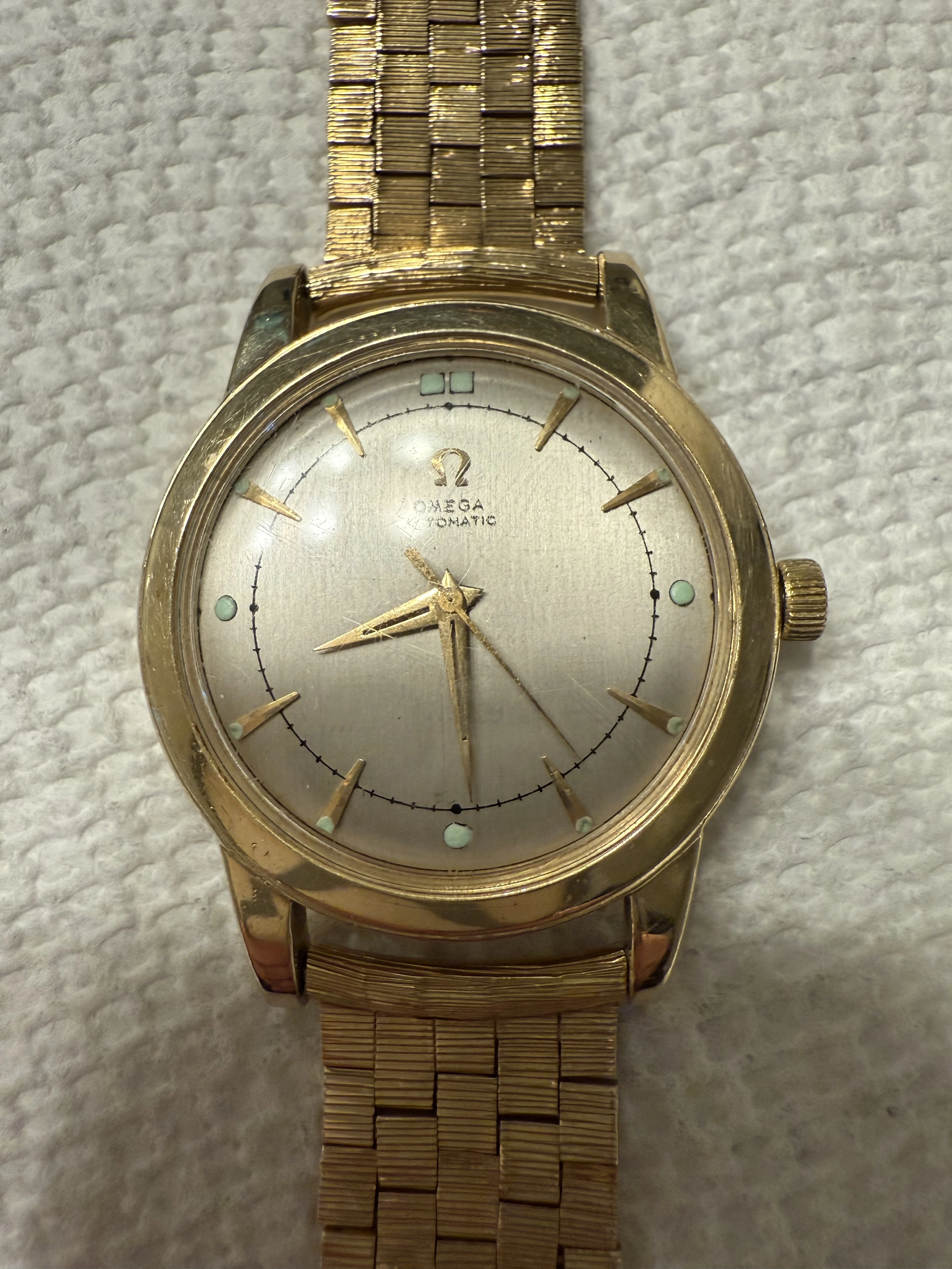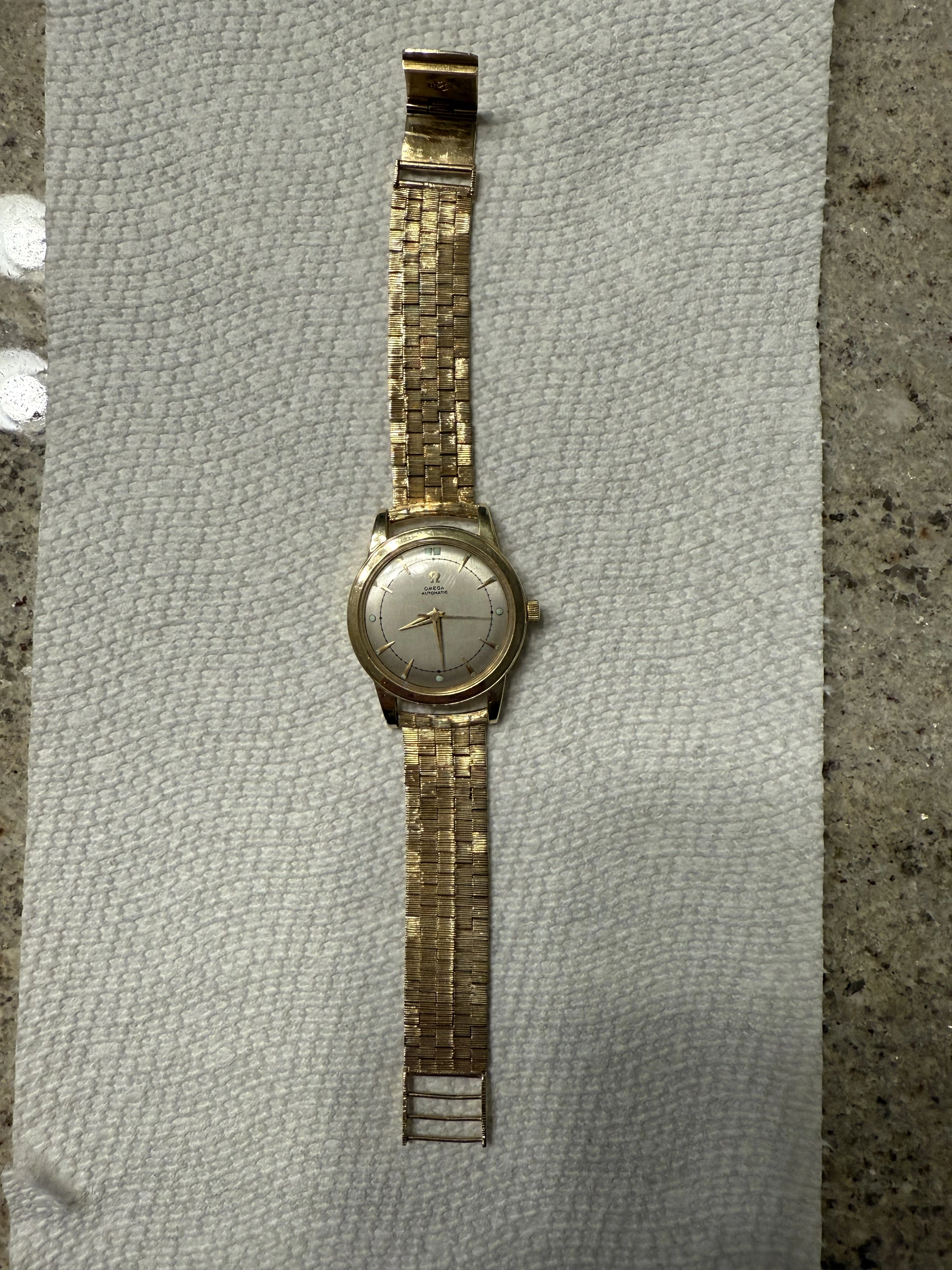 ·Hello. This was a watch with family history, but I rarely wear it. I had it overhauled by a jeweler a few years ago and it keeps excellent time as long as it is worn or wound. The gold strap is the original one that was on the watch when it was originally purchased. When I had asked about it at an Omega boutique once they said it was a known, unusual watch band but I have not been able to find any information about it. My question is whether the watch has any collector value or is it possibly just worth its value for the gold.
