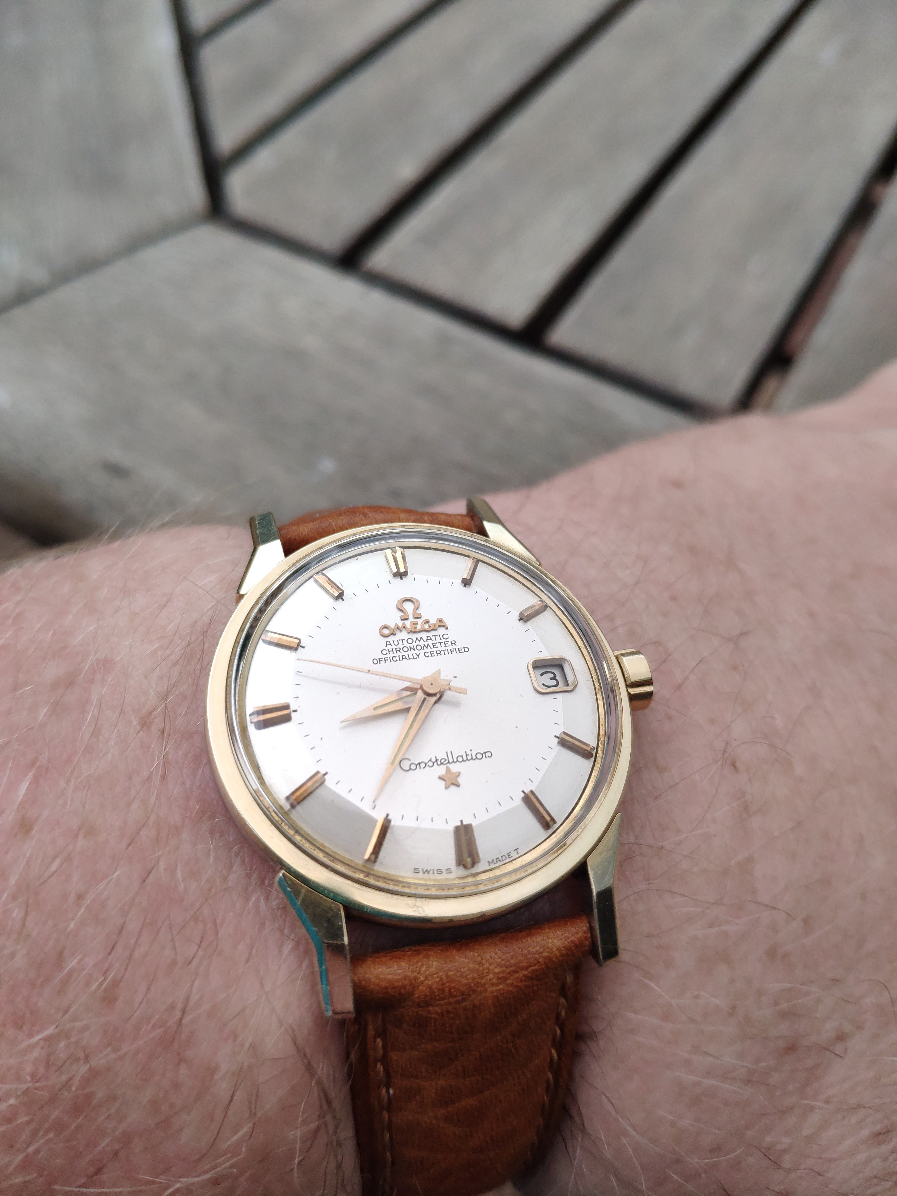 路hello everybody im peter from the Netherlands and after my espresso hobby to my wives horror i discovered mechanicle classic watches especialy omega and longines. i bought this watch on chrono24 from a shop in brussels that has serviced it and gave me 2 years of warrenty, a 1964 cal 561 pie pan omega constellation 14k/ stainless