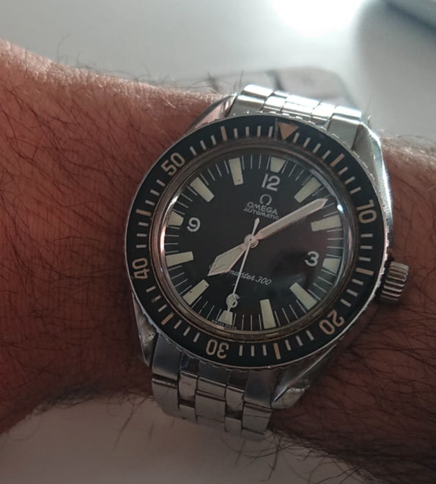 Omega used tritium during this period. Interestingly, your dial doesn't appear to have "T" markings, indicating tritium, on either side of "Swiss Made." Also of note, your dial doesn't seem to have any patination. If it is authentic, it could be an Omega factory luminova service dial. That would reduce value because collectors of old 300s like the original tritium dial due to the aged look of rotting tritium on luminous material.