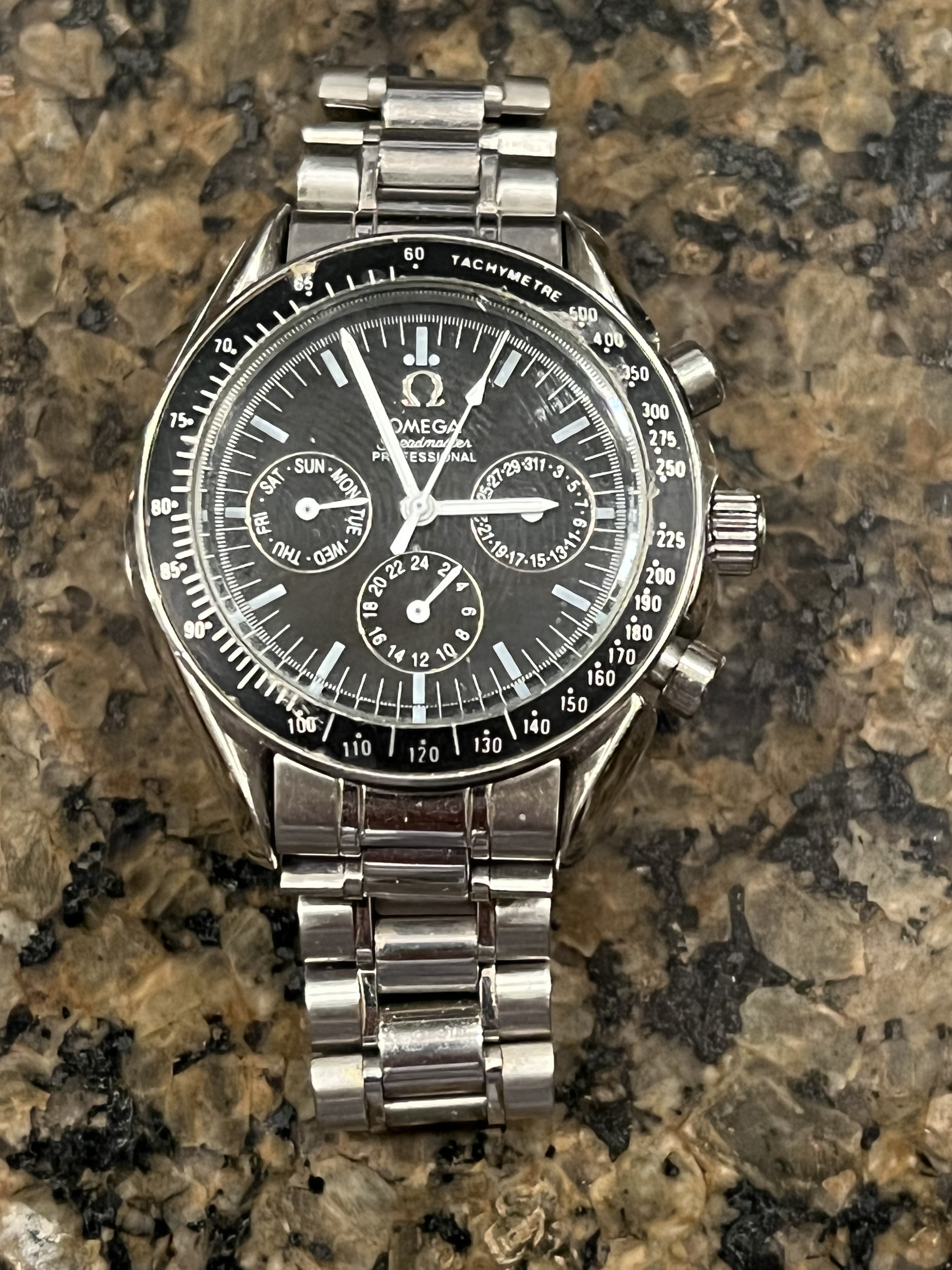 ·This is from my father's estate. What I think I know about it is that it was bought around 1970. However, my own investigation may have uncovered it as a copy (fake). I could not find another version with the days of the week on the 9 o-clock location. Is this one a known variation or a nice copy? Still my dad's but I would like to know if it is real or not. Guessing fake, but if real- perceived value would also be interesting.