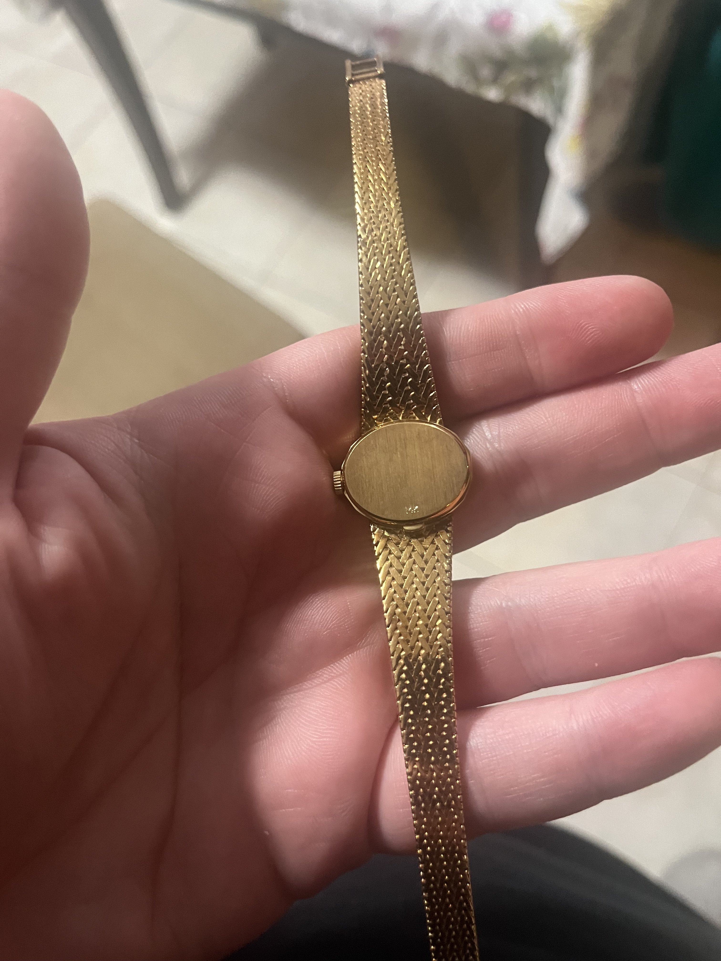 Stamped 14K Gold. Made in italy . Has a jewel on top (diamond?) tried the chrono24 app….no luck. It’s very small clearly for a woman.