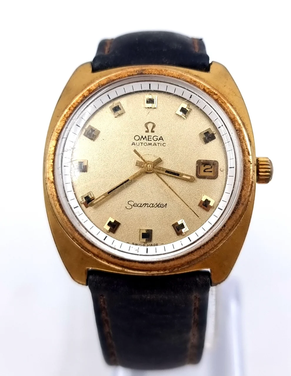 Stylistically, it seems very late 60's/early 70's, but through searching Google, Chrono24, etc I haven't managed to find a direct match. It looks quite similar to the cases for Seamaster Cosmics from that era, but it doesn't have any such identifier on the dial. Unsure if it might have been re-cased, due to this.