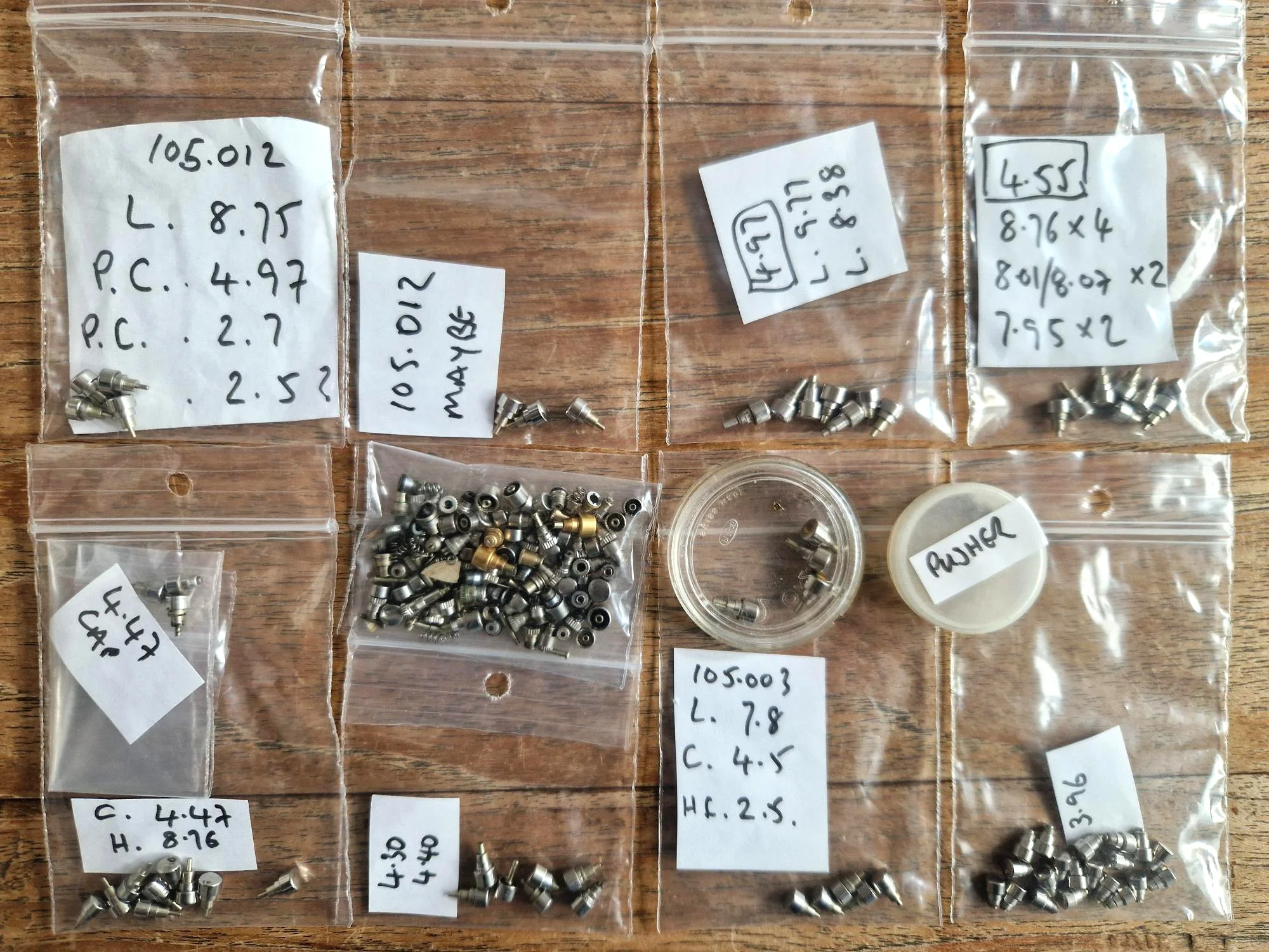 @Aludic and I spent a relaxed day sorting through them all, measuring and identifying what we could, with the focus being on trying to sort the Speedmaster pushers out from the rest. We have got some pretty much nailed down ( 105.012 and 105.003 ) but there are so many of varying sizes it has been proving quite a challenge to make make significant headway on the rest.