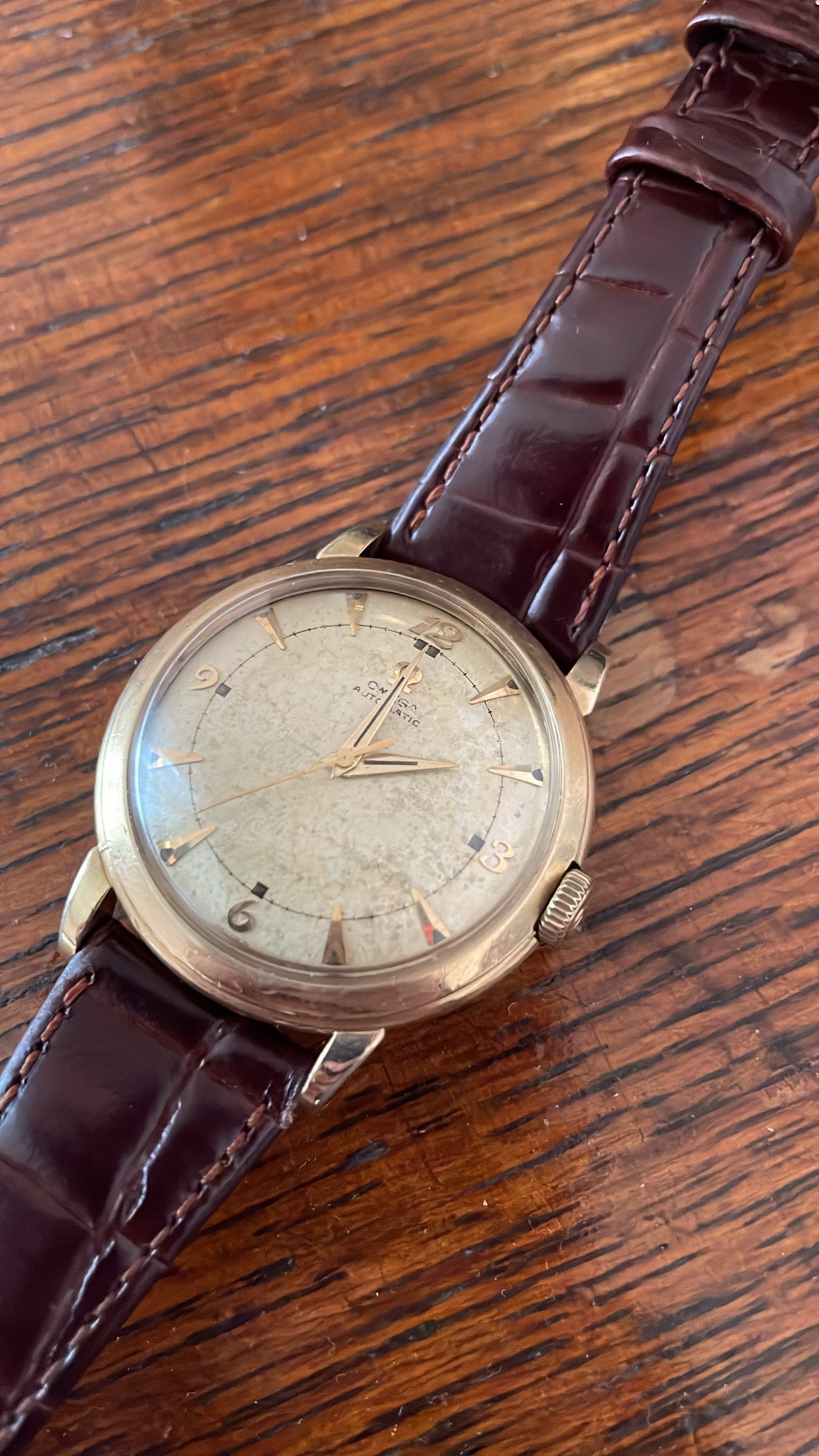 Case looks to be Ref. G6213, but with the dial shown from a Ref. 6017. Dials were mixed and matched by Omega on many models.