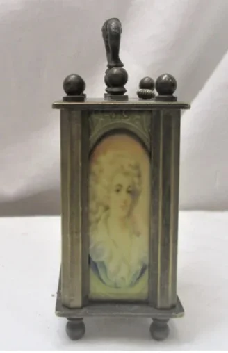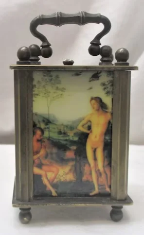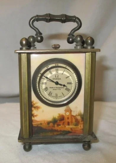 Glass-encased porcelain dial with Roman numerals. The front and side cloisonné panels have pastoral pictures, and the back panel has a nude scene. The clock marked "Omega Made in Switzerland since 1775". It has ball feet and the same ball studs on the top. Ornate handle. Brass time setter topped. The total height is 3 1/2," and the clock center is 2 1/4". The base measures 2" x 1 5/8".