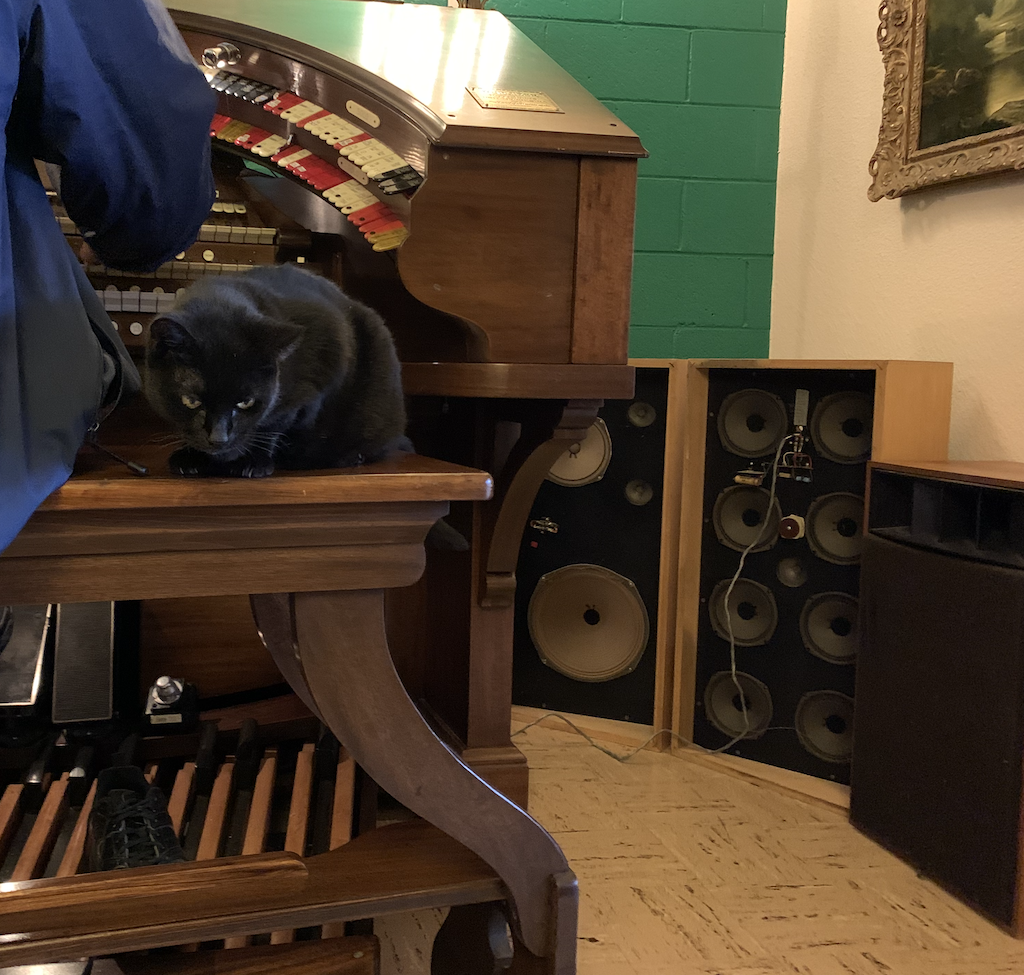 Anyway the cat has been taking to sitting next to my friend when he plays. This is the electronic virtual I work on, where the console (once connected to pipes) now play pipe sample loops.