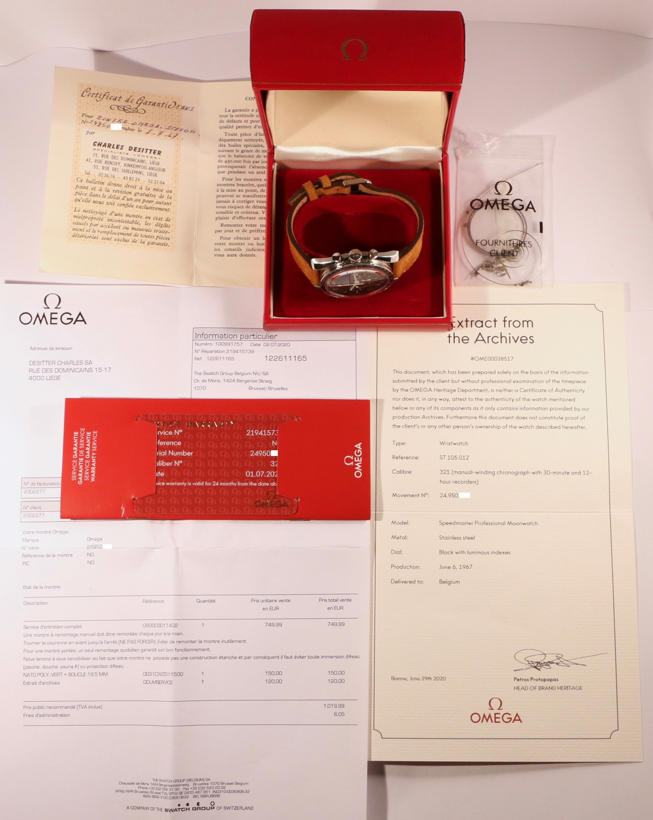 The watch was purchased from the first owner’s family and is a full set : it comes with its original box and papers, and also its extract of archives and Omega service papers from July 2020.