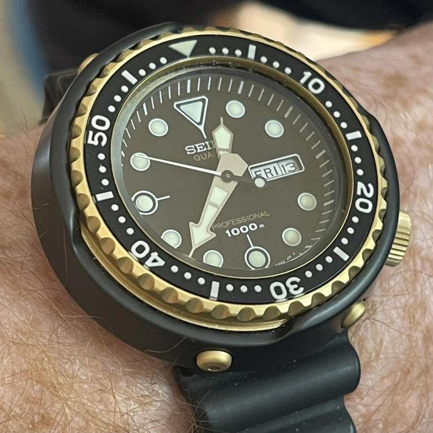 I liked my first Tuna so much I now have 2... This is by far my favorite, pretty much has become my summer daily driver. The thing I really appreciate about the Tuna design is that for such a large watch. 1) it is very light weight being titanium. 2) The underslung lugs give it only a ~42mm or so lug to lug length. It is the smallest wearing big watch I have ever tried on. (I might have to go get the automatic Tuna next...)