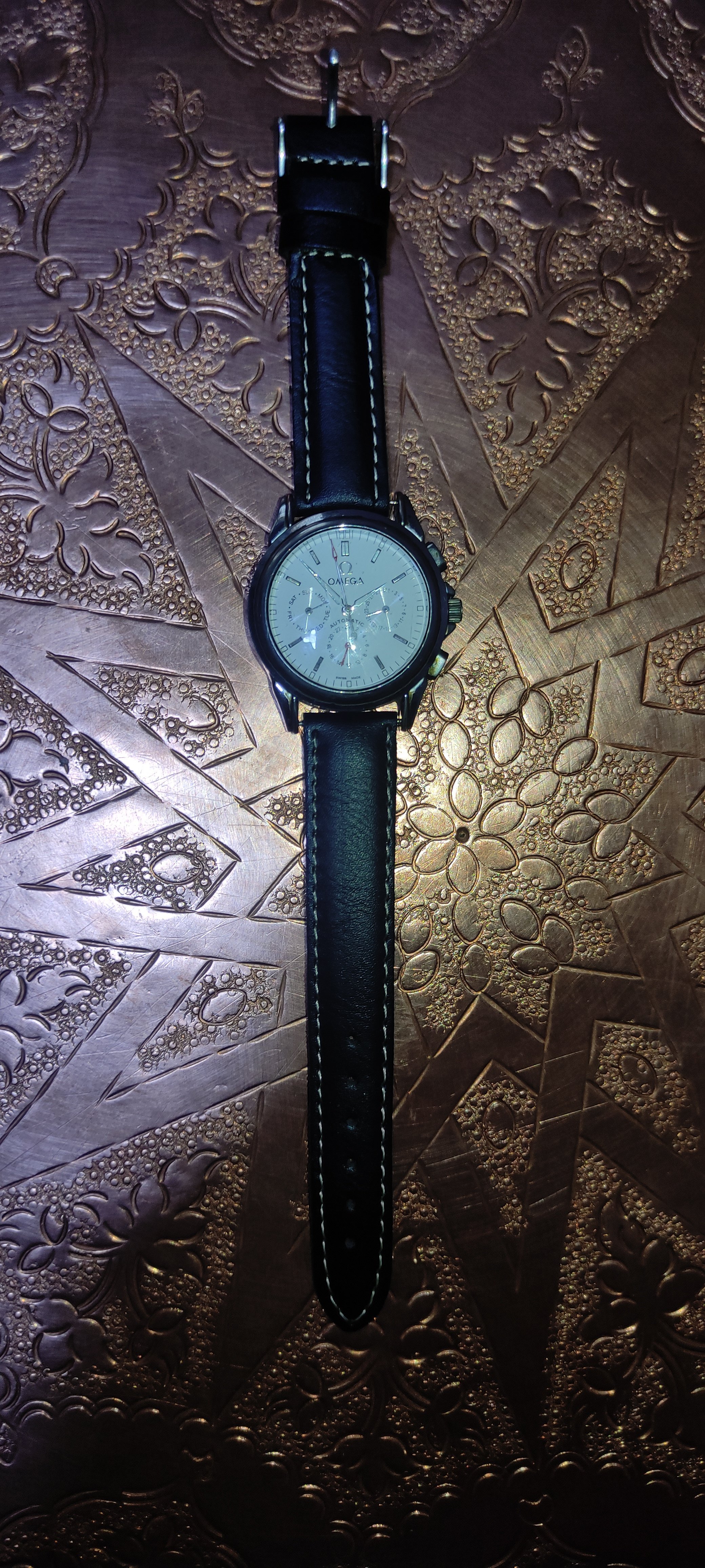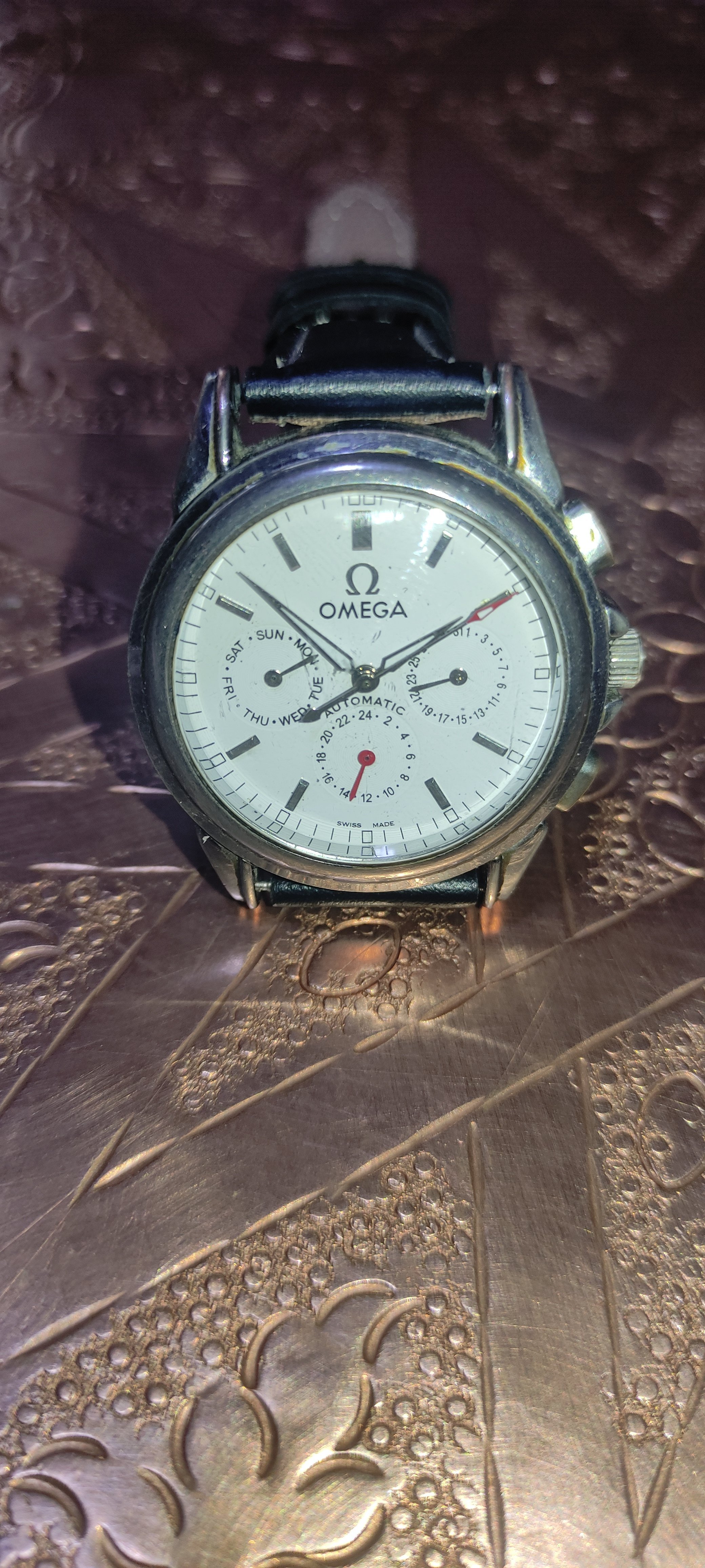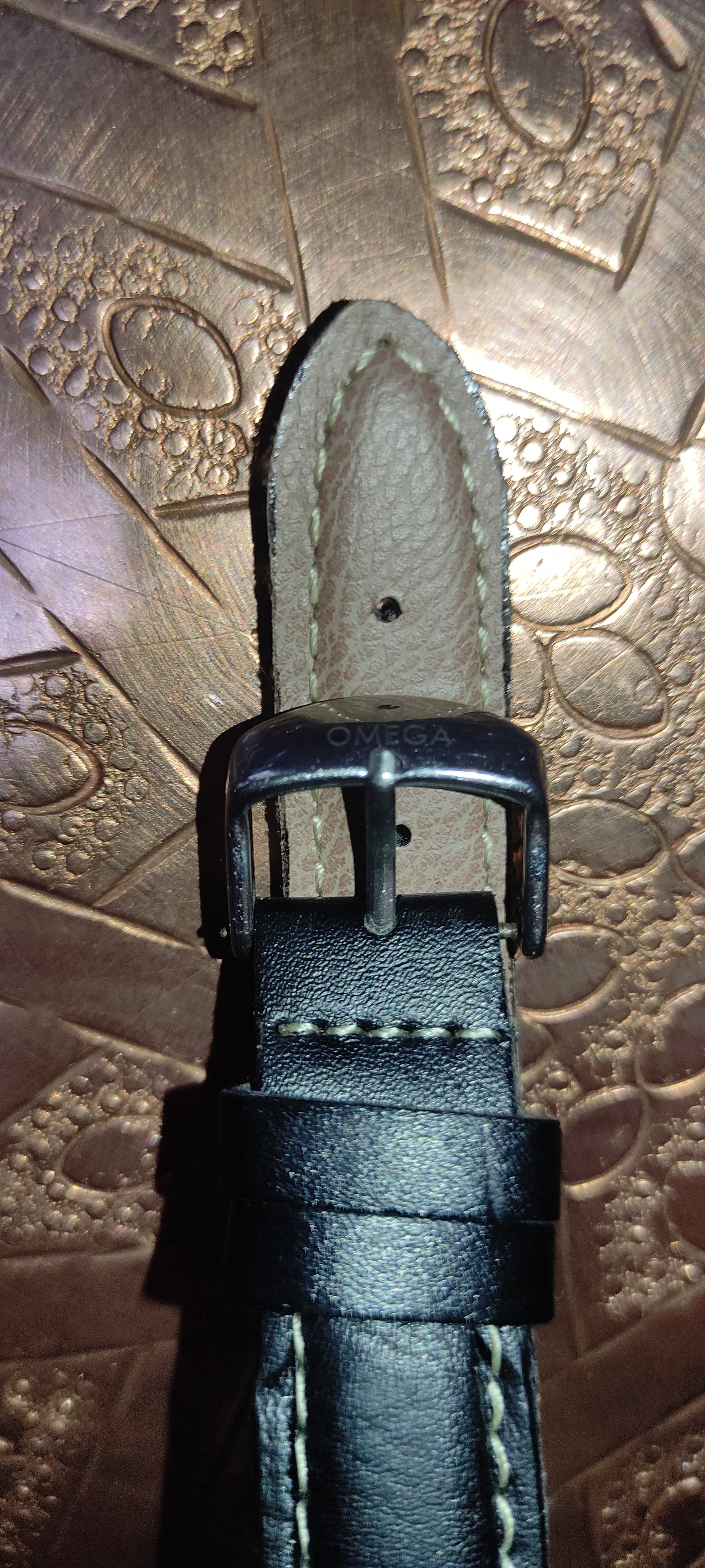 I found a really good mechanical watch and the seller said its an authentic omega watch and he only changed the straps because they got too old and he left the metallic part that says omega attache to the new straps.