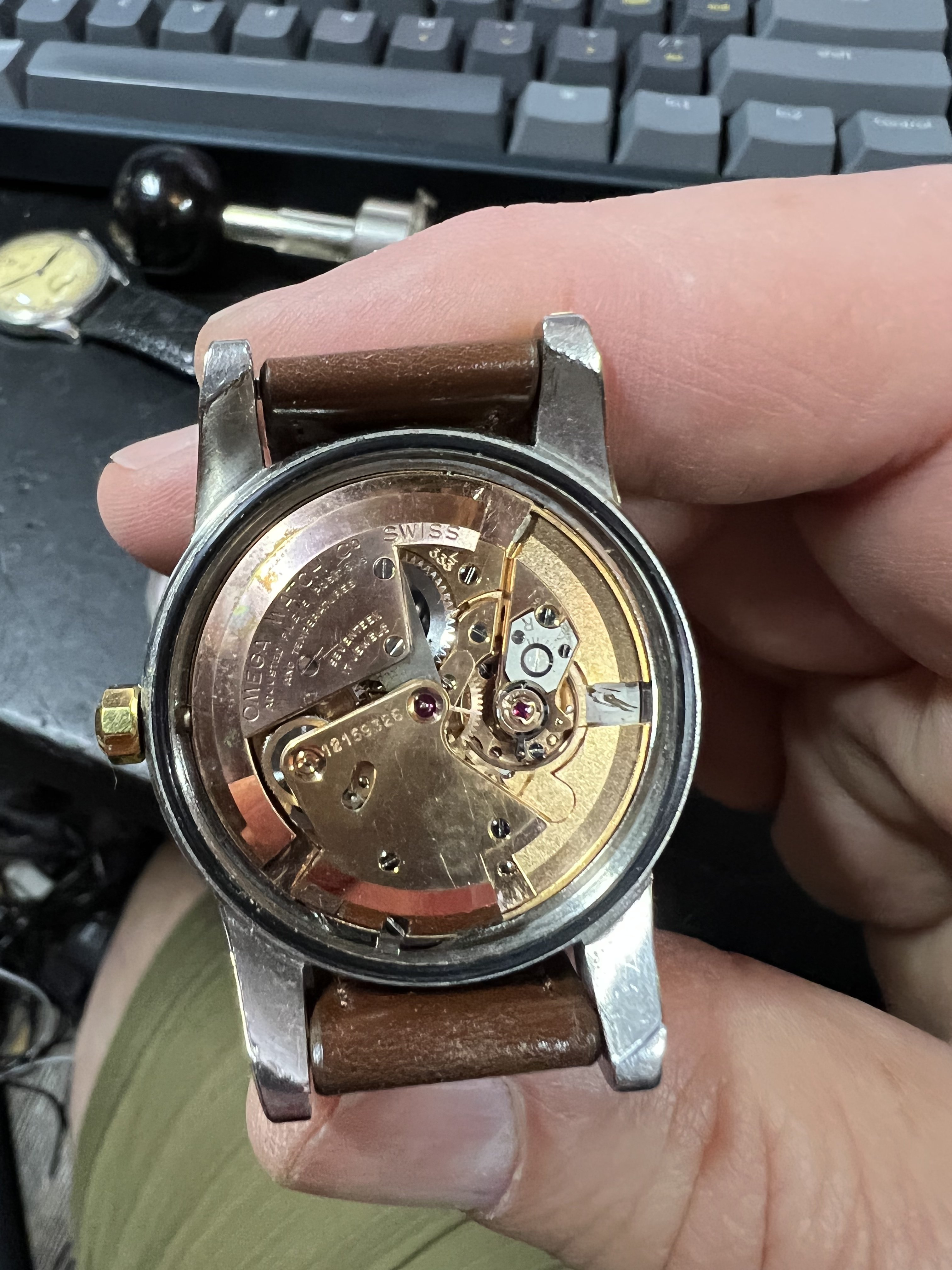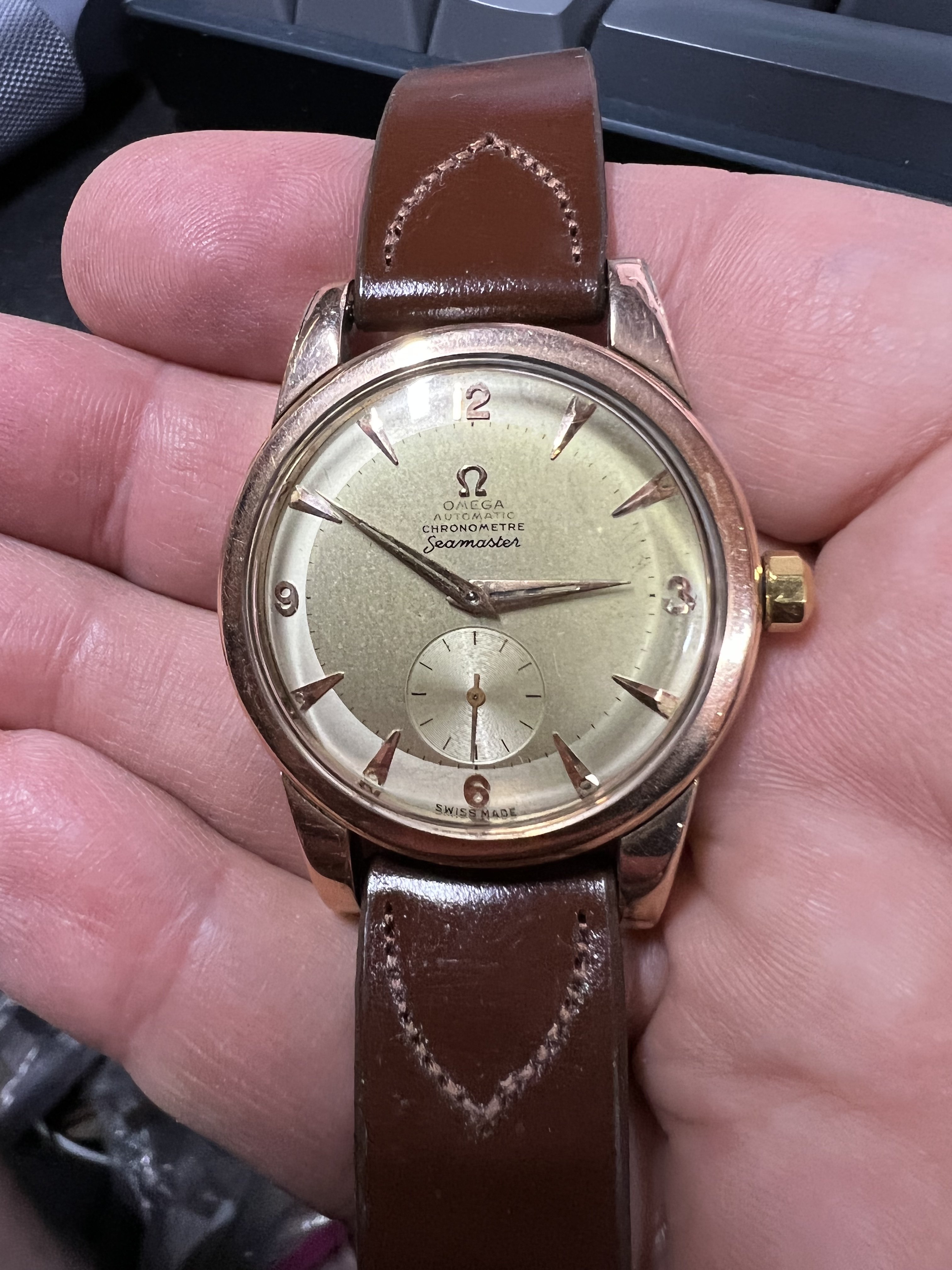 ·welcome. It is a 14k pink gold shell over stainless. Original honeycomb dial...yes stained...but that doesn't bother me for a 1953 watch. 36mm by 44 mm case. 354 bumper automatic...very clean. 294-9/2657 SC. Watch has been fully serviced and comes with a two year warranty, and from a very reputable dealer 40+ years in business here in LA.