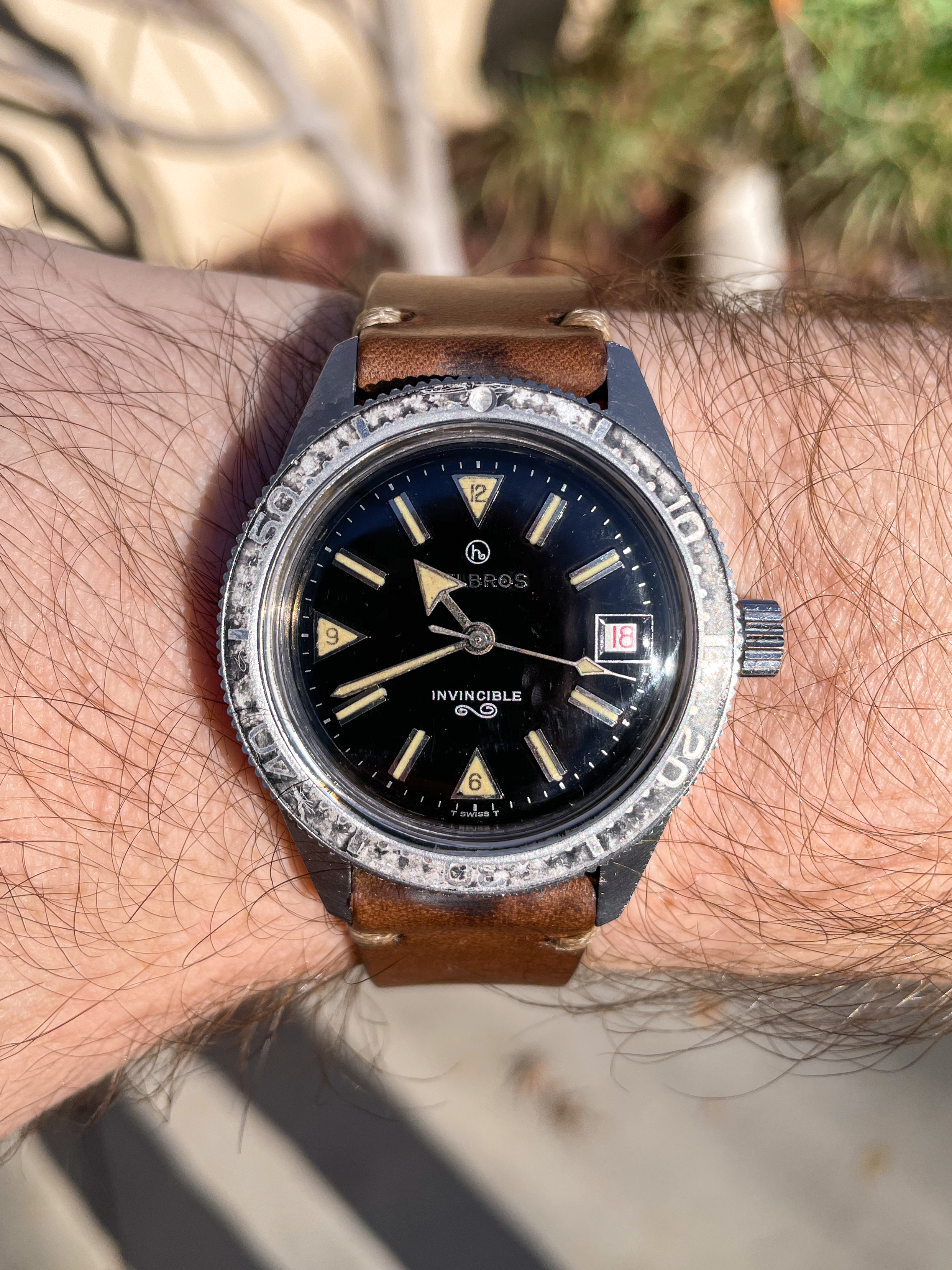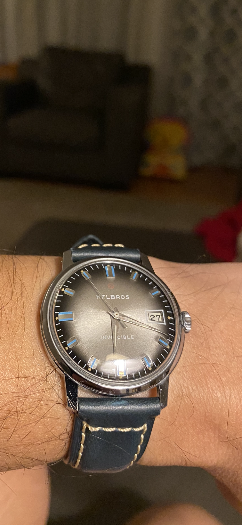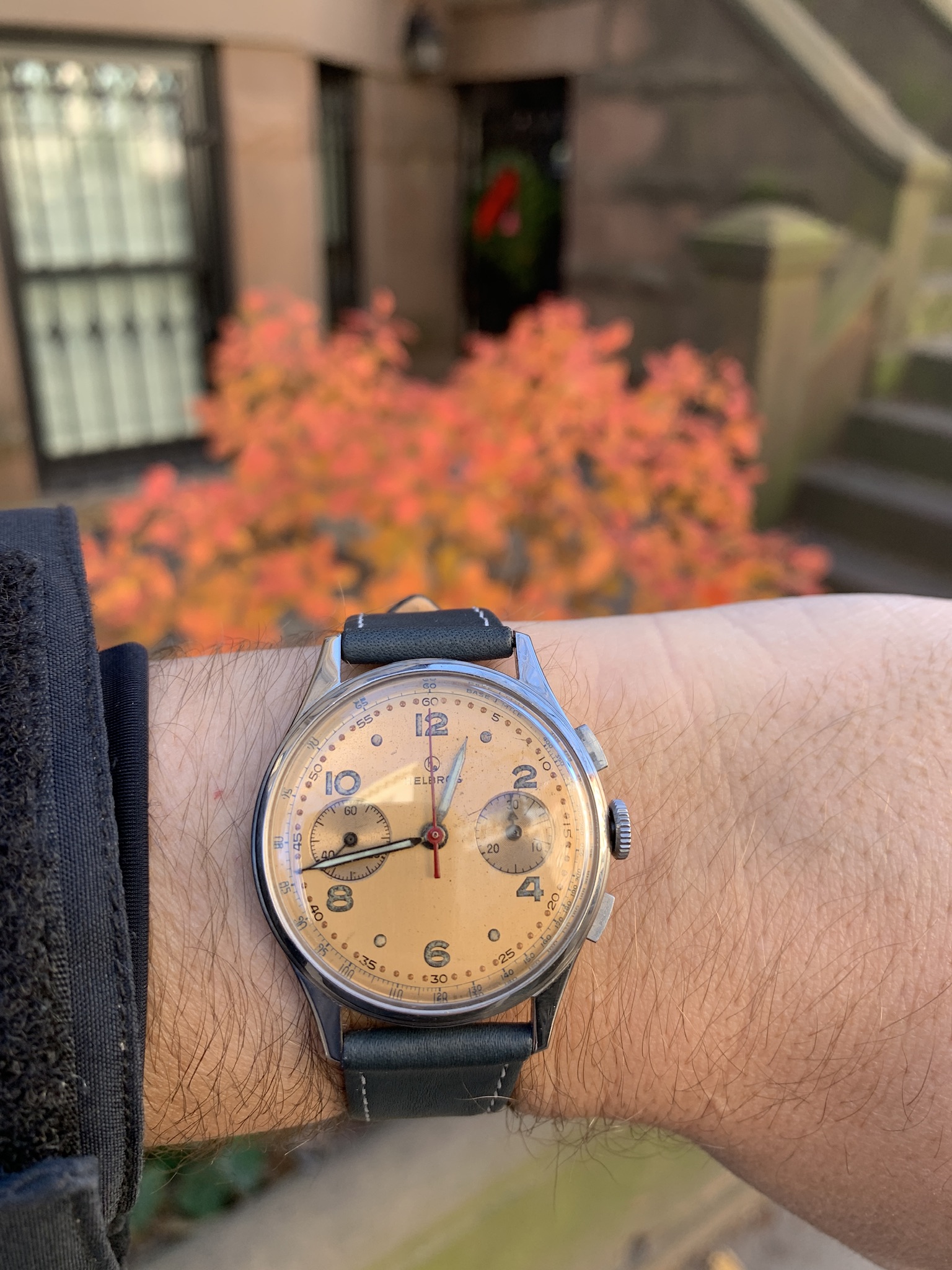 The helbros in the house, but running pretty good so far. One auto the, put some cheap straps I had, not sure when but a service. With luck and care, I hope the dial cleans up. The case on the auto is worn, was very like it saw a lots of duty. I don’t think you can get a vintage watch cheaper. Amazing the same company had the killer chronograph. Mr. Heil was about selling watches at any price.