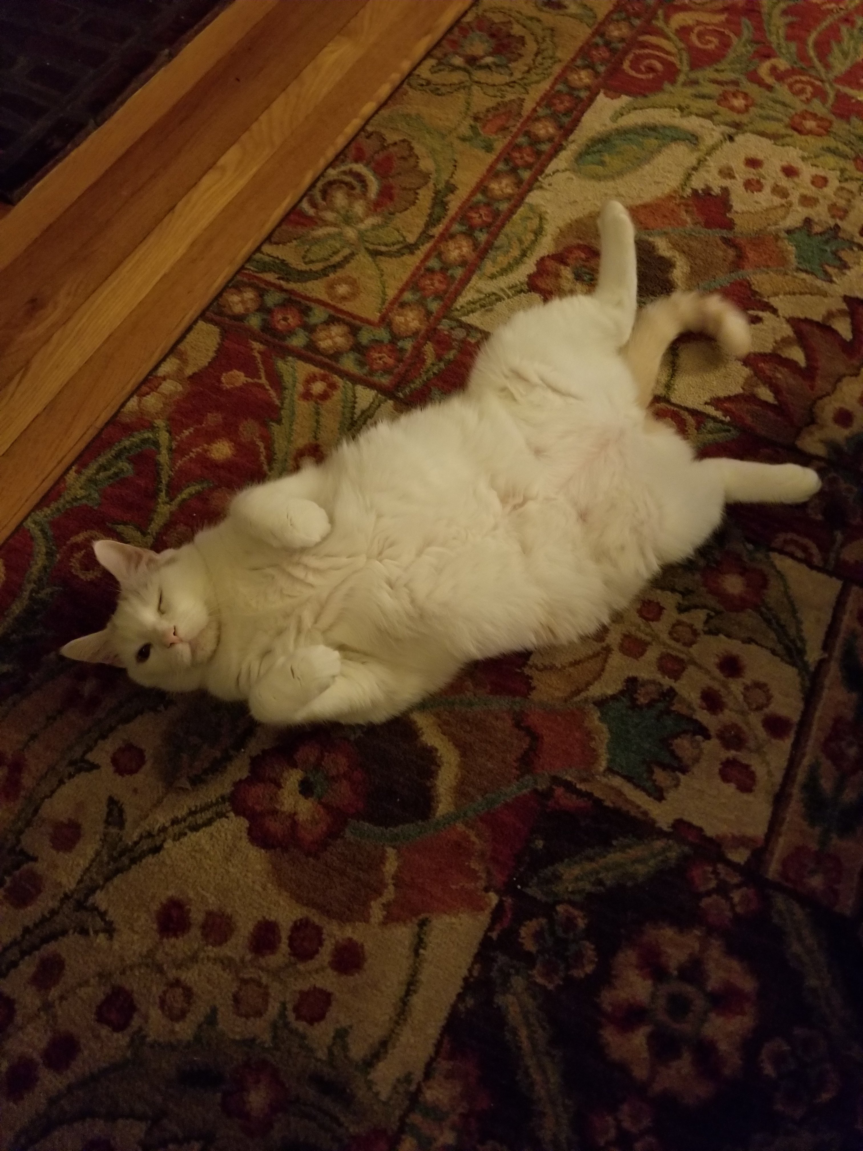 Second, a pic of our recently departed cat, Melman, who succumbed to feline diabetes in April. He loved laying in front of our fireplace on chilly winter nights: