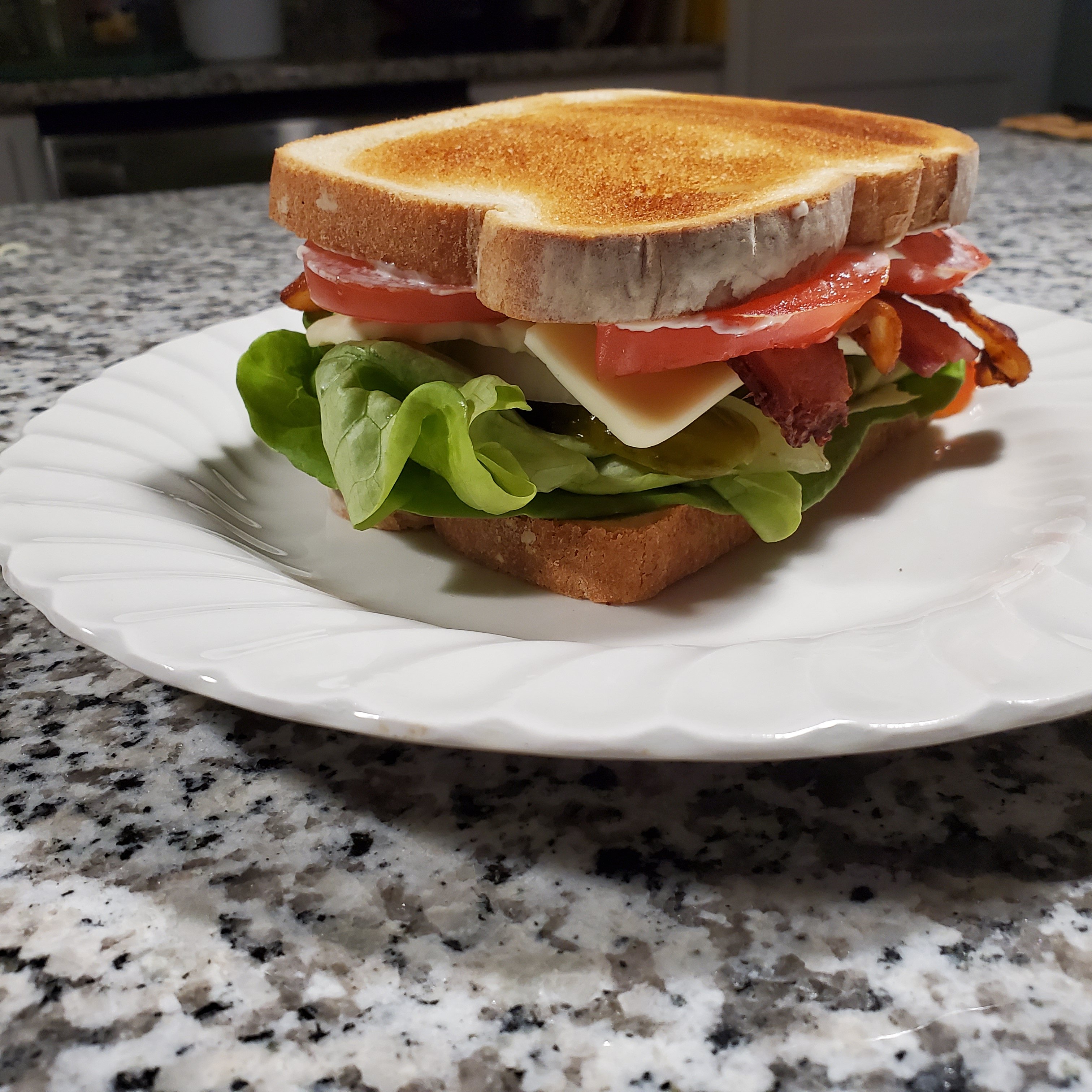 It lifts my spirits. BLTCOP...Bacon, Lettuce ,Tomato, Cheese, Onion and Pickle with mayonnaise on toasted potato bread. Good eating. Just like downtown.