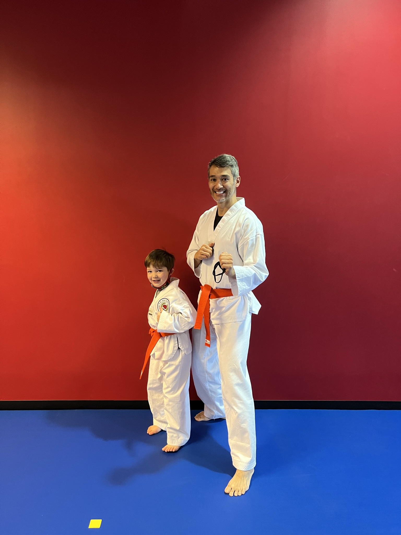 My son and I after testing for our orange belts. I coach his basketball team as well but I really enjoy spending time and taking taekwondo lessons with him.