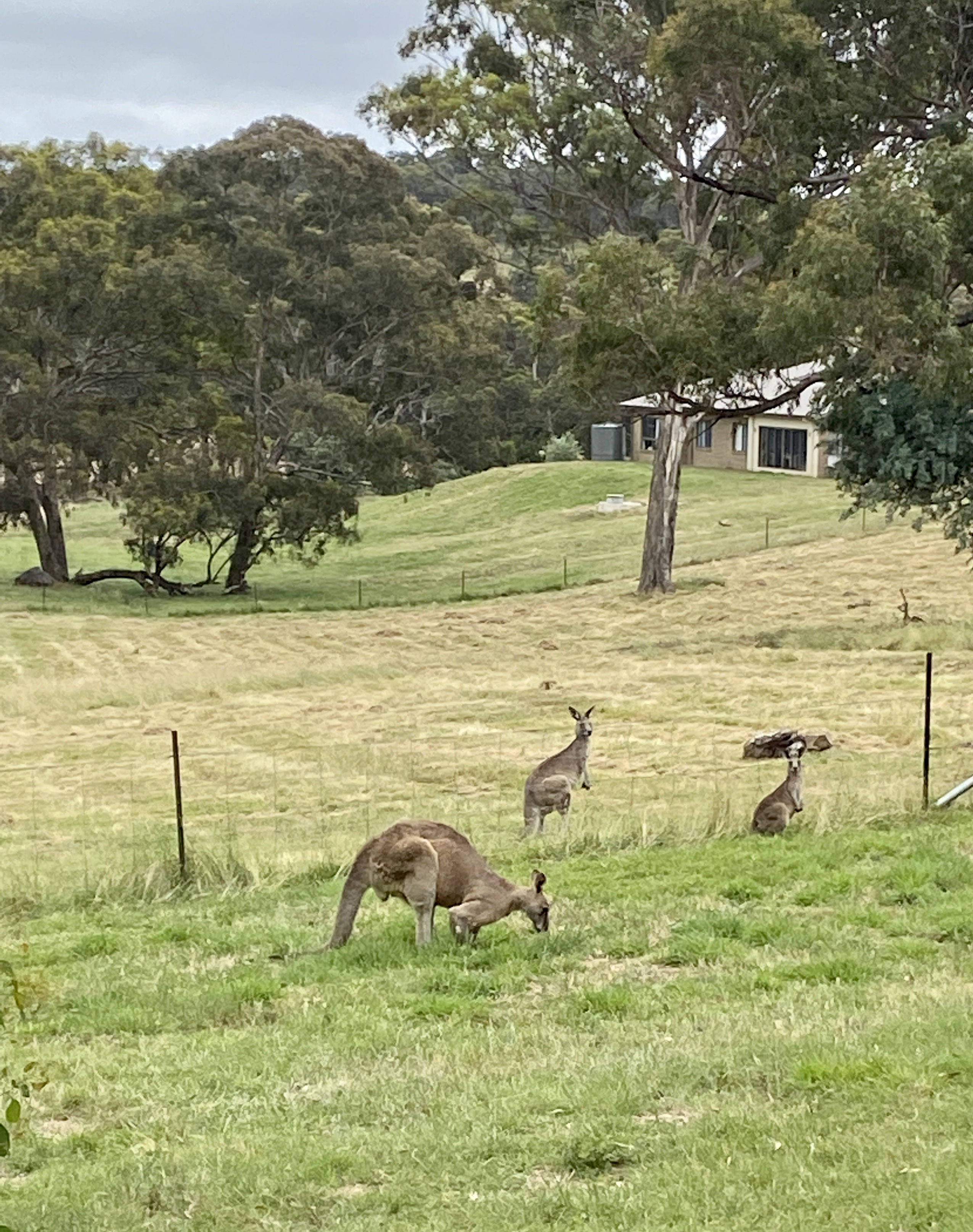 Morning walk outside a daughter's house this week: not only these guys to say hullo to (and lots more of their mob), but also parrots and wild ducks. And lots of fresh country air.