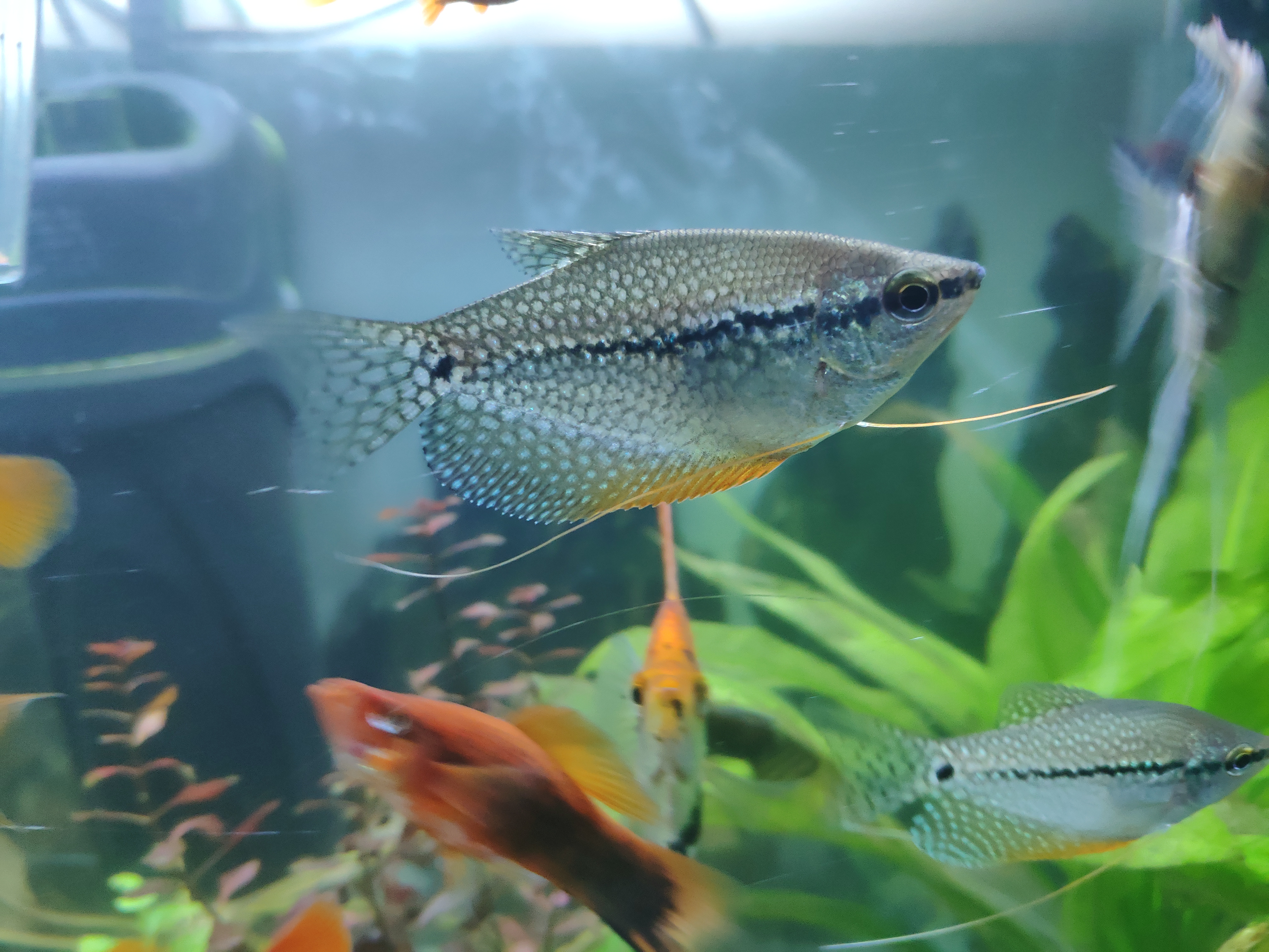 The first picture is of a Pearl Gourami in my aquarium. Quite hard to capture in a photo since they are very zippy fish. My photo doesn't do this creature justice but the pattern on this fish is simply mesmerizing, the way it plays with light is almost hypnotic. Mother nature is simply amazing.