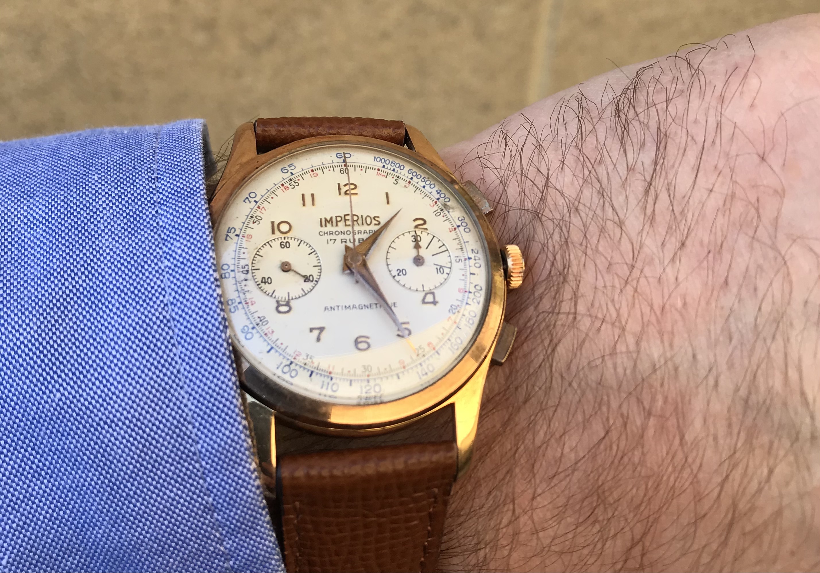 Recently gave a home to this lovely 1950s Imperios Chronograph, bought here on the Private Sales forum (thanks, @Rochete!). She’s been serviced and is happily ticking away (Valjoux 92 inside).