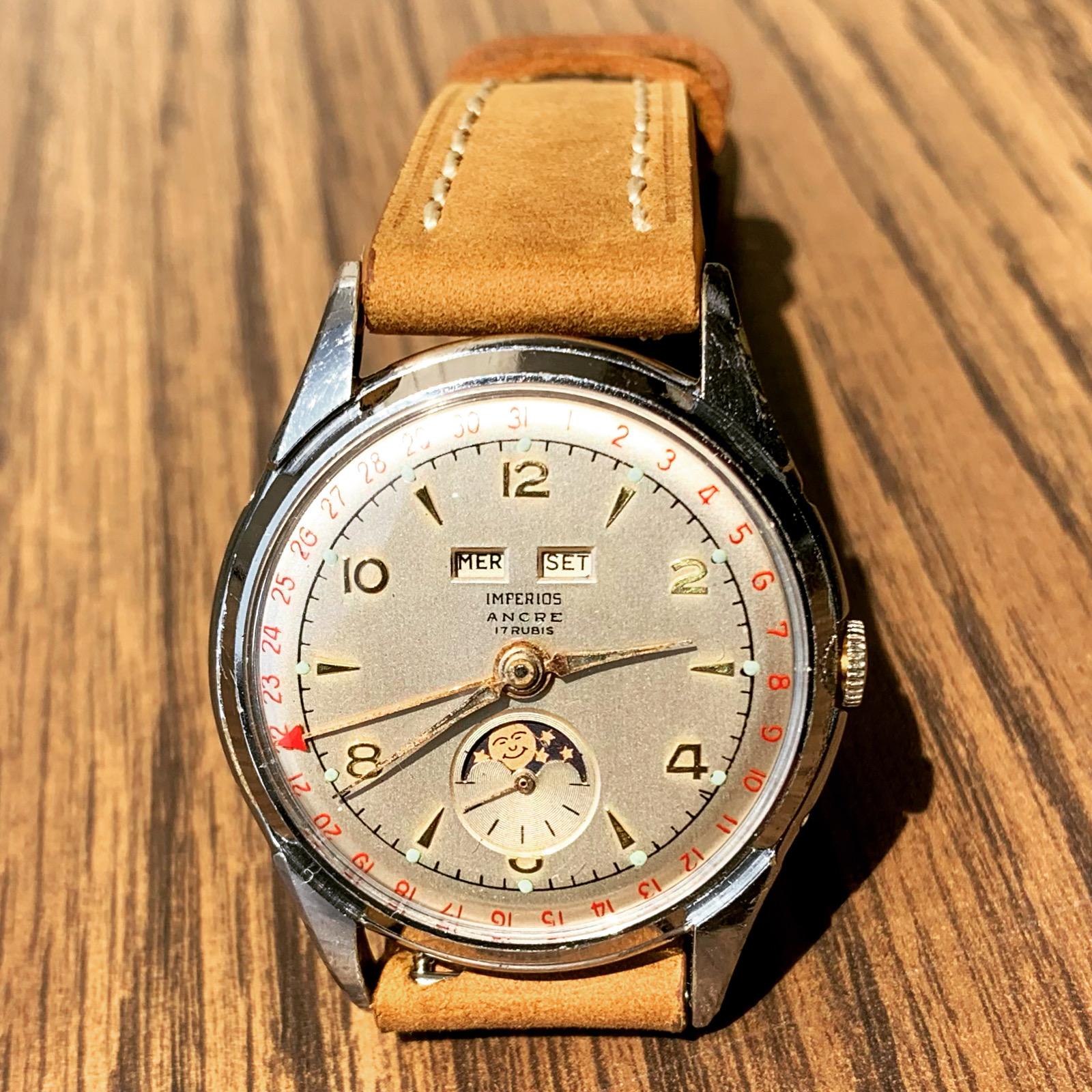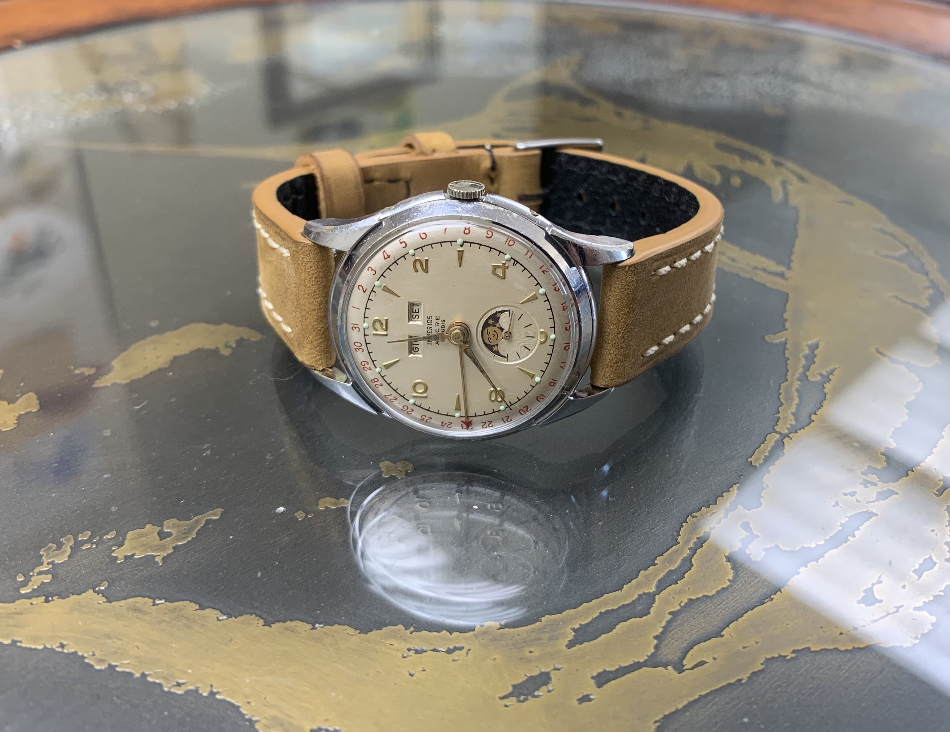 Info online is scarce. Does anyone have any info on this reference? I’m guessing early 1950s? Dial looks repainted (lack of “swiss…” at 6, other imperfections) but it’s very clean and looks the part, in my opinion. I also love the smiling moon. Pics don’t do it much justice, but lugs still hold a good bevel.