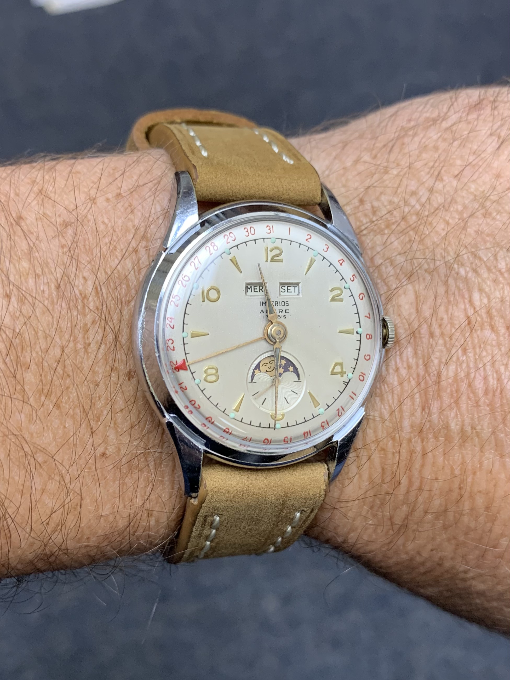 ·Hello all. I just picked up what I think is a very cool little triple date moonphase. I had my watchmaker service it and install a new crystal. I put it on a new strapsco band and am enjoying wearing it.