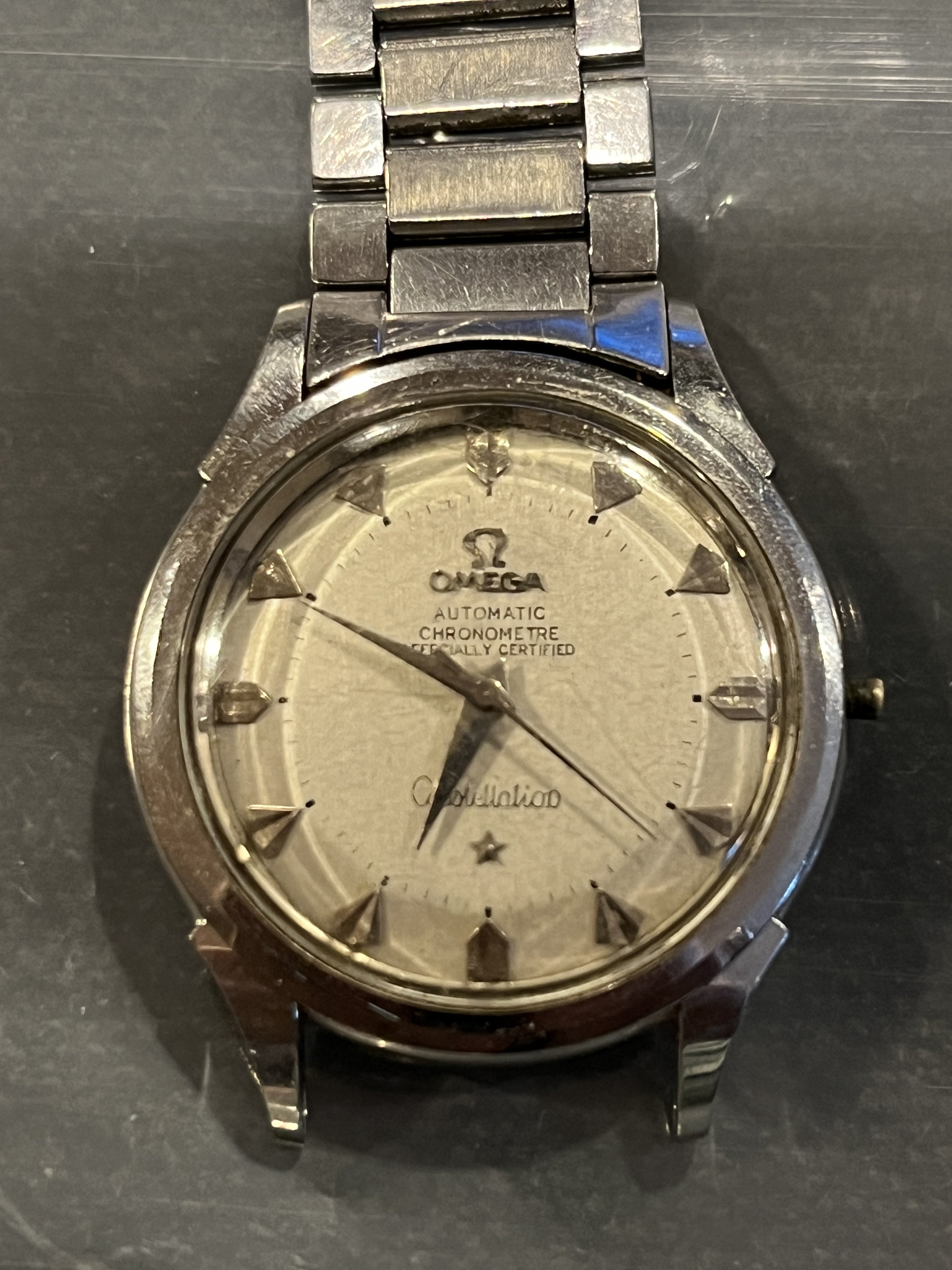 This is one my great-grandfathers' pie pan Constellations that ended up in my possession and I could use the community's help in determining value and to solicit advice on what I should do with it. After being unable to open the case back when I received it years ago, I cast it aside and just assumed the whole thing was a fake; the dial writing and messed up Omega logo led me to believe there was not much value in the watch (there still might not be much value).