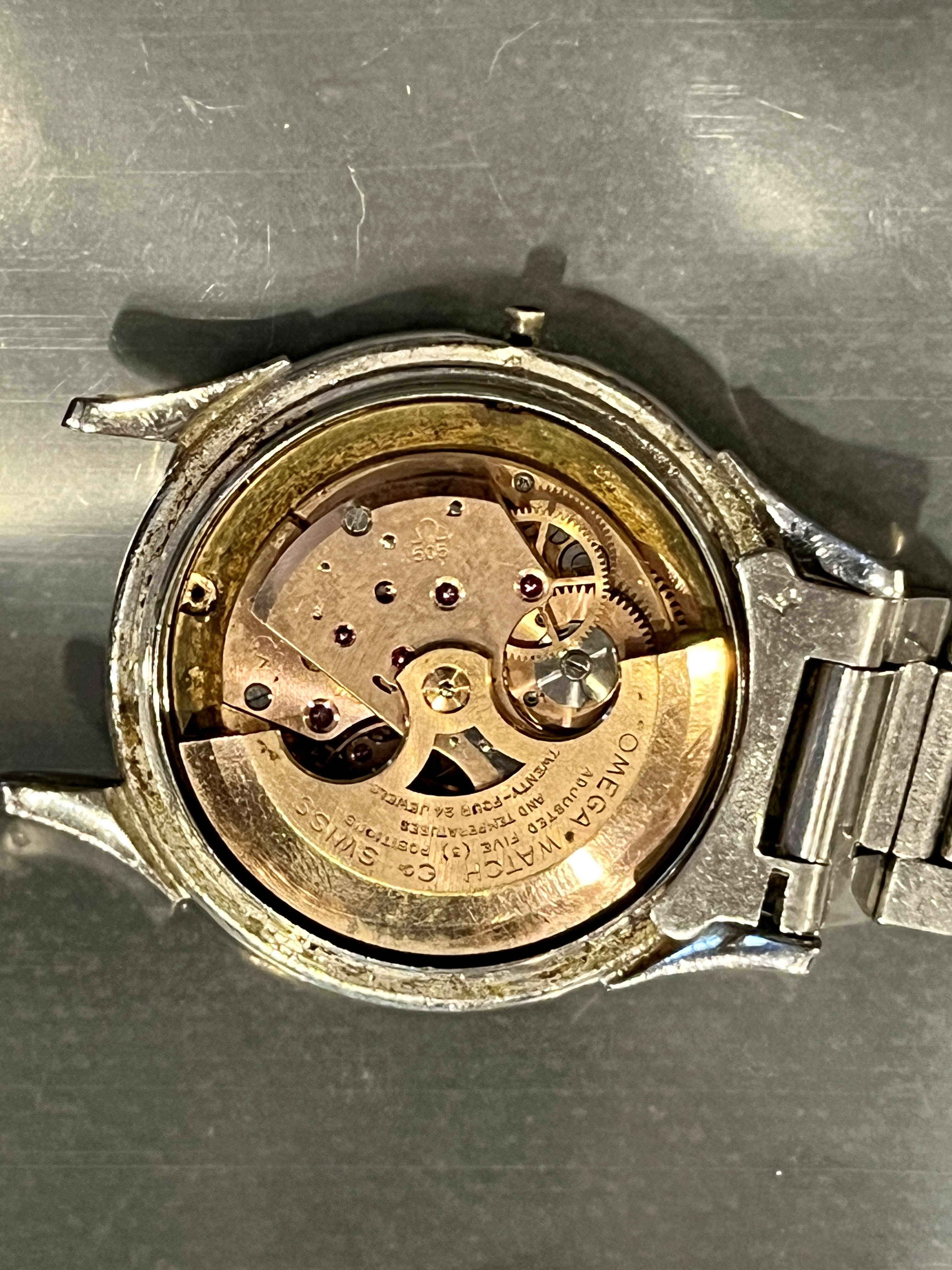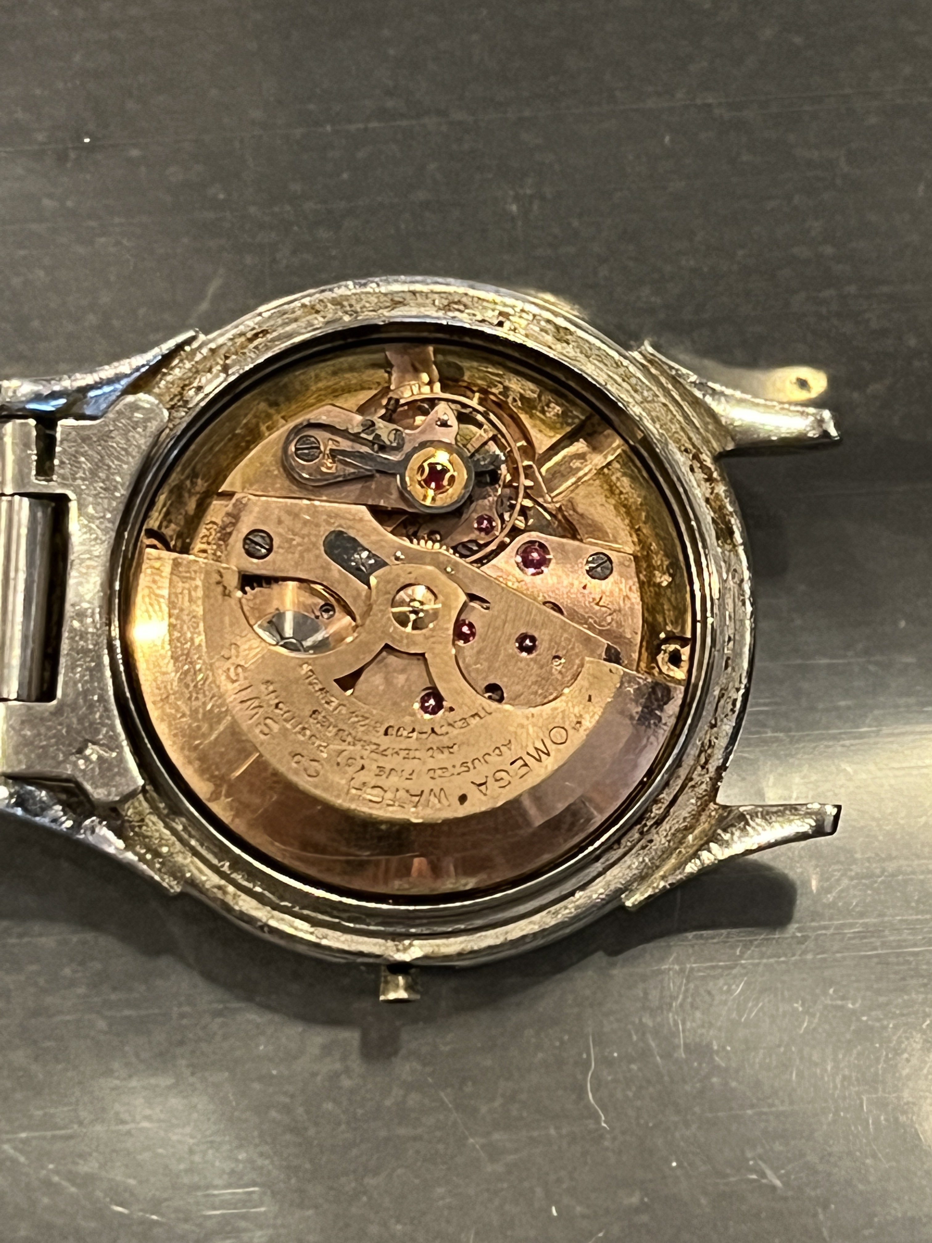 Fast forward to today, I had my watchmaker open the watch and to my surprise there was a beaten up caliber 505 under the hood. The crown is missing, there are deep scratches on the casebook, and the case, inside and out, is very dirty. Further, the rotor spins and appears to wind the mainspring and the balance wheel moves freely, but the gear train is all seized up. It needs a lot of work to bring it back to working order and I don't feel like shipping it off to Omega to get fixed, which the watchmaker said was the only option for repair, due to the extensive damage. Is there any value in the watch being sold "as-is"?