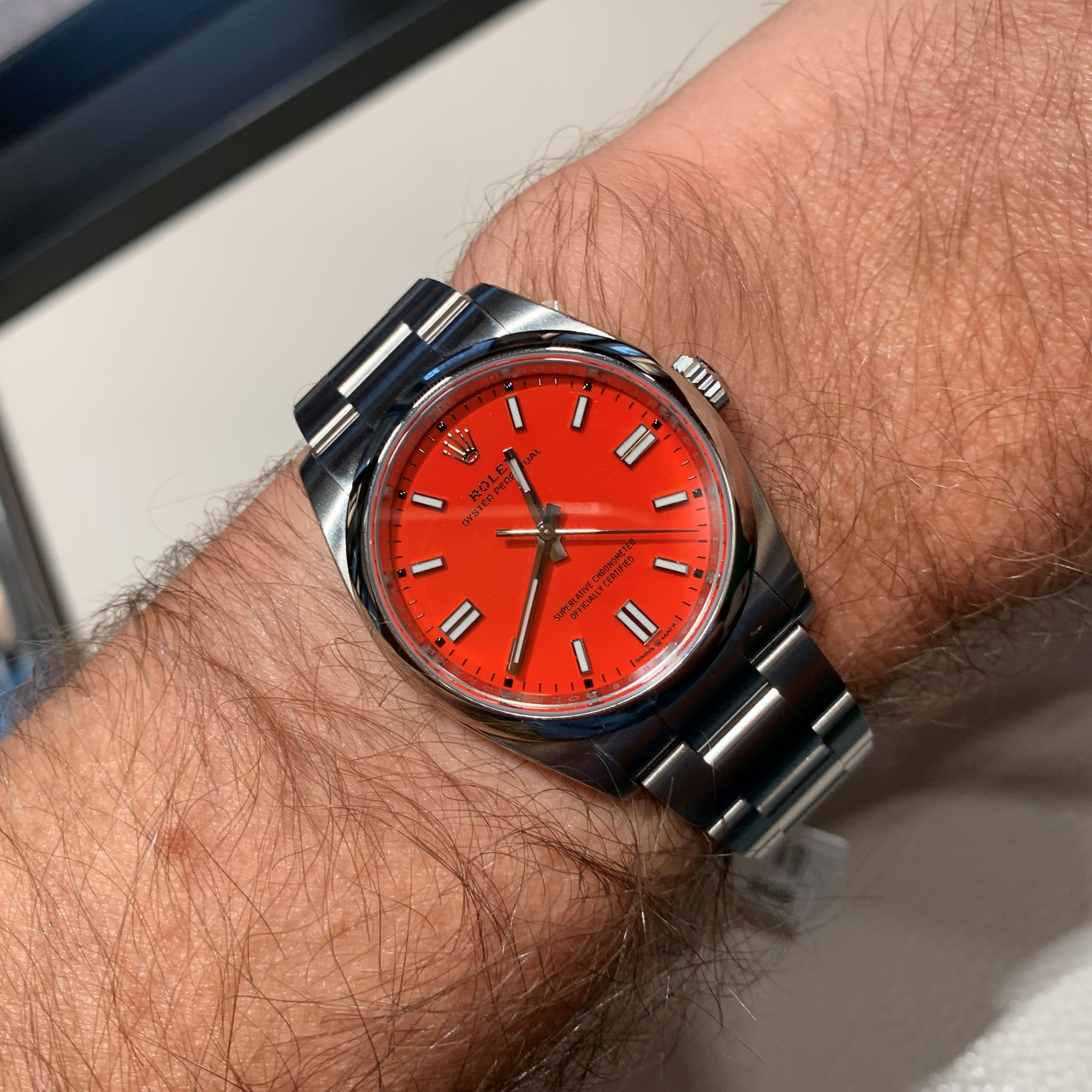 I did not bother to ask for a 41mm OP ... this felt correct, and very very nice on my relatively large wrist. Whilst these bright colors all look strange on the website, they look different in the flesh (and not what one would expect from the website). This surprisingly was my favourite of the bright-color-OPs in-hand. Its fun, and I could seriously imagine pairing it out with all manner of straps.