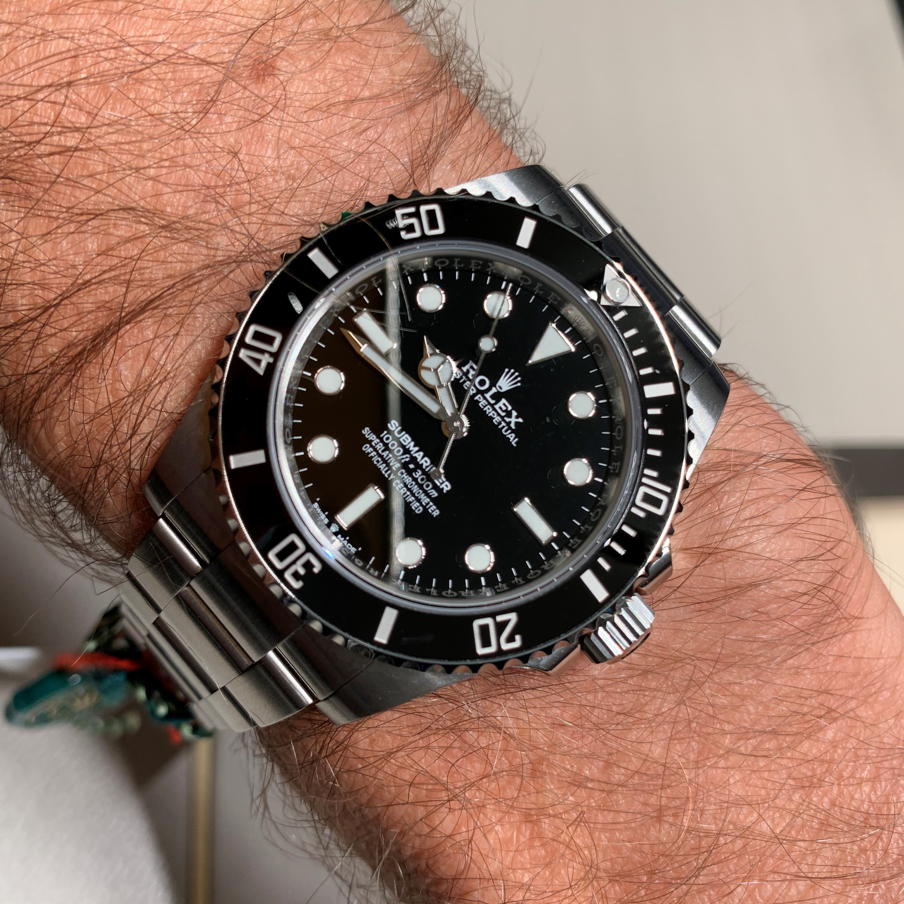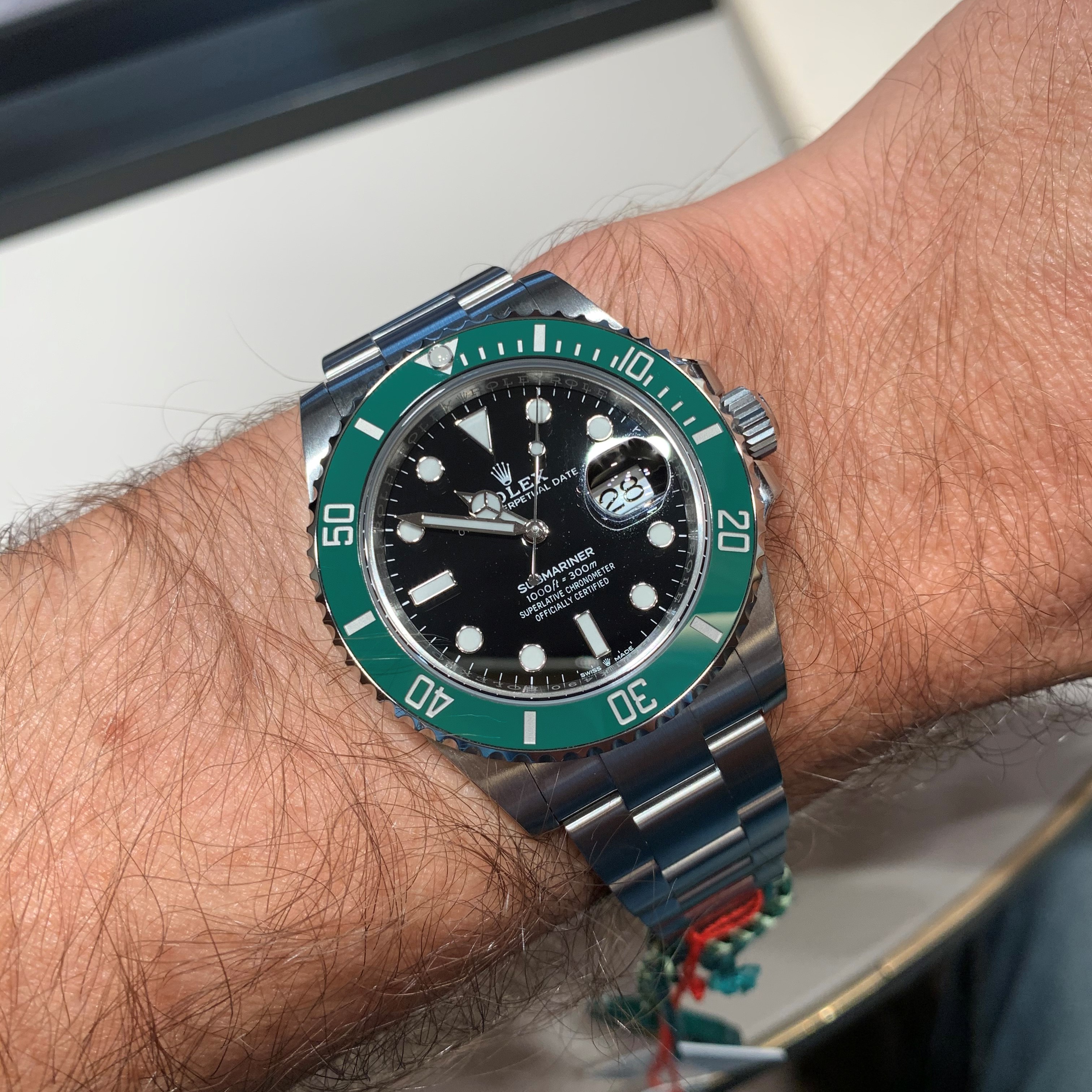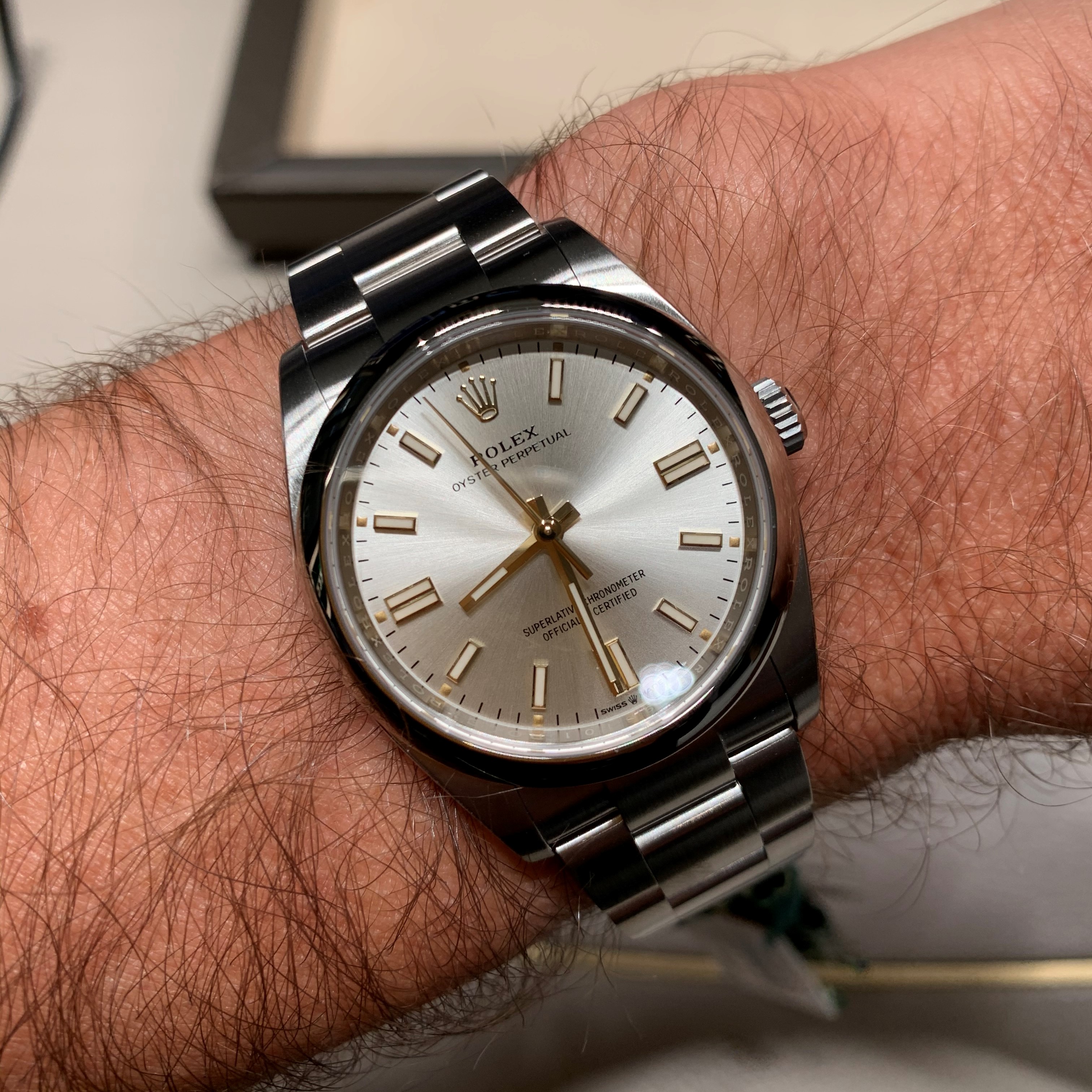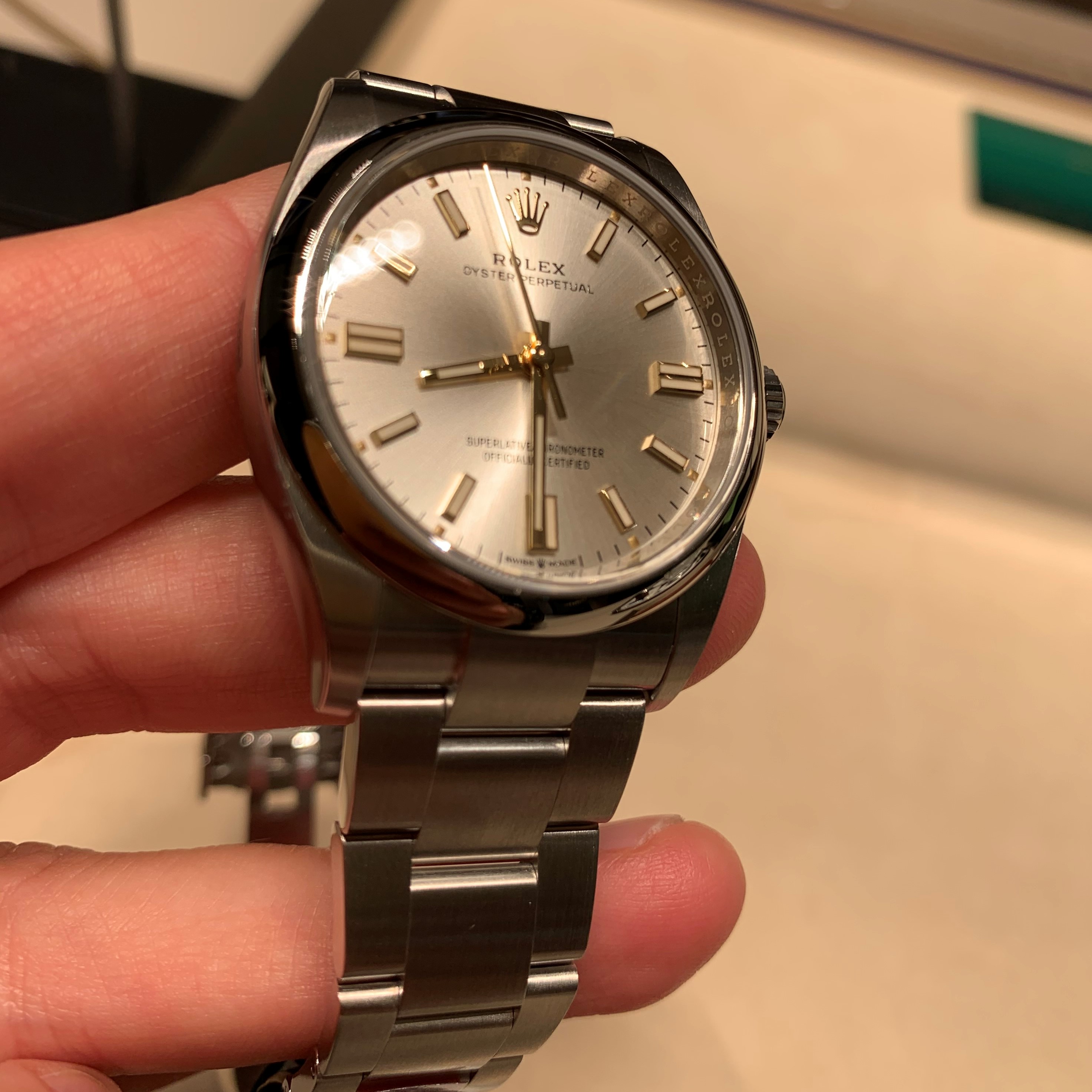 I managed to handle a green dial (smaller, I forget which size) OP, but as with the new 'Kermit' Sub bezel (and all the colored ceramic bezels IMHO), the green is just wrong and extremely underwhelming. In the display they had the yellow, the pink and the light blue dialed OPs in various sizes ... none did anything for me, although I wouldn't mind a second glance at the yellow.
