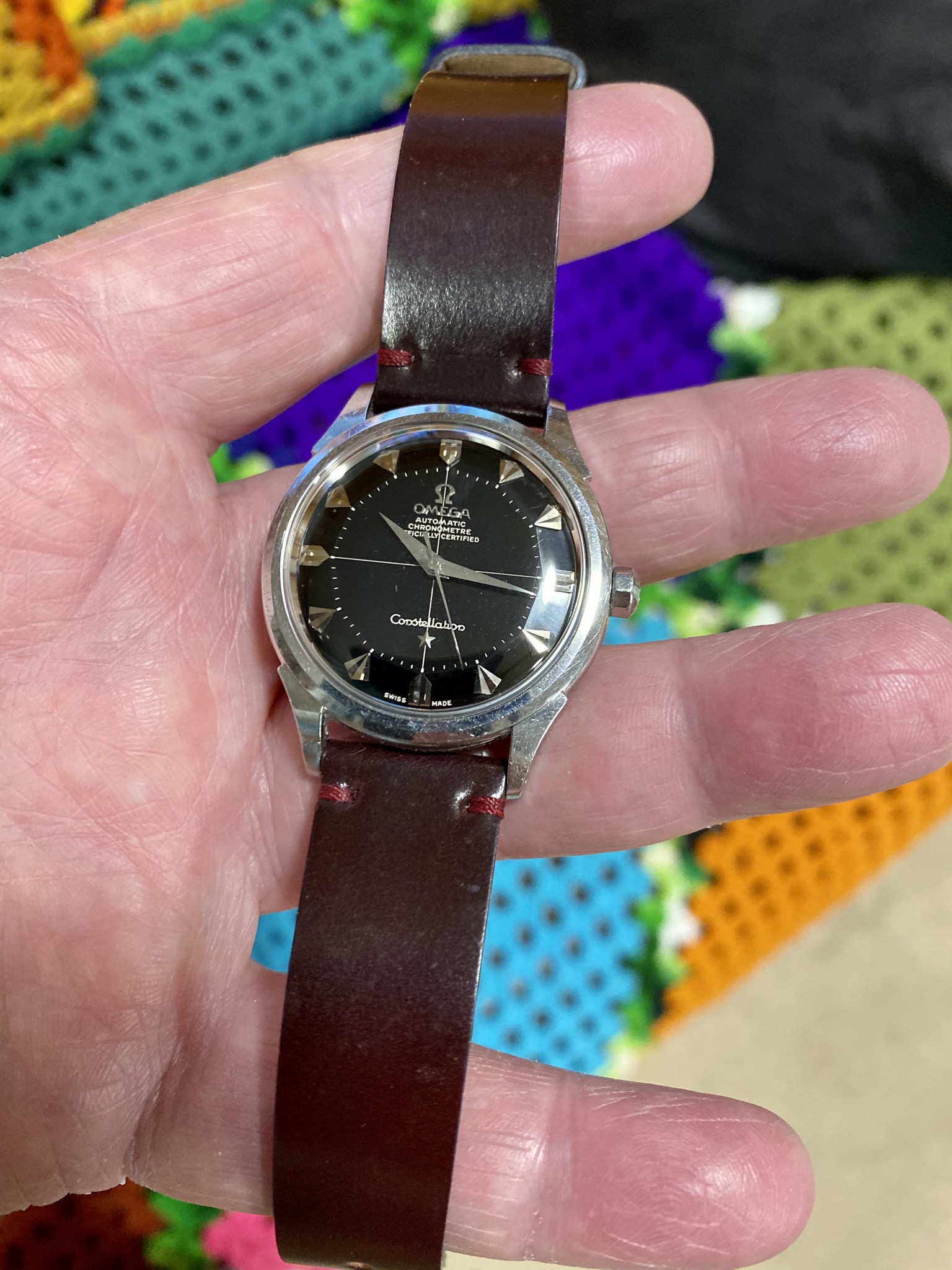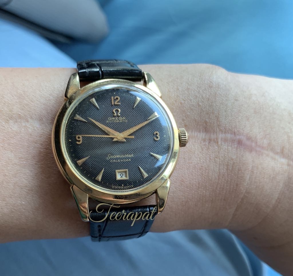 ·Not the greatest quality photos in the world, but I've just secured this early Seamaster Calendar at what I think is a fine price for what it is. Black dial, quadrant Arabic markers, cross-hairs, and it's got textured guilloche! I think that beats my black-date-black-dial Connie in levels of coolness and degrees of separation from the typical flat silver dial. Not sure if it's RGP or gold capped, but I'm not fussy either way; it is what it is. The crown may need to be replaced if it has no logo but a quick search shows they're readily available. The band is going ASAP.