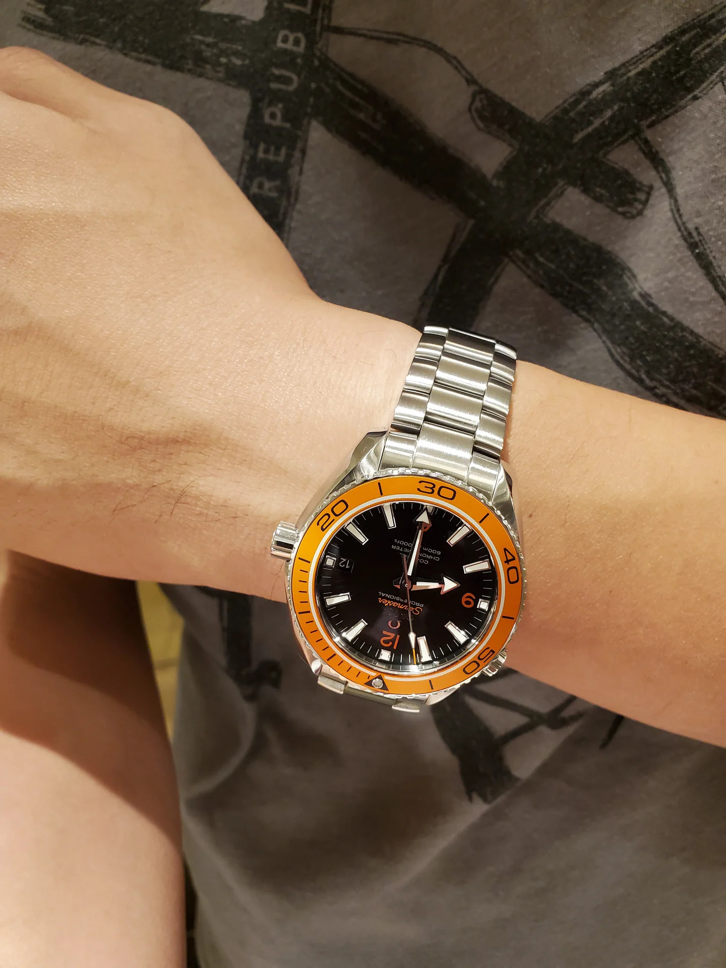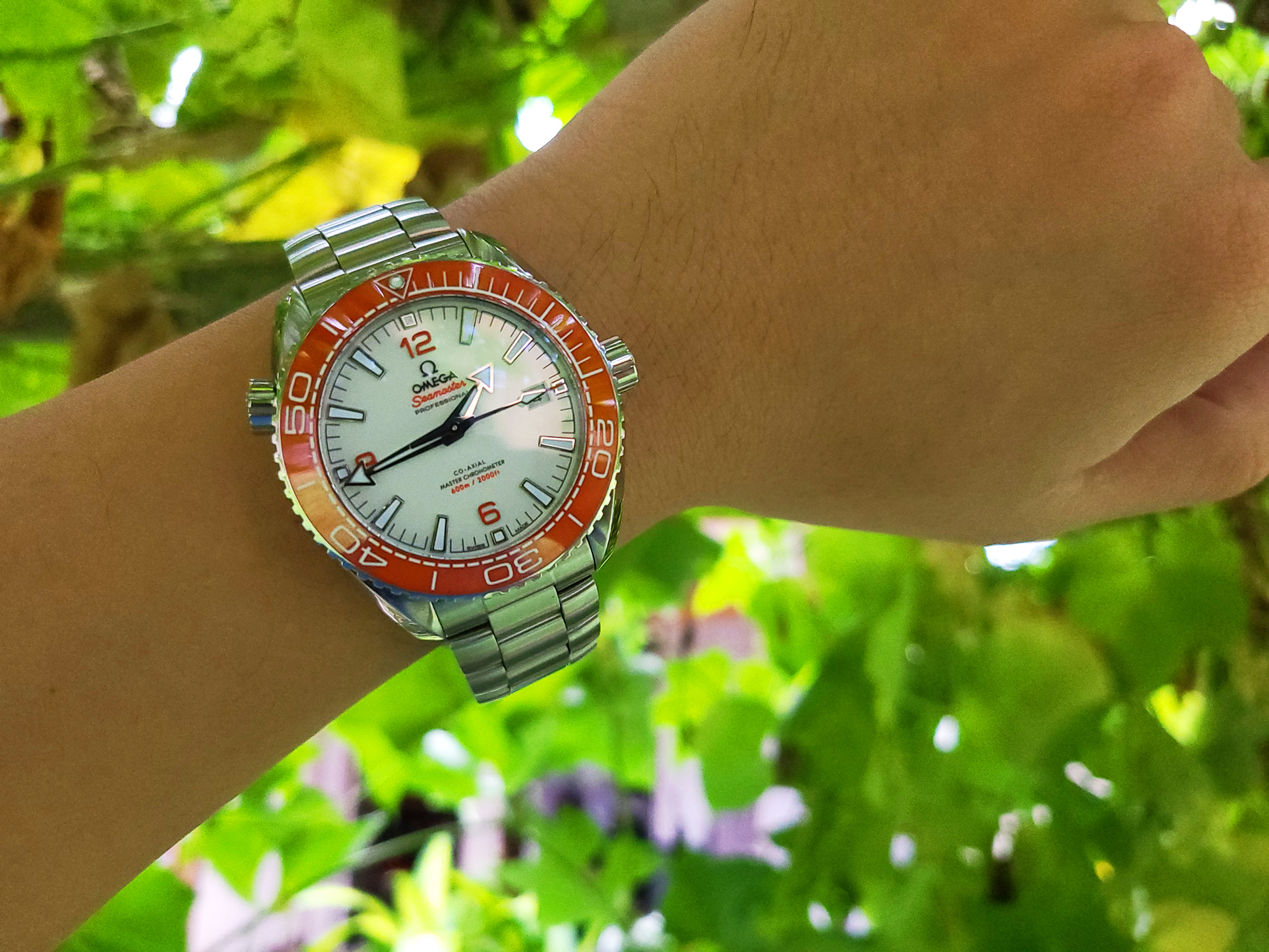 The orange ceramic isn't as bright and "LOOK AT ME!" as the aluminum orange bezel was. Pretty pale in comparison, actually, but looks good in its own unique way. The white dial seems girly on the wrist for some reason. A black matte dial would have made this watch a knockout.