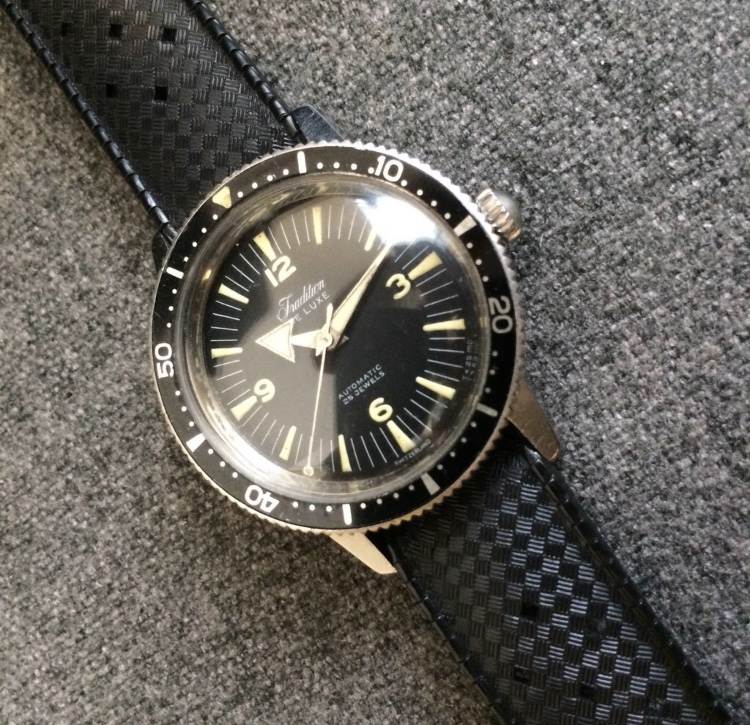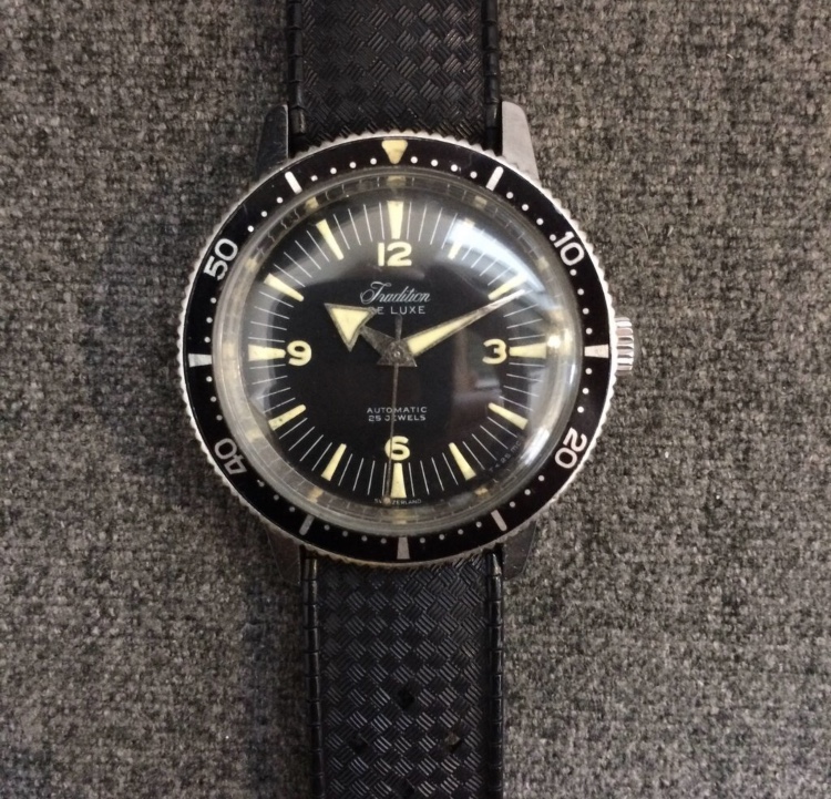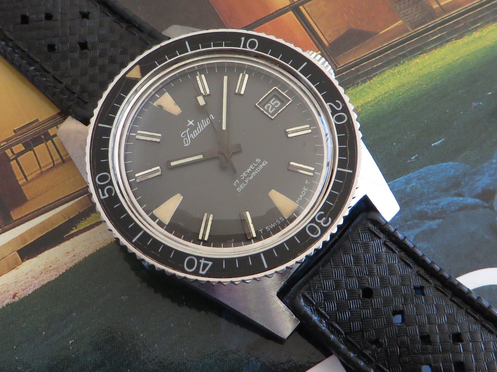 I have been familiar with the Tradition brand that had been marketed by Sears department stores (I understand it was one of their upper tier watches) and have mostly avoided them simply becuase I didn’t find many of them esthetically pleasing (lots of early 70’s stick hand day/date models). I know their chronographs fetch money as there was some possible Heuer connection (not really sure of the validity of that) but it is known that Sears was contracting these watches to OEM suppliers and it can be anyone’s guess who made them.