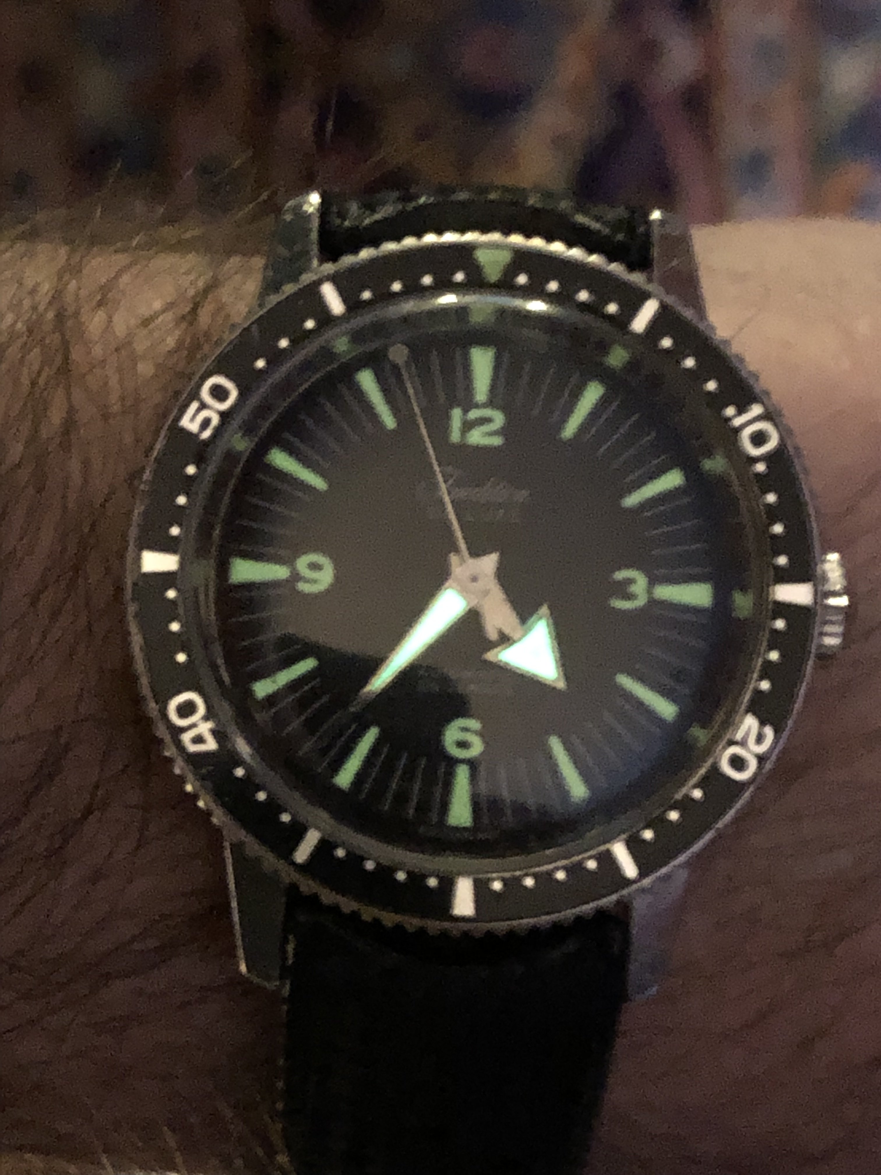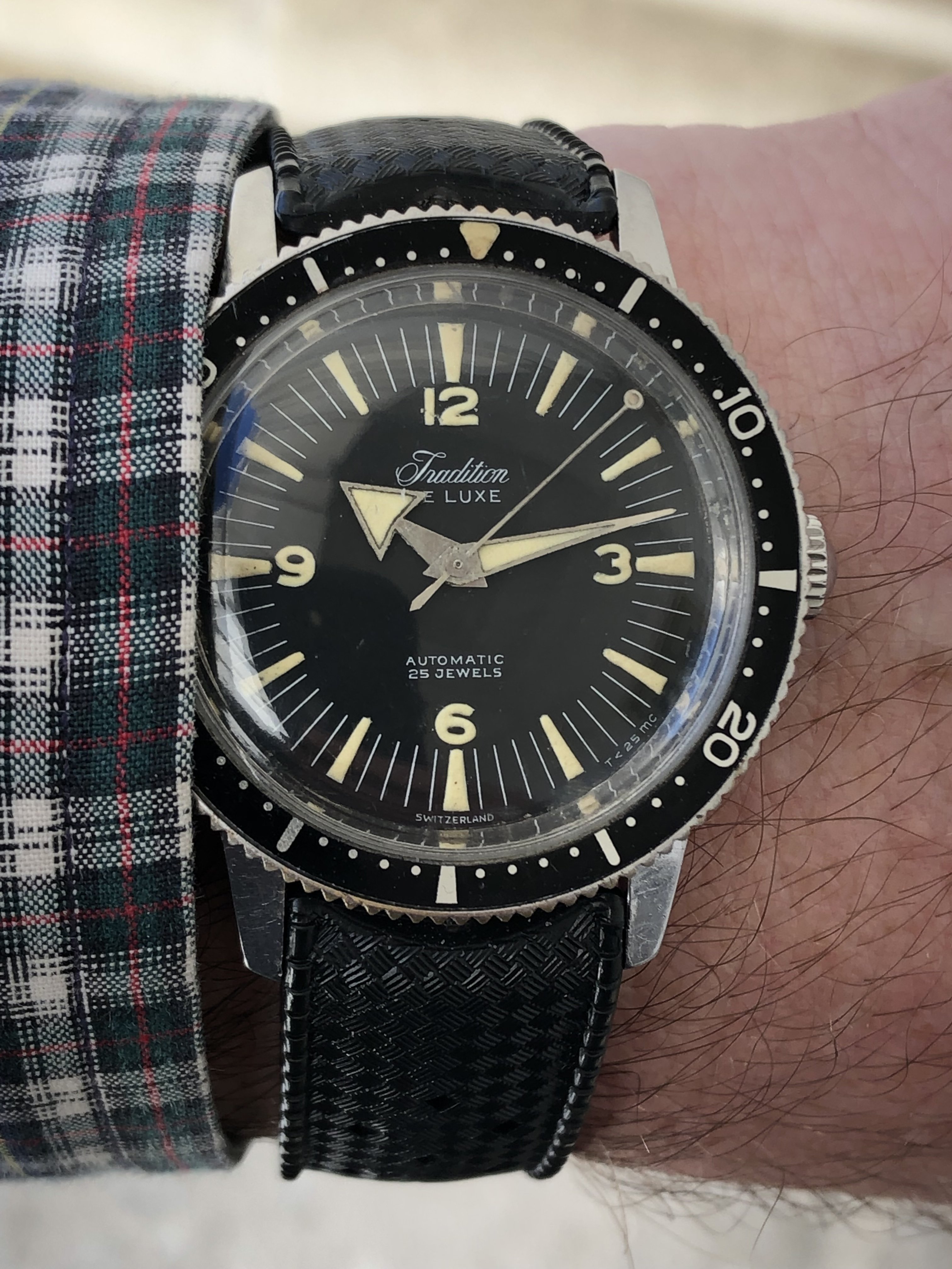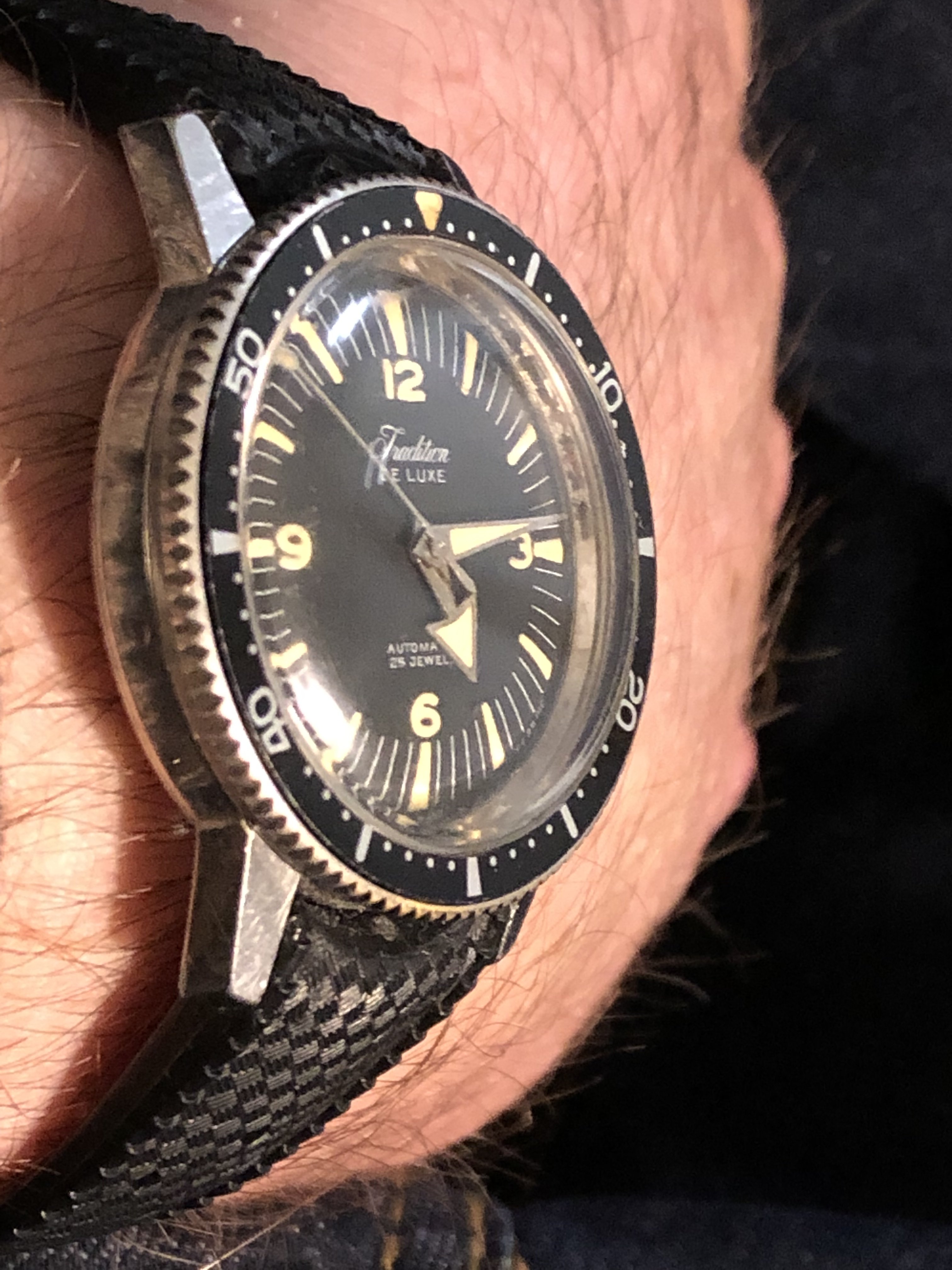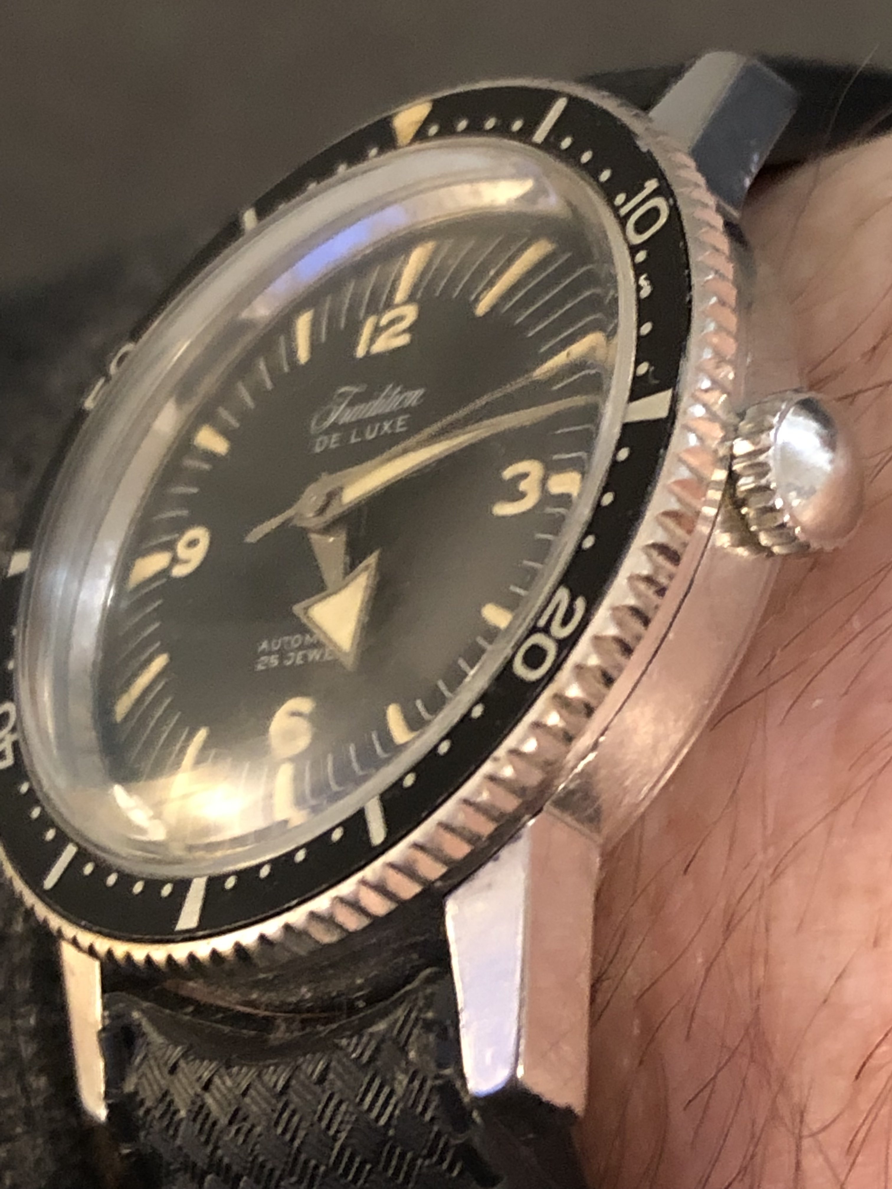 ·So I have been on a vintage diver kick- not the high line stuff, but the fun cheap divers from the 60’s. My prerequisites have been a Swiss movement of 15 jewels or more, preferably stainless case or if plated- it must be perfect, near perfect original bezel (a few scuffs or nicks is fine but no faded out wabi-Sabi for me) perfect dial, stunning lume, and it must be “running”.