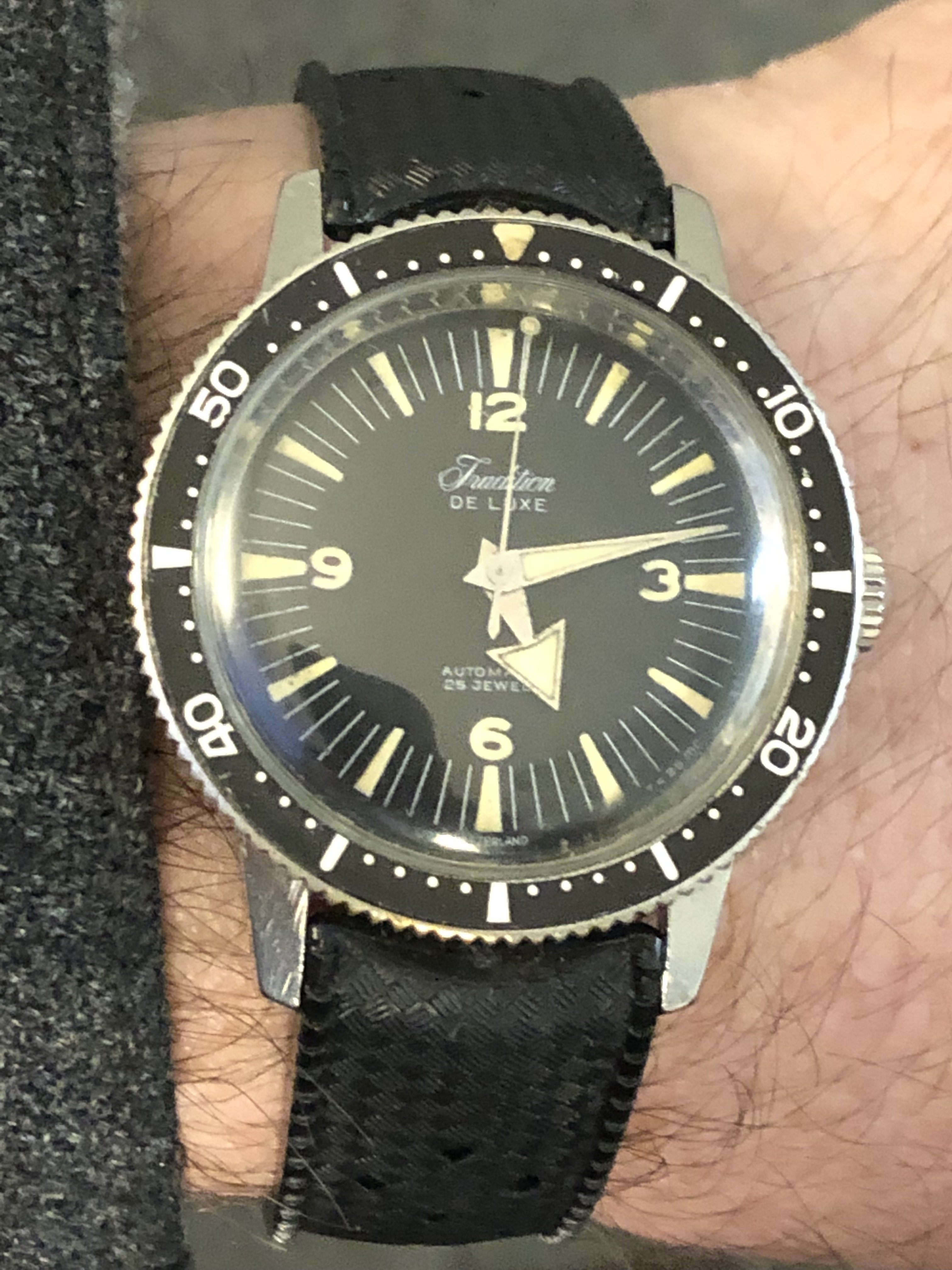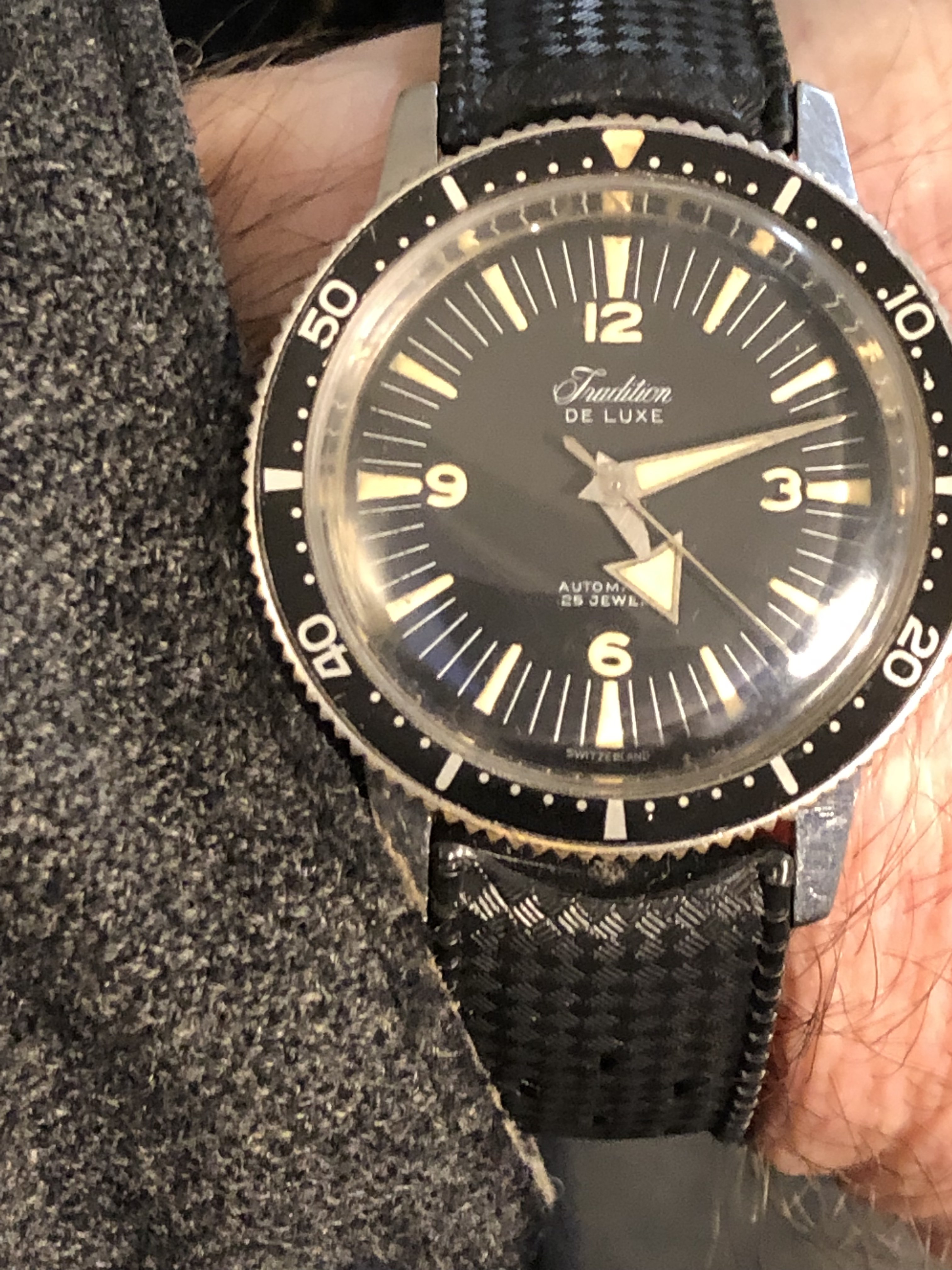 stainless case, AS movement (not sure which one) and the most unusual dial and hand combo I had seen on a Tradition watch- almost like it’s a wannabe early SM300. The price was high for these watches but not rediculous, so I just said screw it and bought it. The only other example I found like it online was this exact watch from a FS posting from WUS from 2018- it had a little less wear on it then and better pictures.