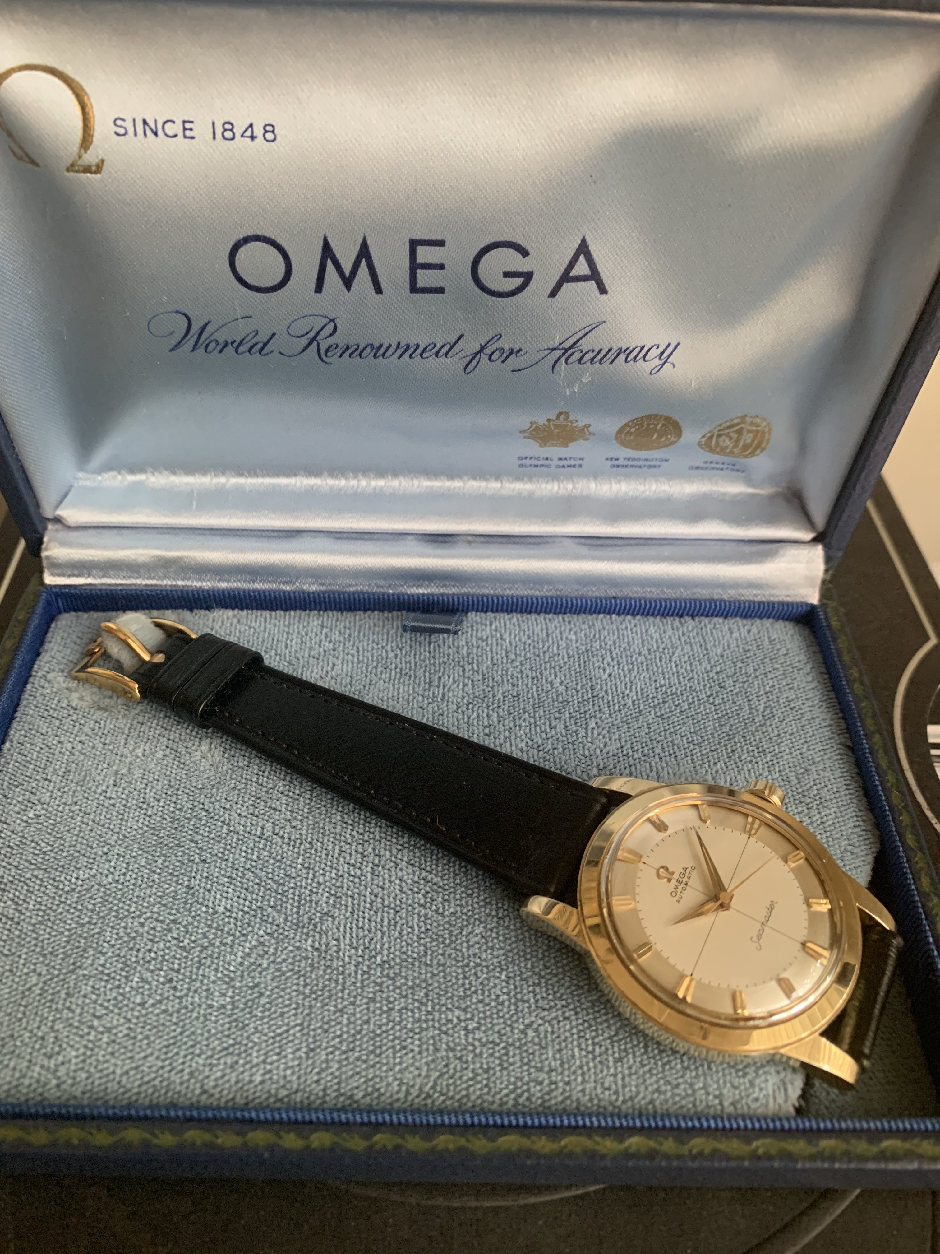 Incredible FULL PACKAGE 1950s solid gold Omega Seamaster
