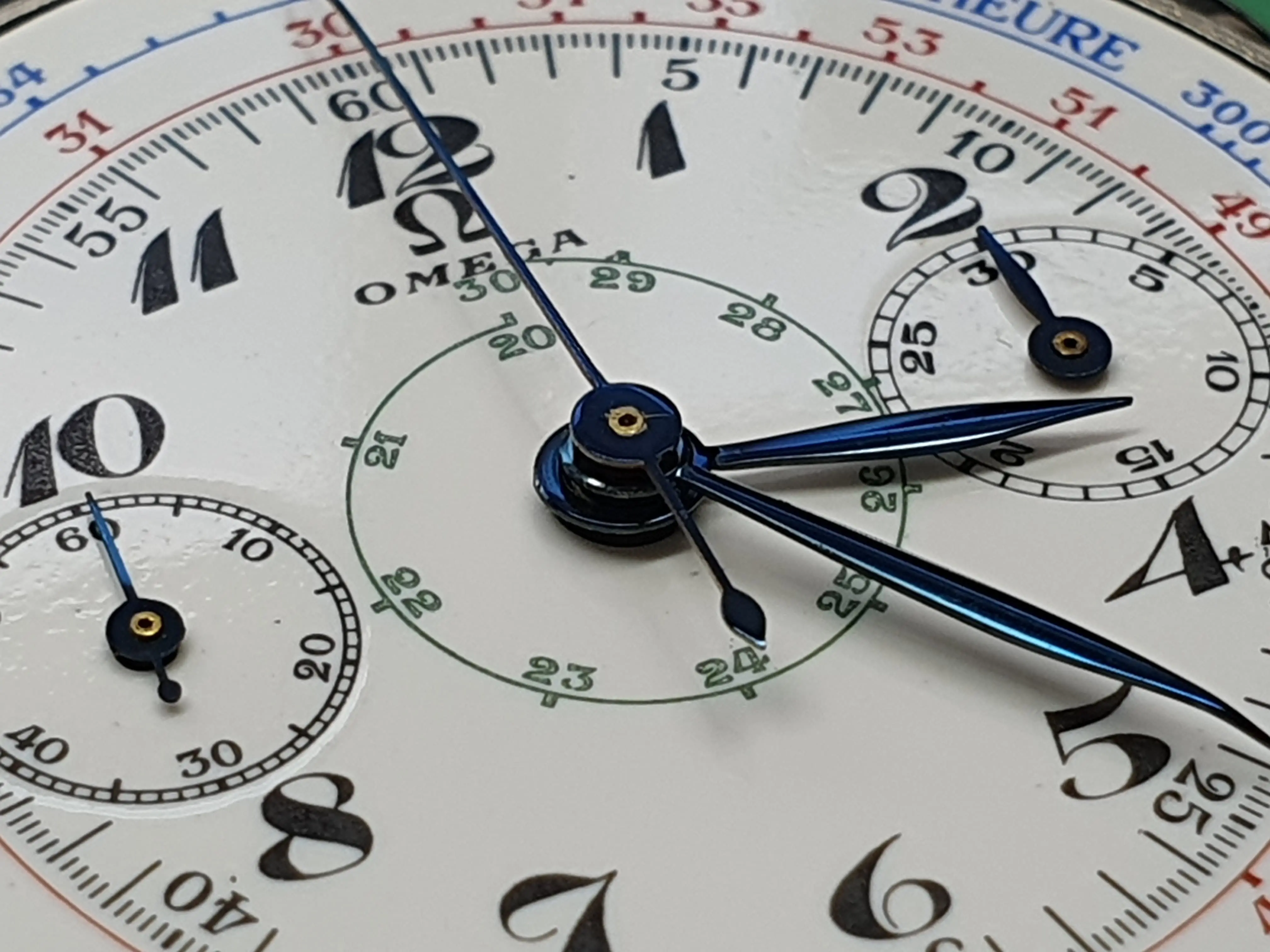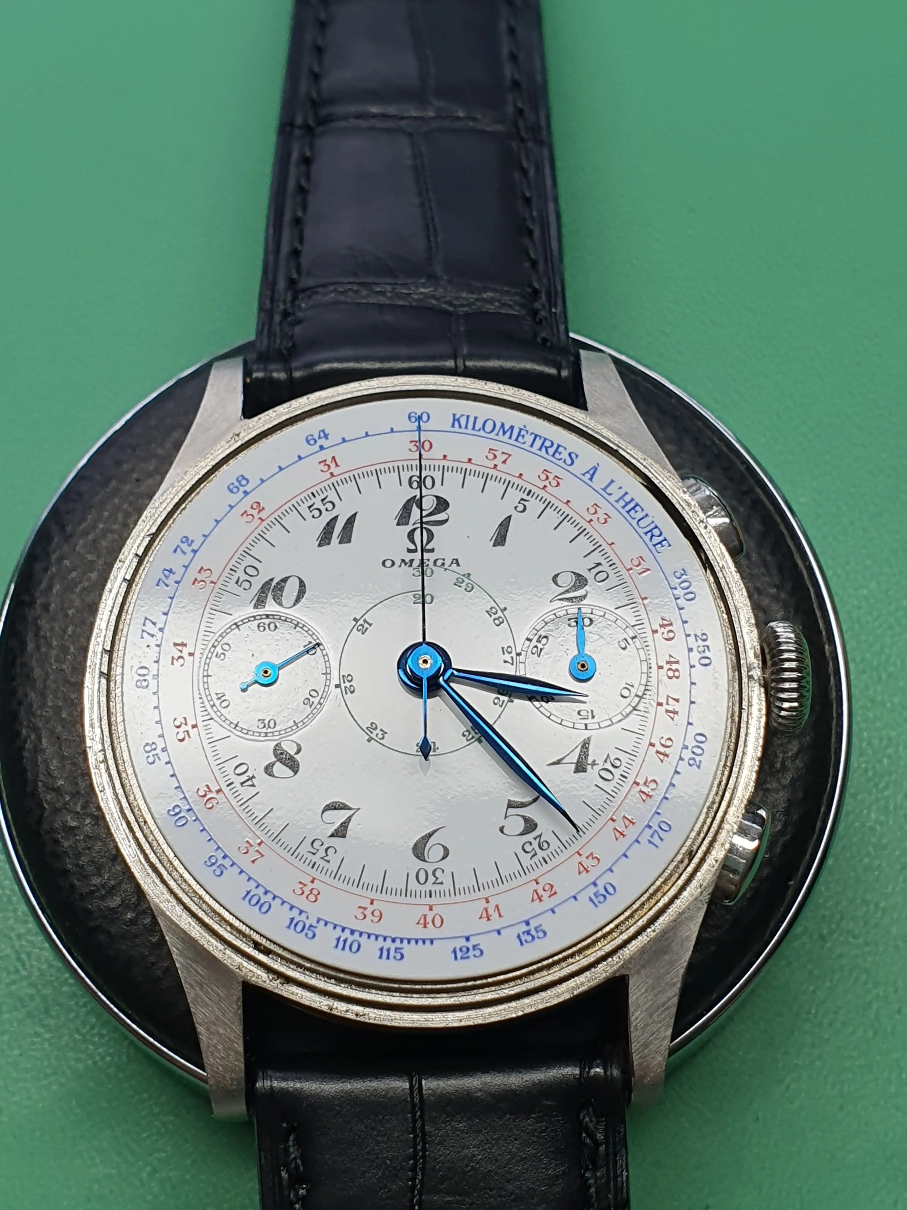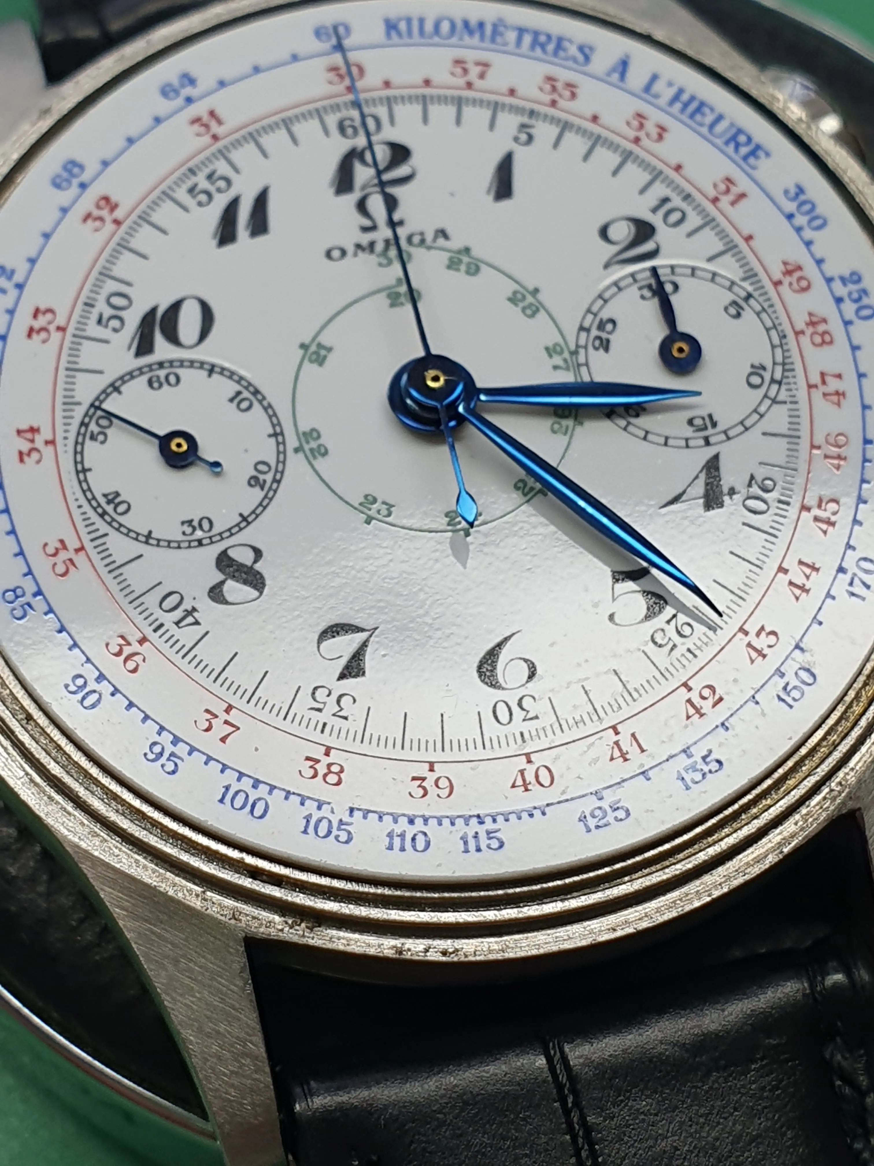 The first is an Omega 33.3 with an enamel, multi scale dial and a twin-pusher chronograph arrangement (most enamel dials I have found have been mono-pushers). The second is a double stamped Tissot/Omega with a Ch15 movement (non shock-protected) and an interesting Scarab lug case. It is clear to me, and the watchmaker who opened them for me, that the cases have been refinished to a high level. Neither of us are knowledgeable enough to know whether the dials on both watches are original. The condition on both of them is excellent, but perhaps 'too good', enough to raise the question. I was able to track down the following information, via an AD in Cape Town (where I live), who contacted a colleague at Omega in Switzerland who looked up the serial of the Omega and replied with this: