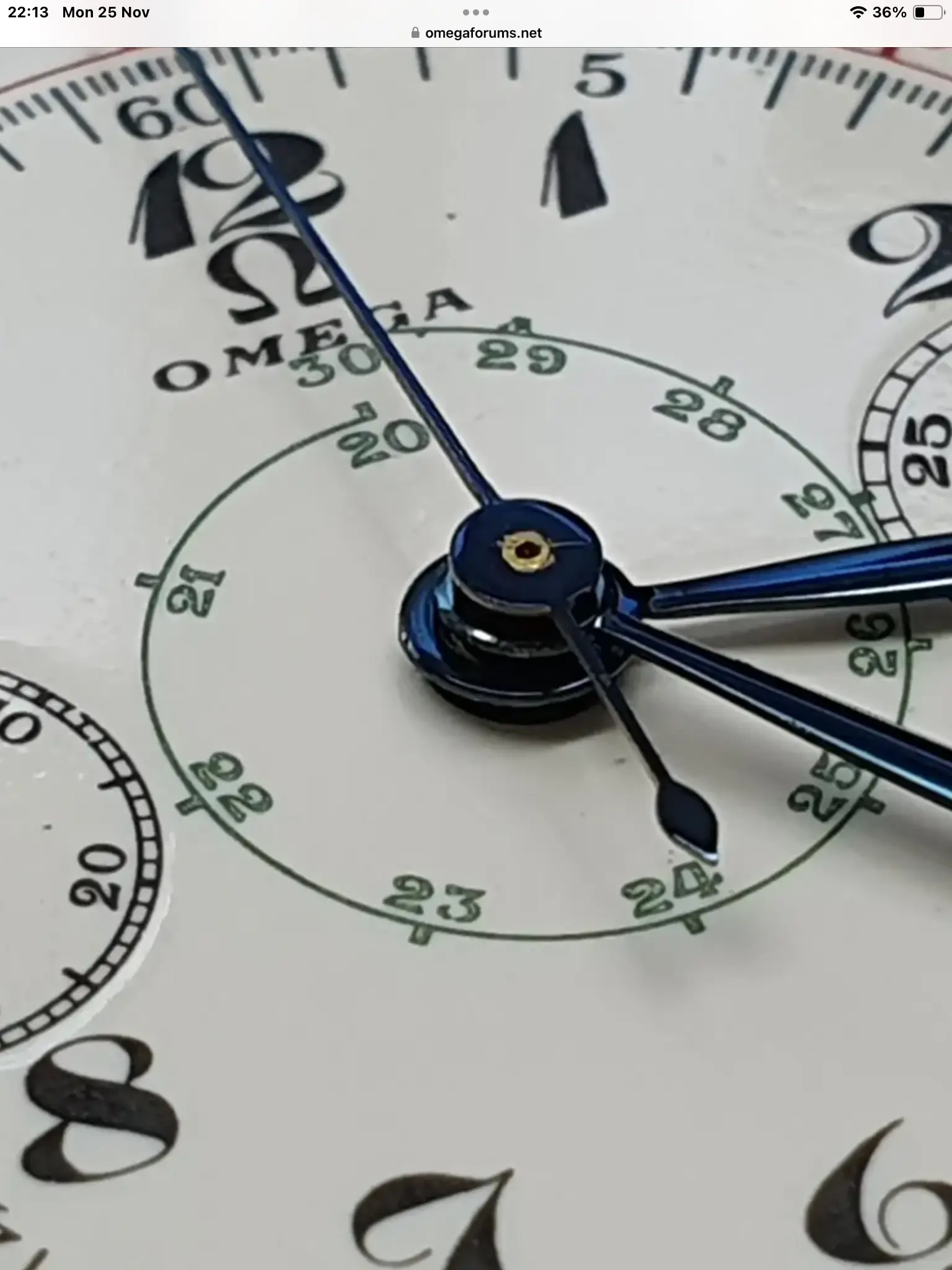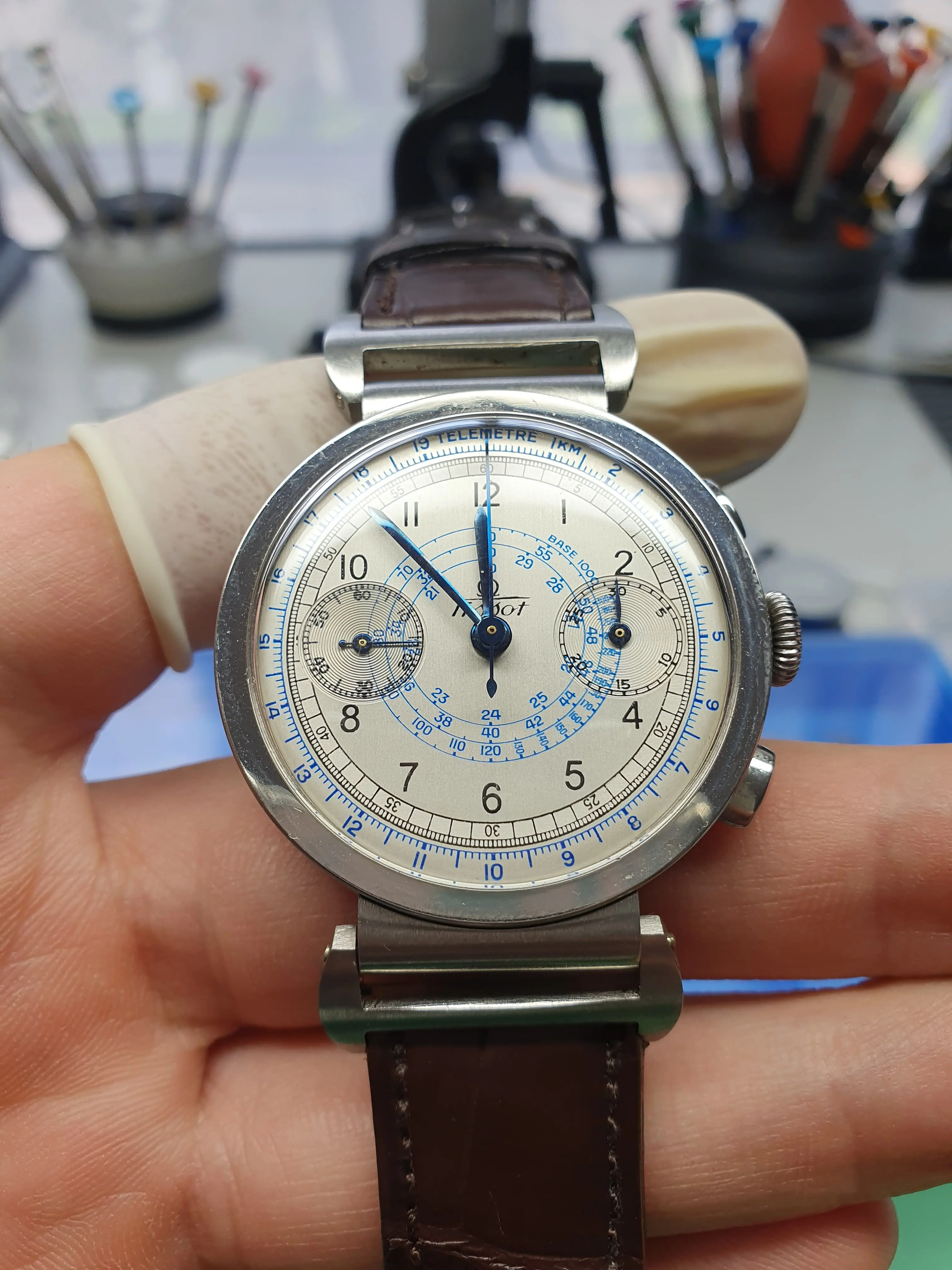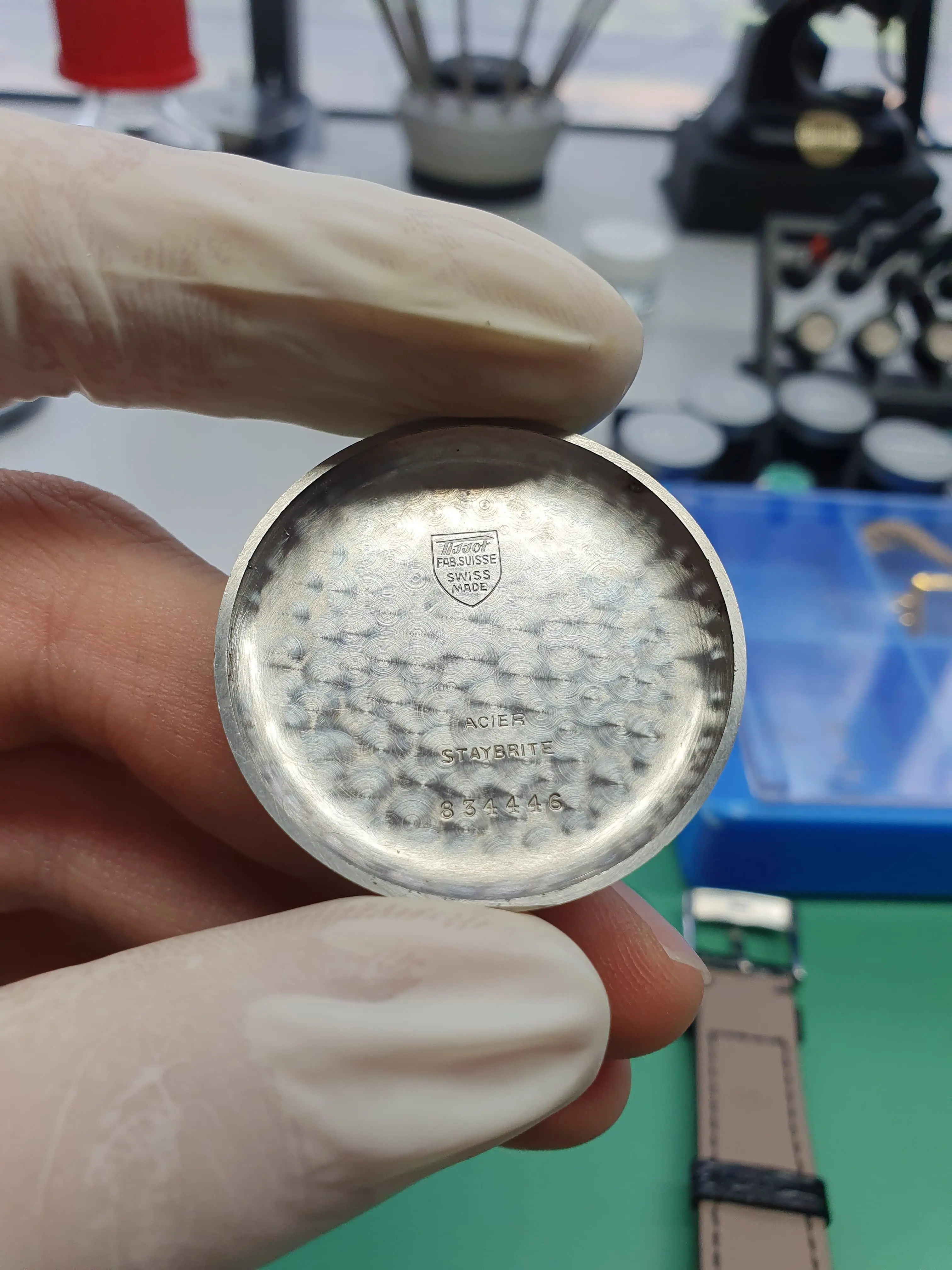 The first is an Omega 33.3 with an enamel, multi scale dial and a twin-pusher chronograph arrangement (most enamel dials I have found have been mono-pushers). The second is a double stamped Tissot/Omega with a Ch15 movement (non shock-protected) and an interesting Scarab lug case. It is clear to me, and the watchmaker who opened them for me, that the cases have been refinished to a high level. Neither of us are knowledgeable enough to know whether the dials on both watches are original. The condition on both of them is excellent, but perhaps 'too good', enough to raise the question. I was able to track down the following information, via an AD in Cape Town (where I live), who contacted a colleague at Omega in Switzerland who looked up the serial of the Omega and replied with this: