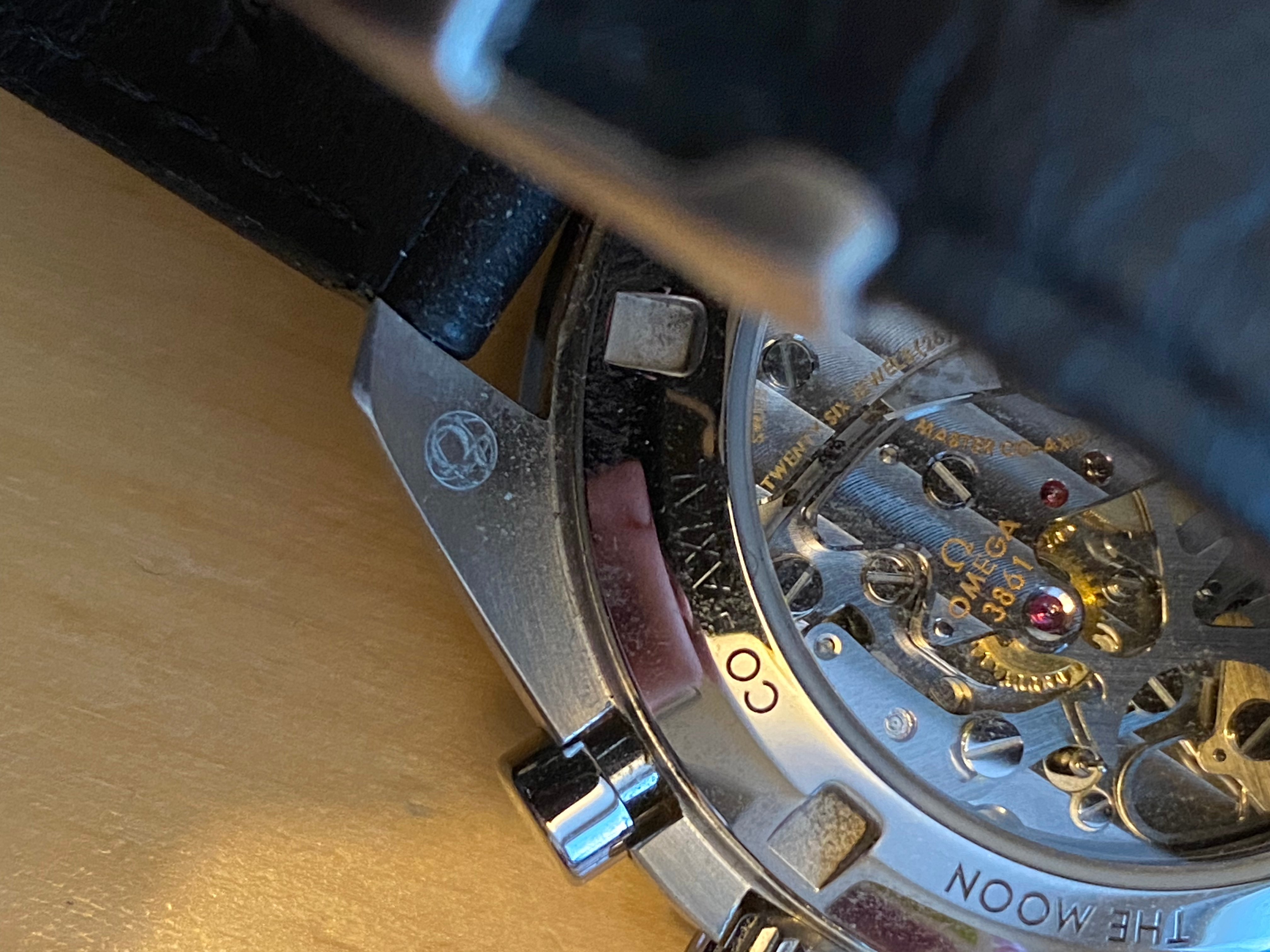 Looking at the rear of the watch, the top right lug (if viewed from the front), has a small engraving of the Omega logo and some other stuff around it, none of which is centred... I read in another thread that Omega put an asterisk on watches that were randomly selected for QC, could this be what it is? I have attached an image (my watch is about 2 months old, it looks filthy already, but is worn every day and I sleep with it on...