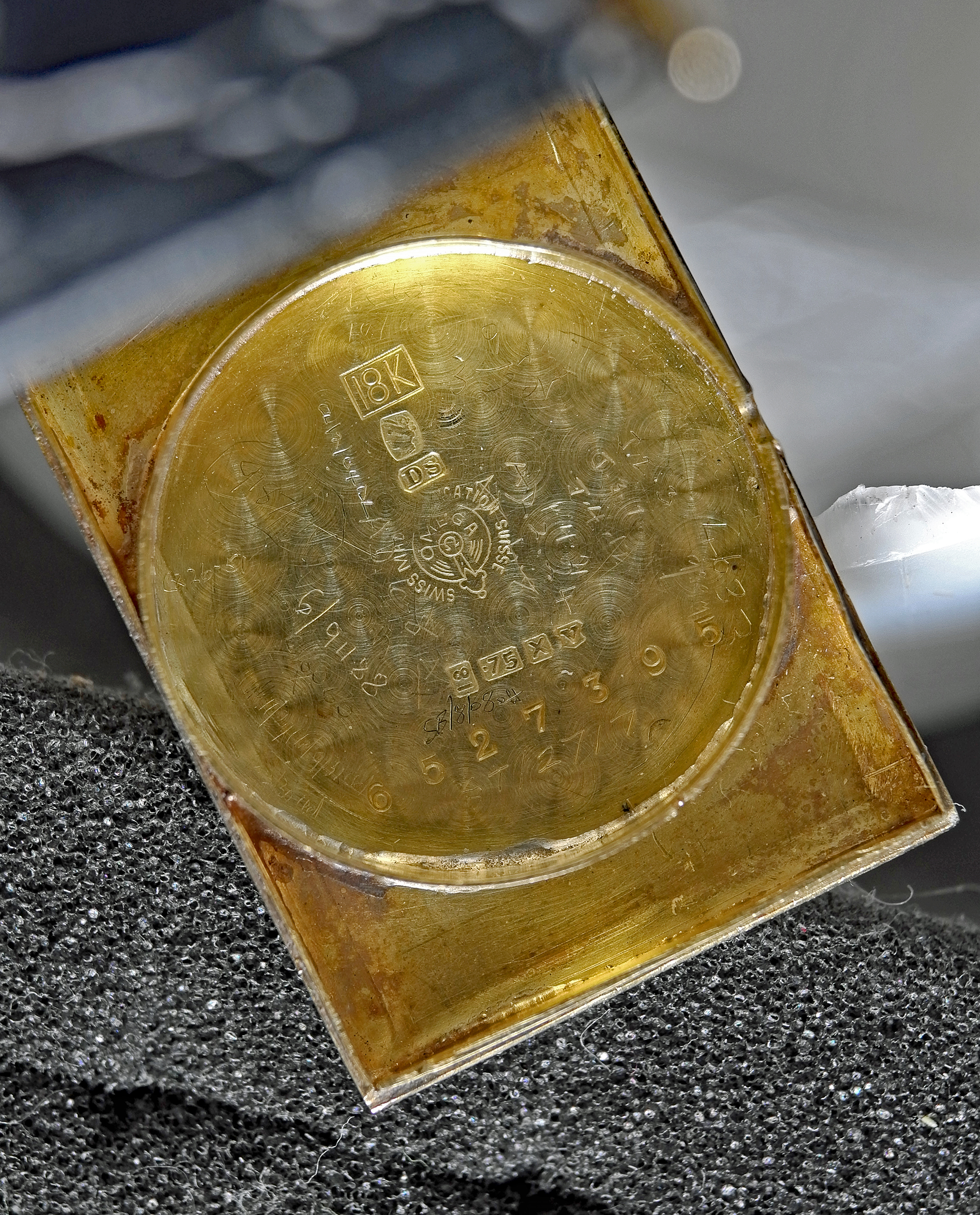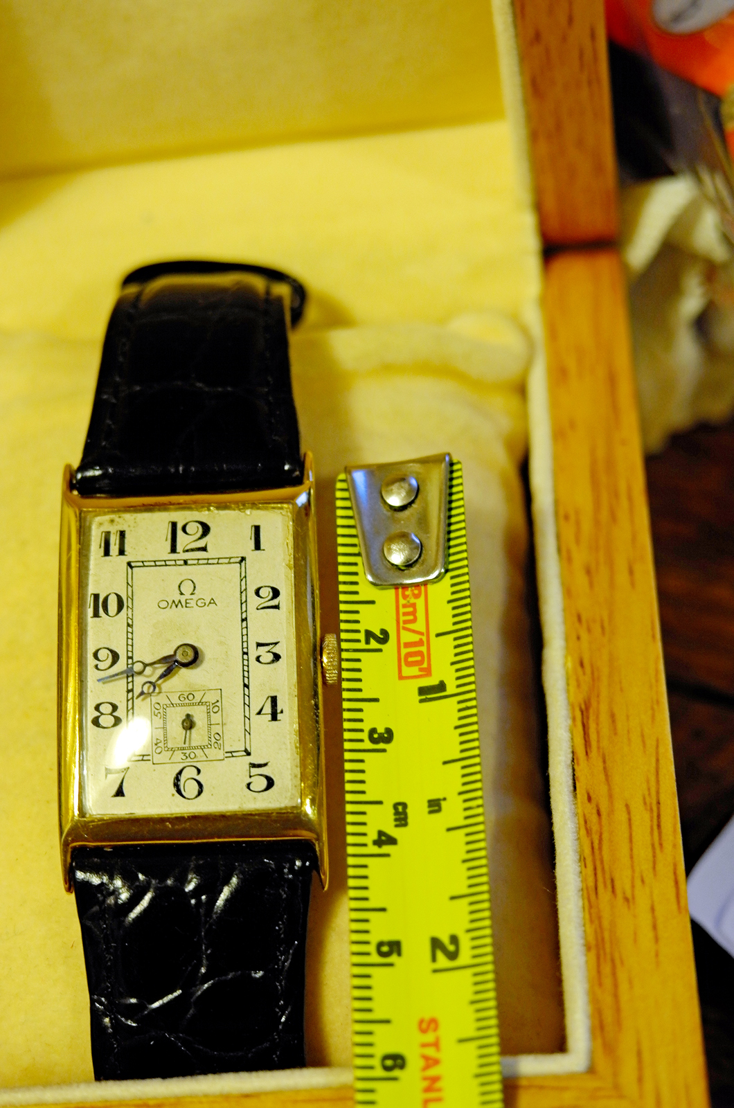 ·Photos show my mid 1920s 18carat gold Omega Tank ... fairly large tank model ie lug tip to lug tip 43mm; 25mm wide ... 27.5mm with crown; between lugs 22.5mm. Movement SN 6516255 ... case No. 6527395. Extensive service dates/marks on case back interior.