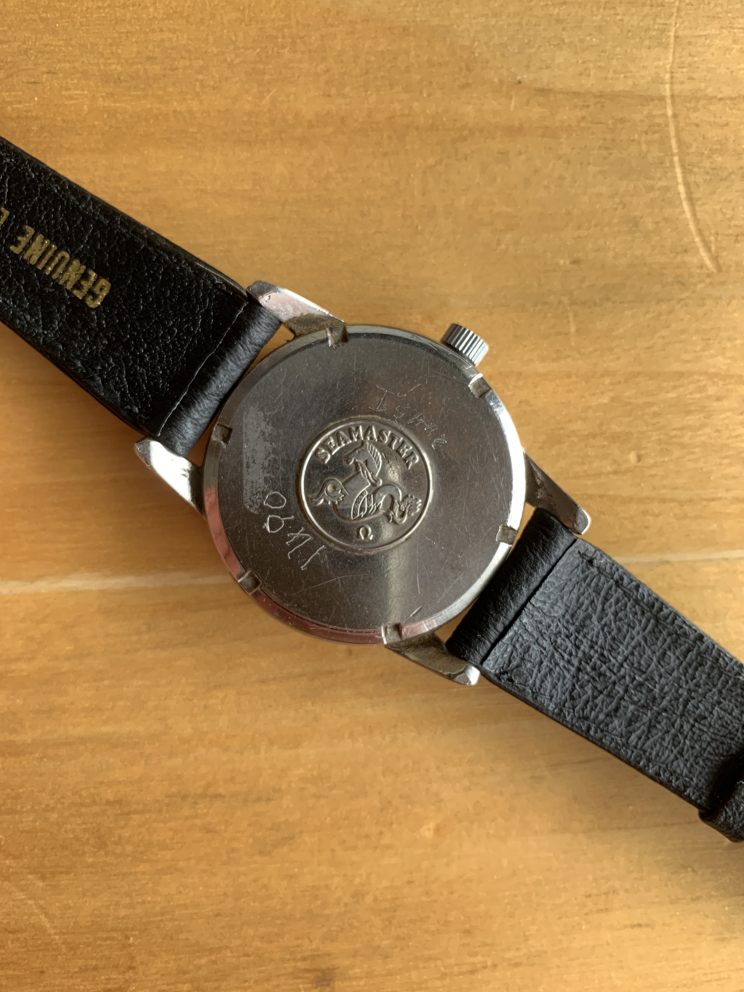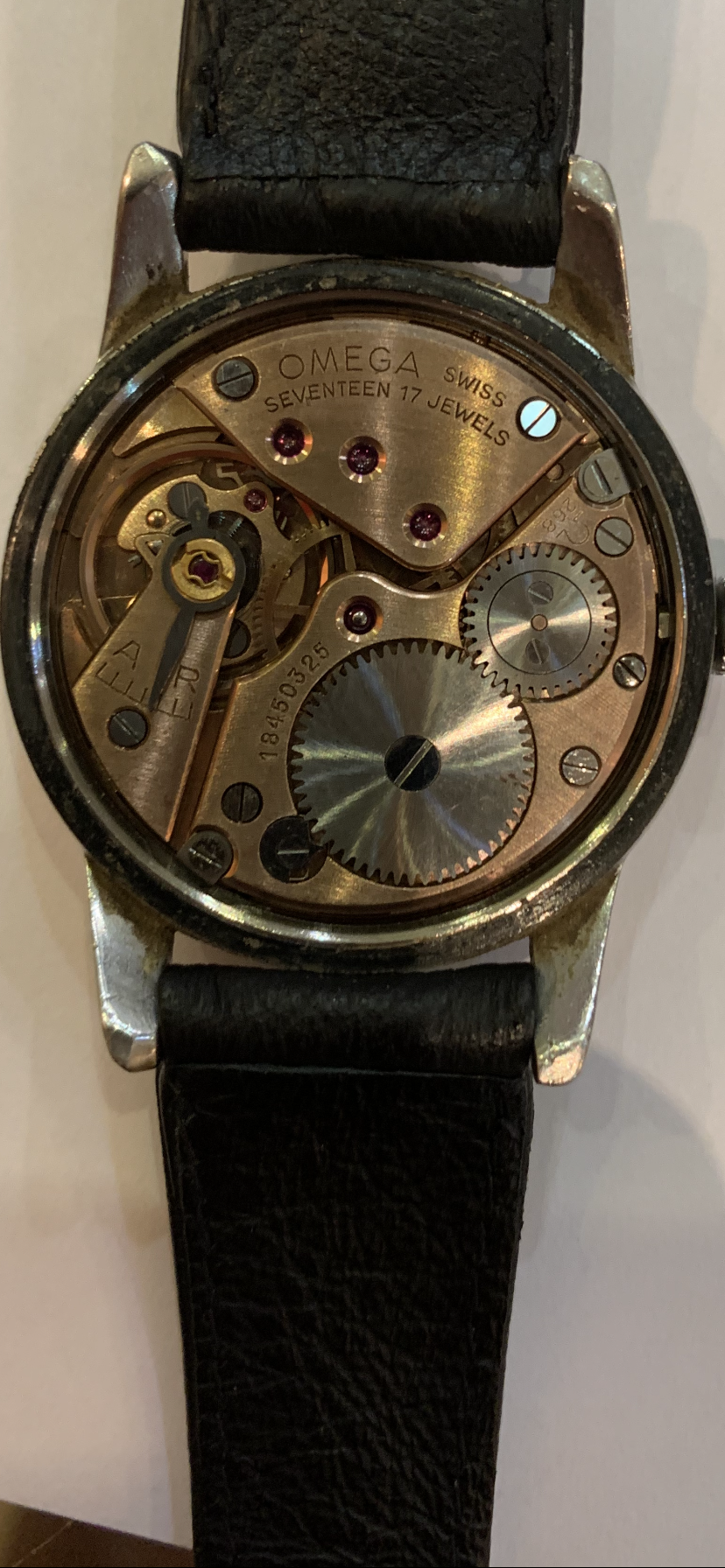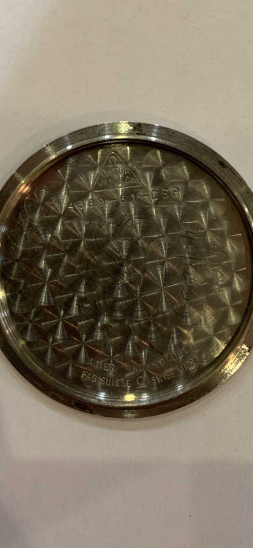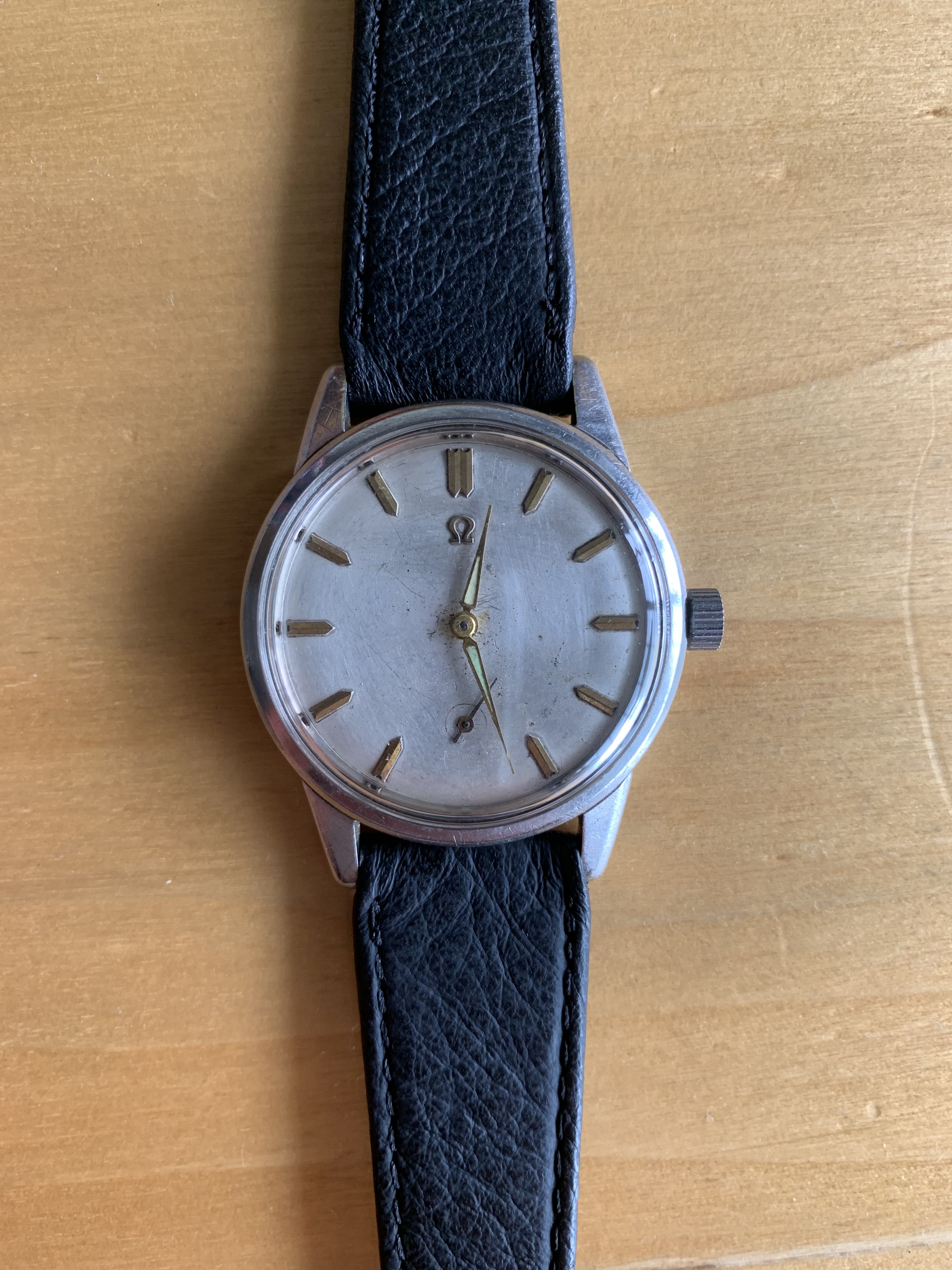 Please provide us with some nice pictures of the movement numbers (caliber and serial number) and the inside of the case back. that will make things a lot easier. Unfortunately Dan is right, the dial was more or less erased at some point in its moved live. If its a family piece like that, you might want to keep it as such. Or maybe, if you know what the watch number is, you might want to find a nice original dial that fits so you can wear it the way it originally left the Omega factory somewhere around the 60ies I think.