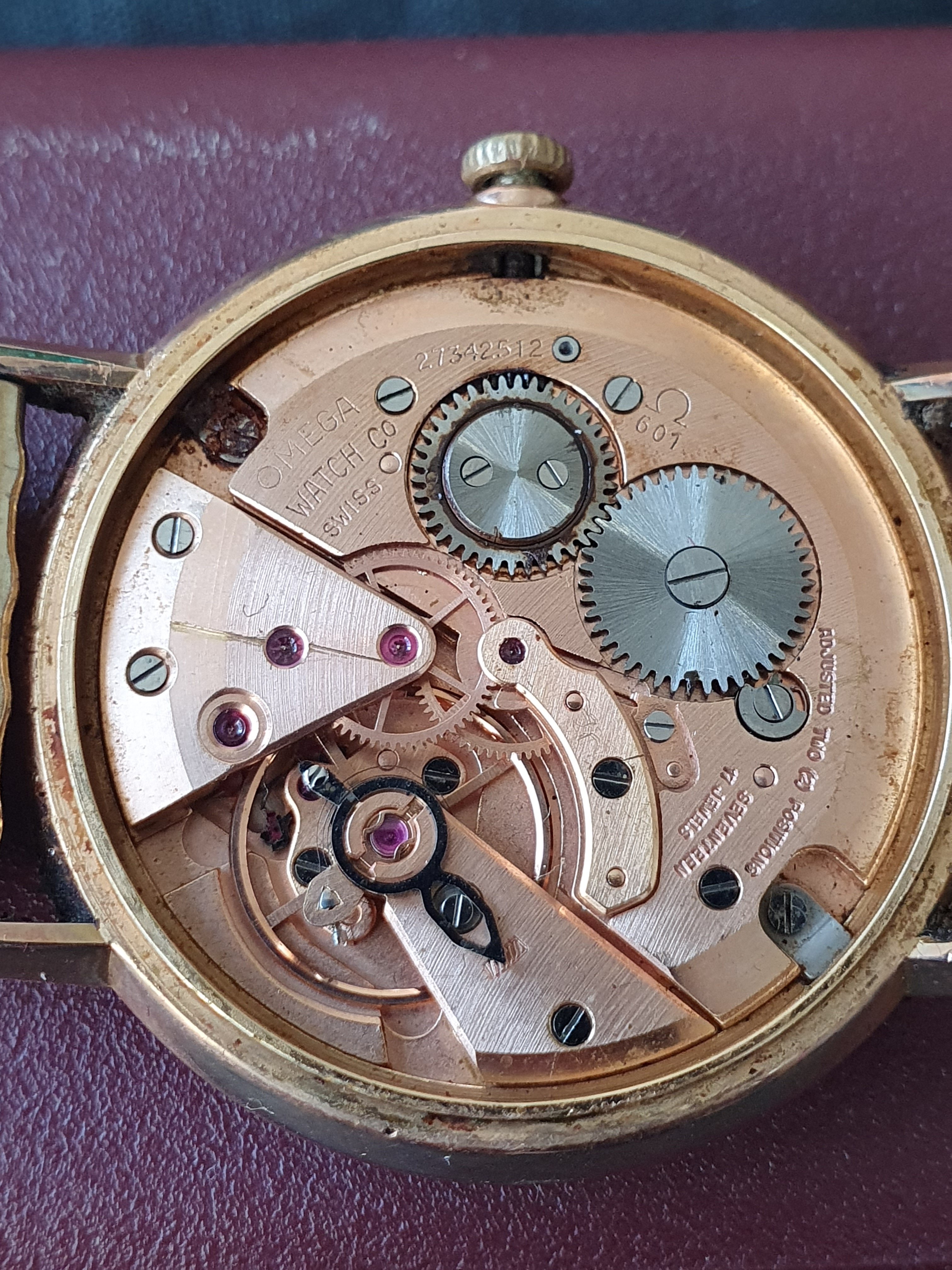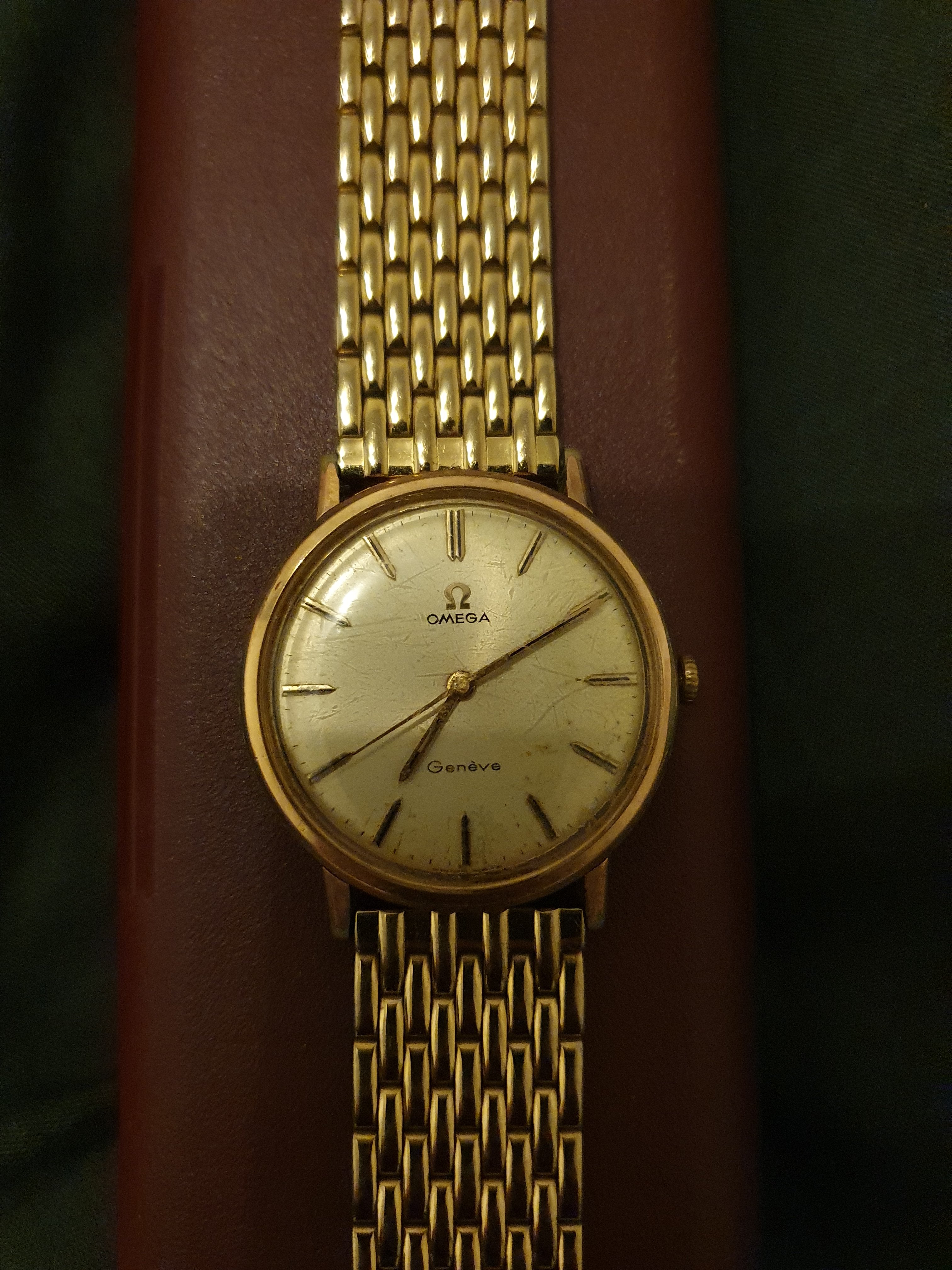 Looks like a gold plated 1960s Omega Geneve, probably a caliber 600 or a close cousin.