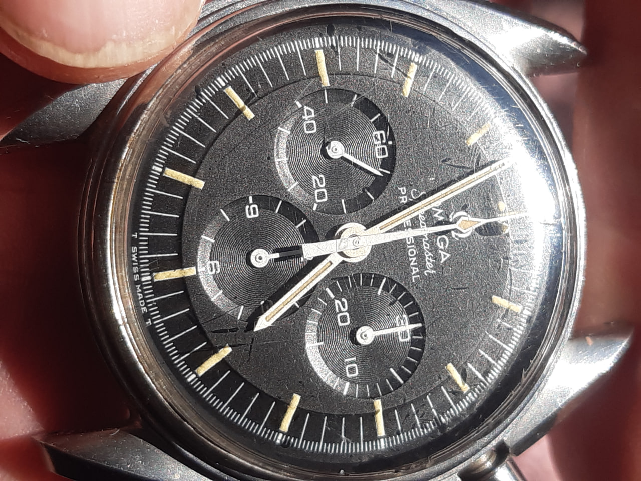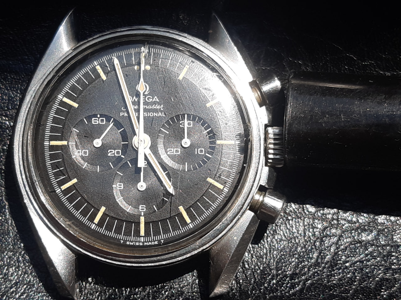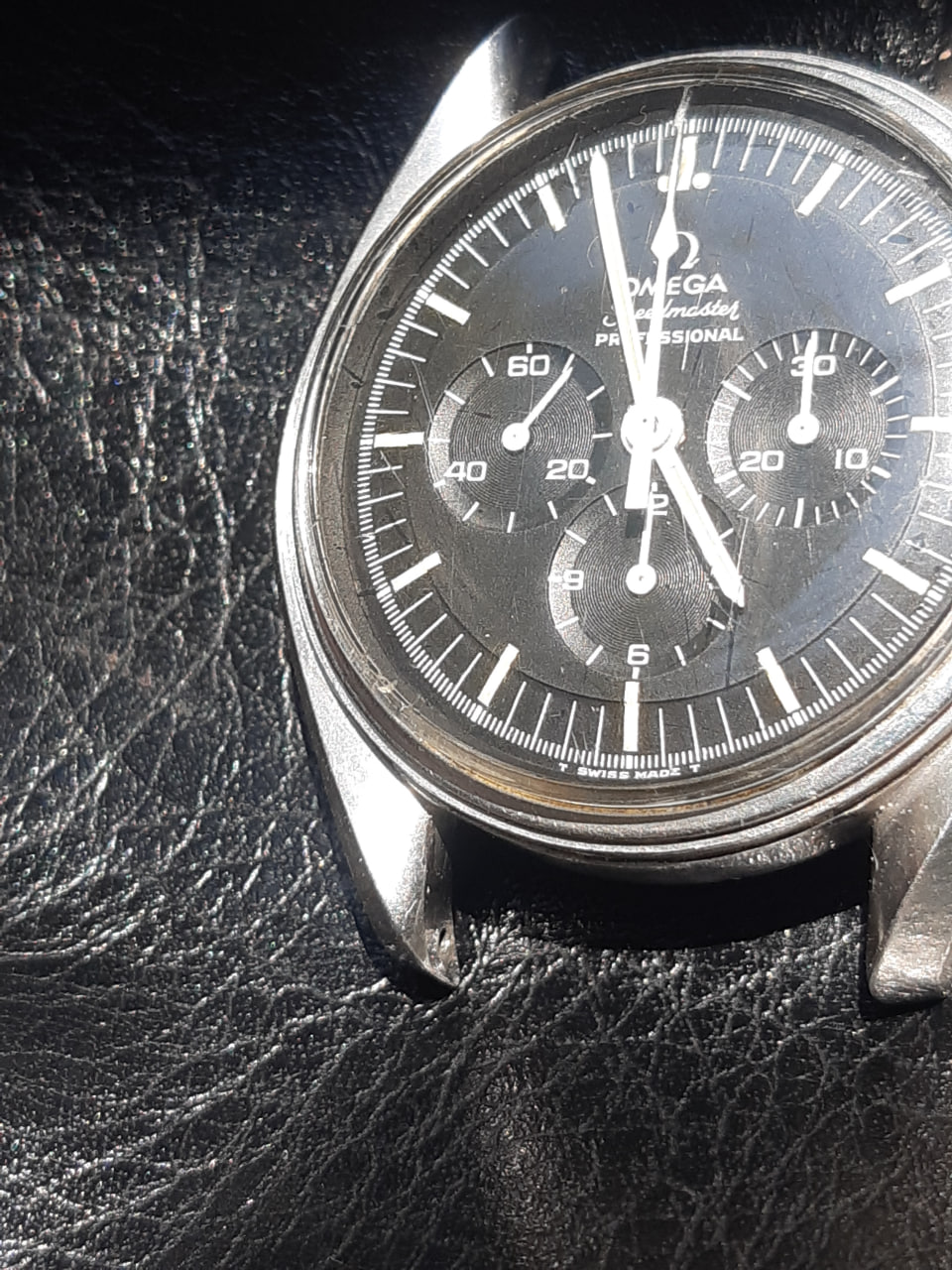 According to ‘ilovemyspeedmaster.com’, my watch was built in about March 1970 - serial no 291*****. Apparently my uncle wore the watch regularly, but I know my father never wore it. I remember this watch from my youth (I’m in my 50’s now) sitting in our safe, and I remember my father telling me that it was the type of watch worn on the moon and worth a bit. He said it was due a service, and so he would never wear it. I remember it had a black leather strap when it was in the safe - but when I received the watch recently there was no strap, and no bezel - so I am not sure what happened in the last few years of my fathers life - he may have worn the watch then, I’m not sure as I was in a different country. I have wound the watch twice since receiving it, and it runs fine; however I downloaded some timegrapher software (from https://tg.ciovil.li/; found through these forums ), and according to that and also according to an android app (“Watch Accuracy Meter”), my watch has an amplitude of between 190 and 240, a beat error of around 2.9, and face down it gains around 4 seconds a day, and face up loses around 25 or 30 seconds a day. So that, and the fact that I am sure that the watch has never been serviced, at least since my father received it some forty or so years ago, and possibly not even when my uncle owned it, means that I would like to get the watch professionally serviced. (The scratches in the case from a wrong tool to open it were there when I received it - so I’m guessing it was opened by someone at some stage previously)