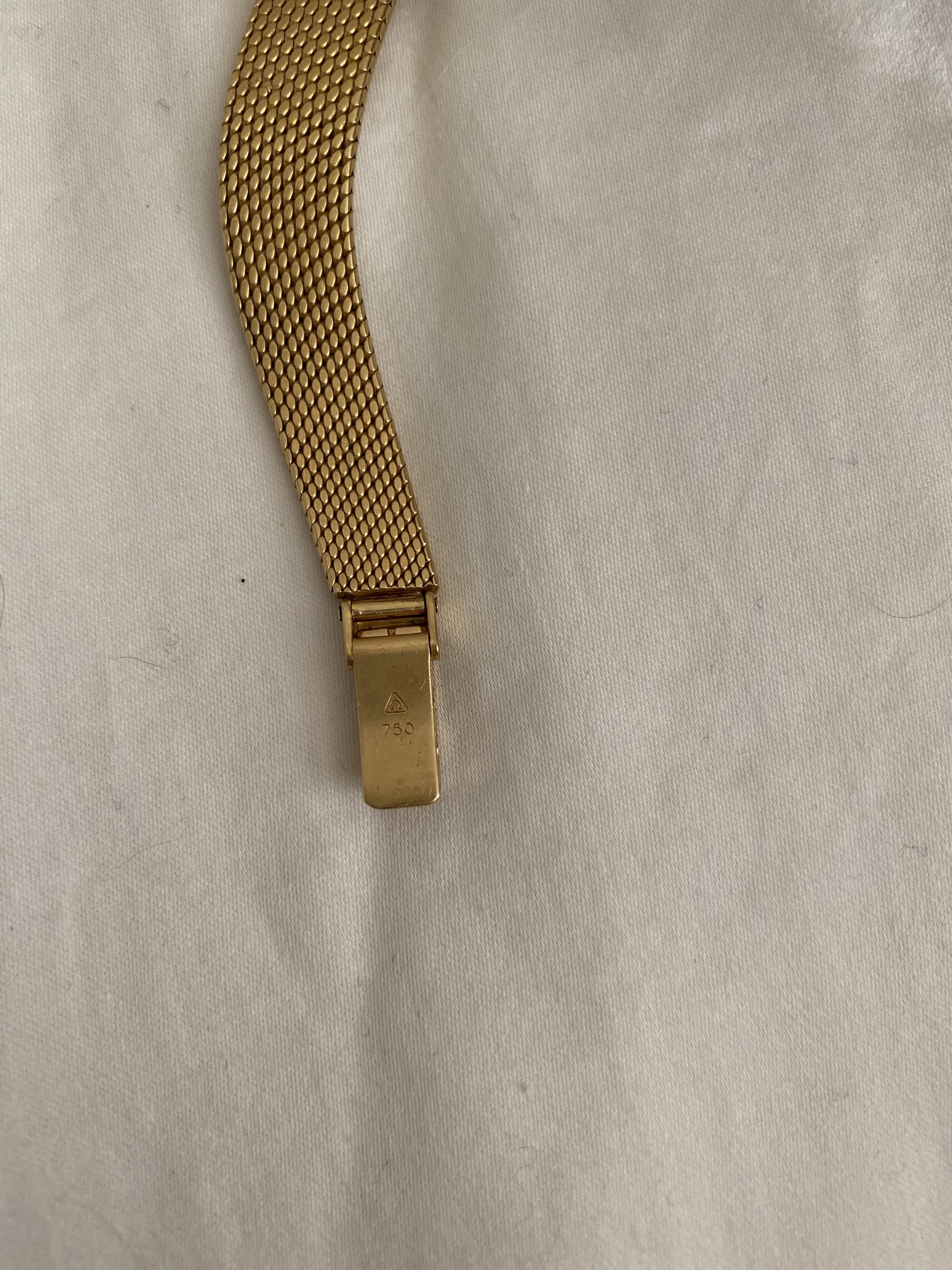 I tried to take photos of any distinguishing markings on the watch I could find. Besides “swiss,” the only other marking I could easily decipher was 750, which I believe means some part of the watch is 18k gold, but I could be wrong. The band of the watch is curved and it appears to be intentional as it looks curved when worn. There is a tiny, tiny engraving under the 750 that looks like a series of 4 numbers, but they are almost impossible to read. I could try to take it to a jeweler to see if it could be read under a loupe, possibly.