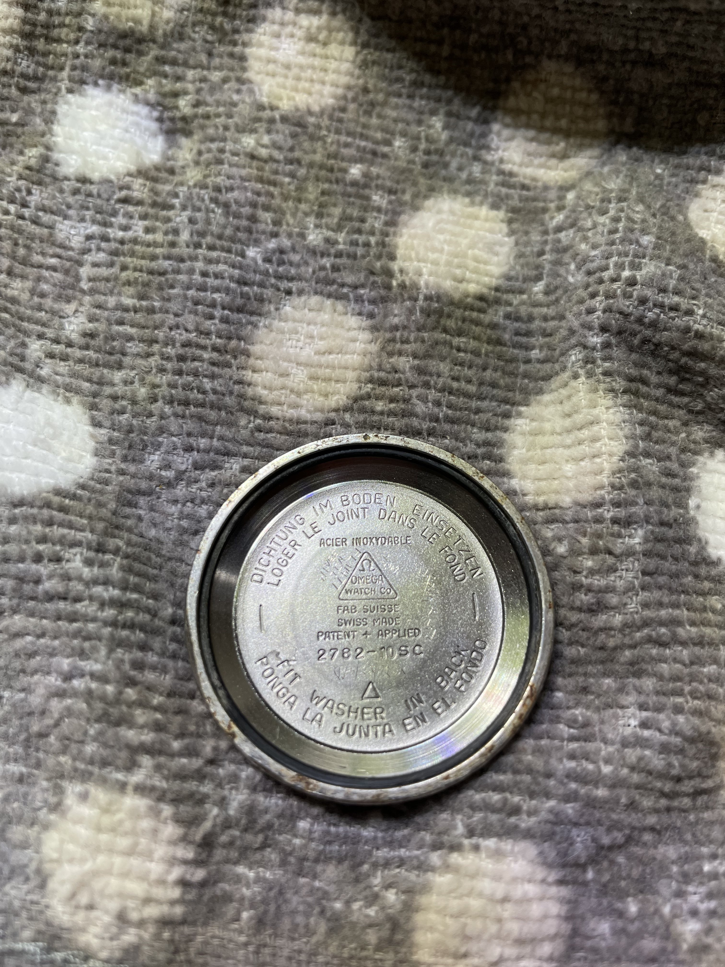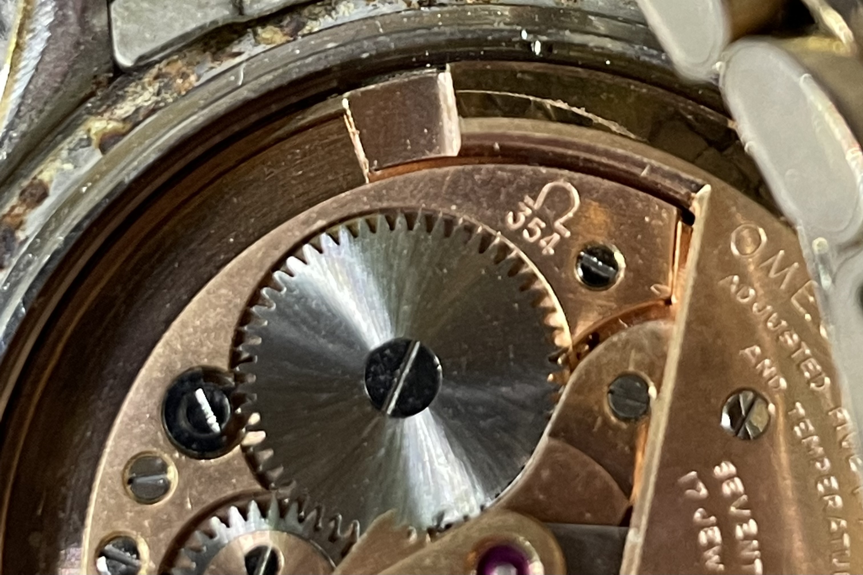 The watch band was severely corroded and the watch itself wasn’t working. My father had it serviced to restore the functionality (no major damage was found) and the band was salvaged as best as it could be. Aside from the internal service and band cleaning, nothing else has been done to the watch. The bottom of the case has the numbers “51499” etched into it and there is a small scratch on the glass. Otherwise, most blemishes seem like they could be polished out.