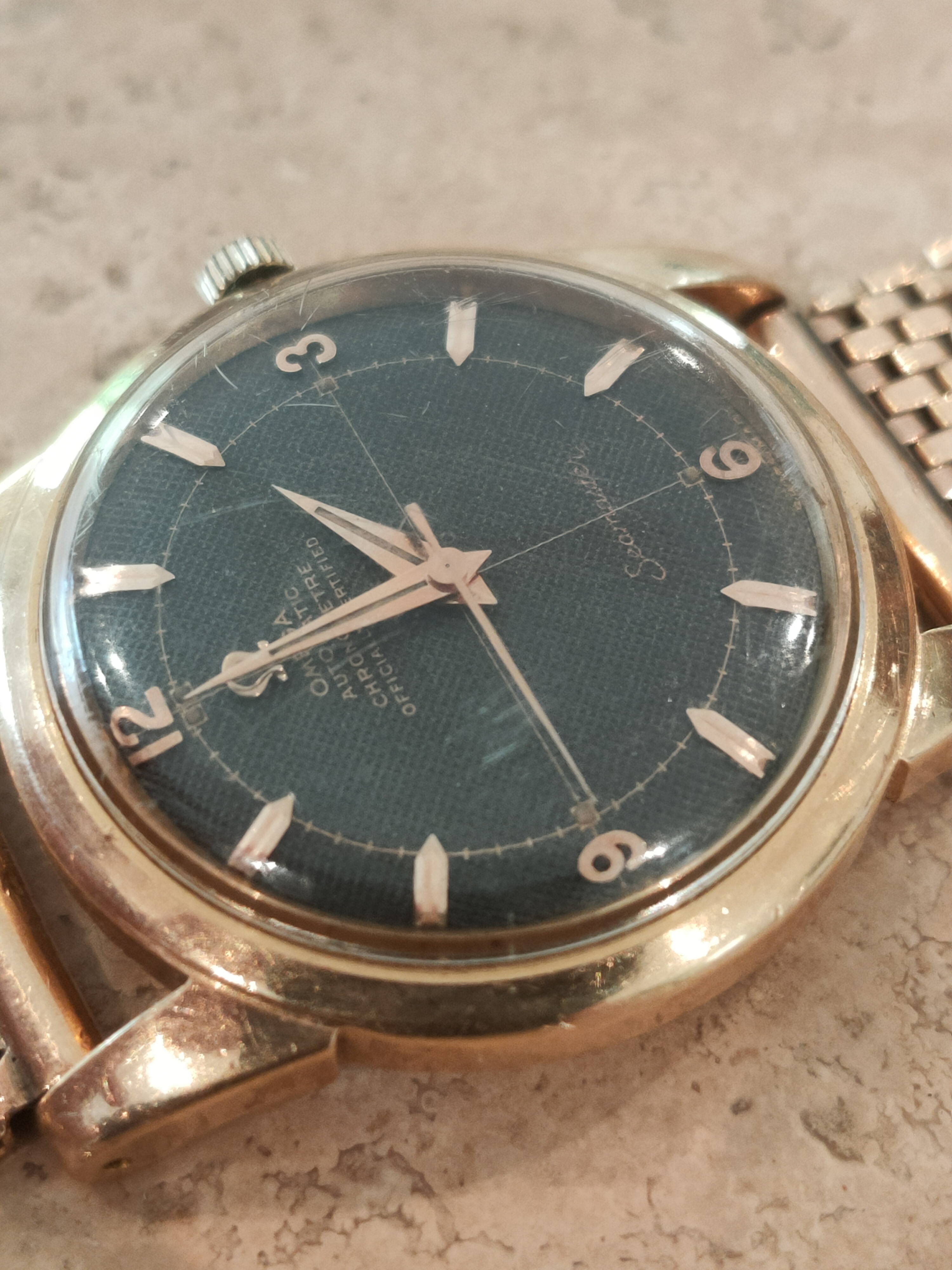 - Solid gold Omega Seamasters from this era (circa 1952) aren't very common.