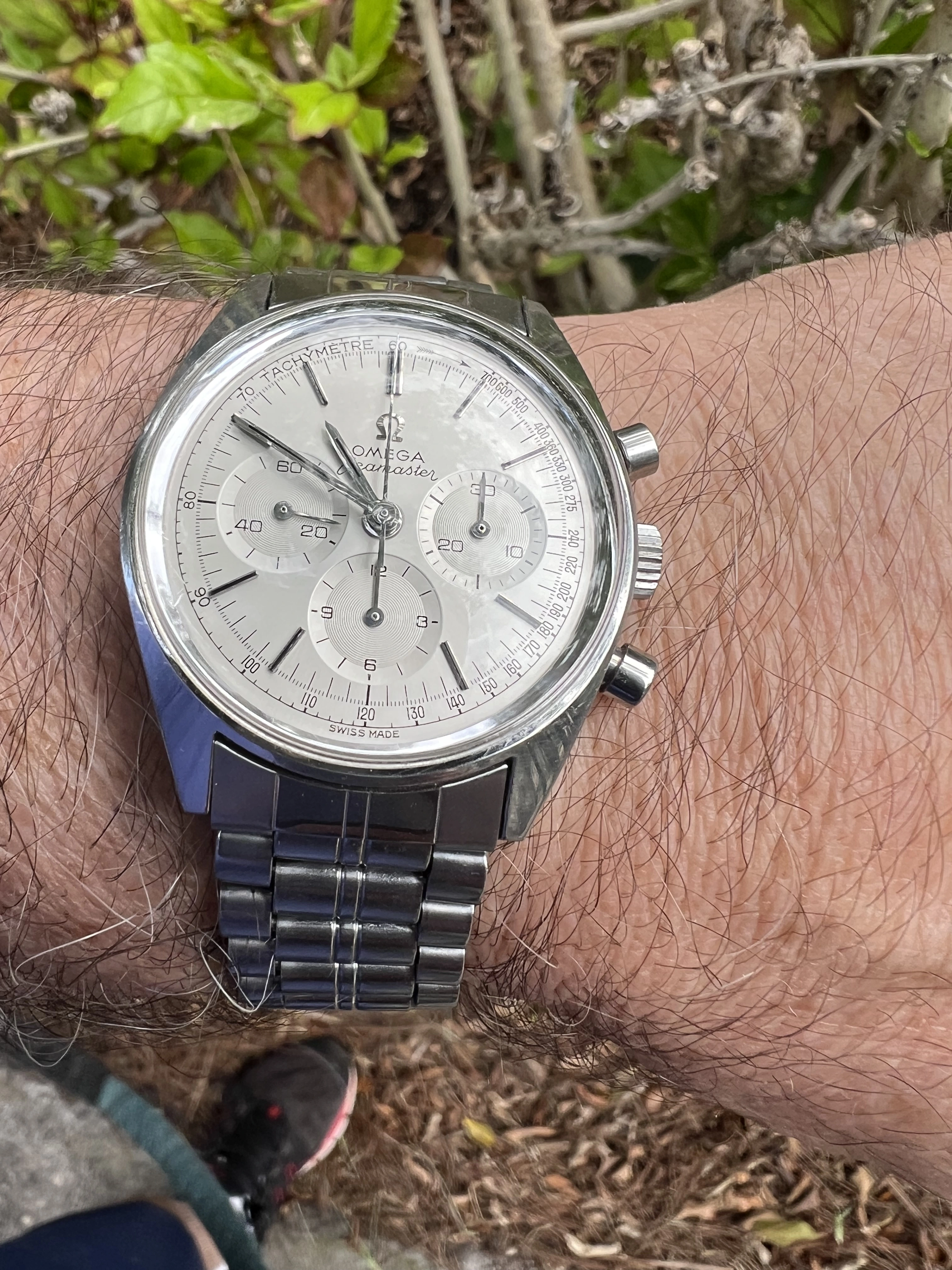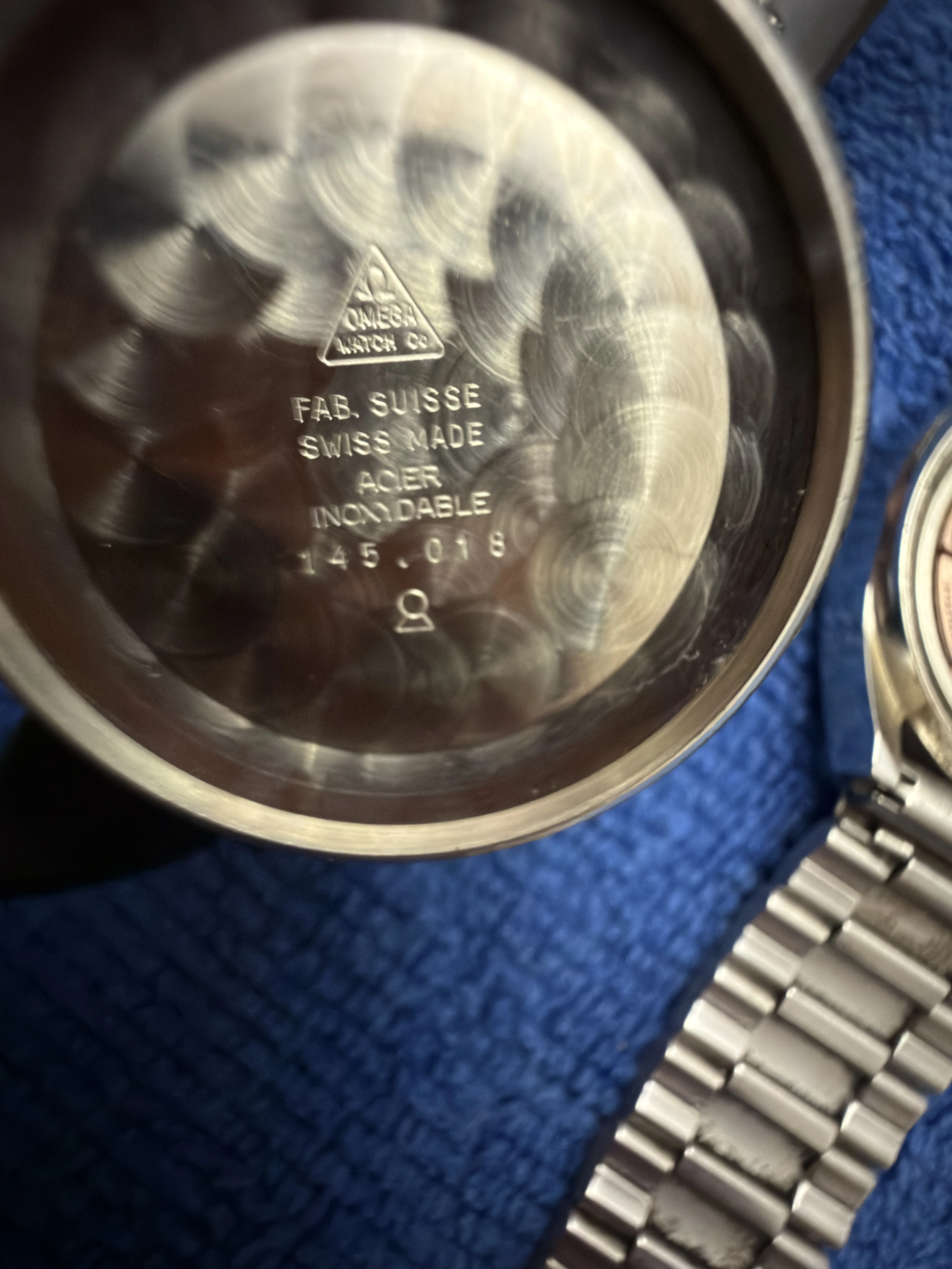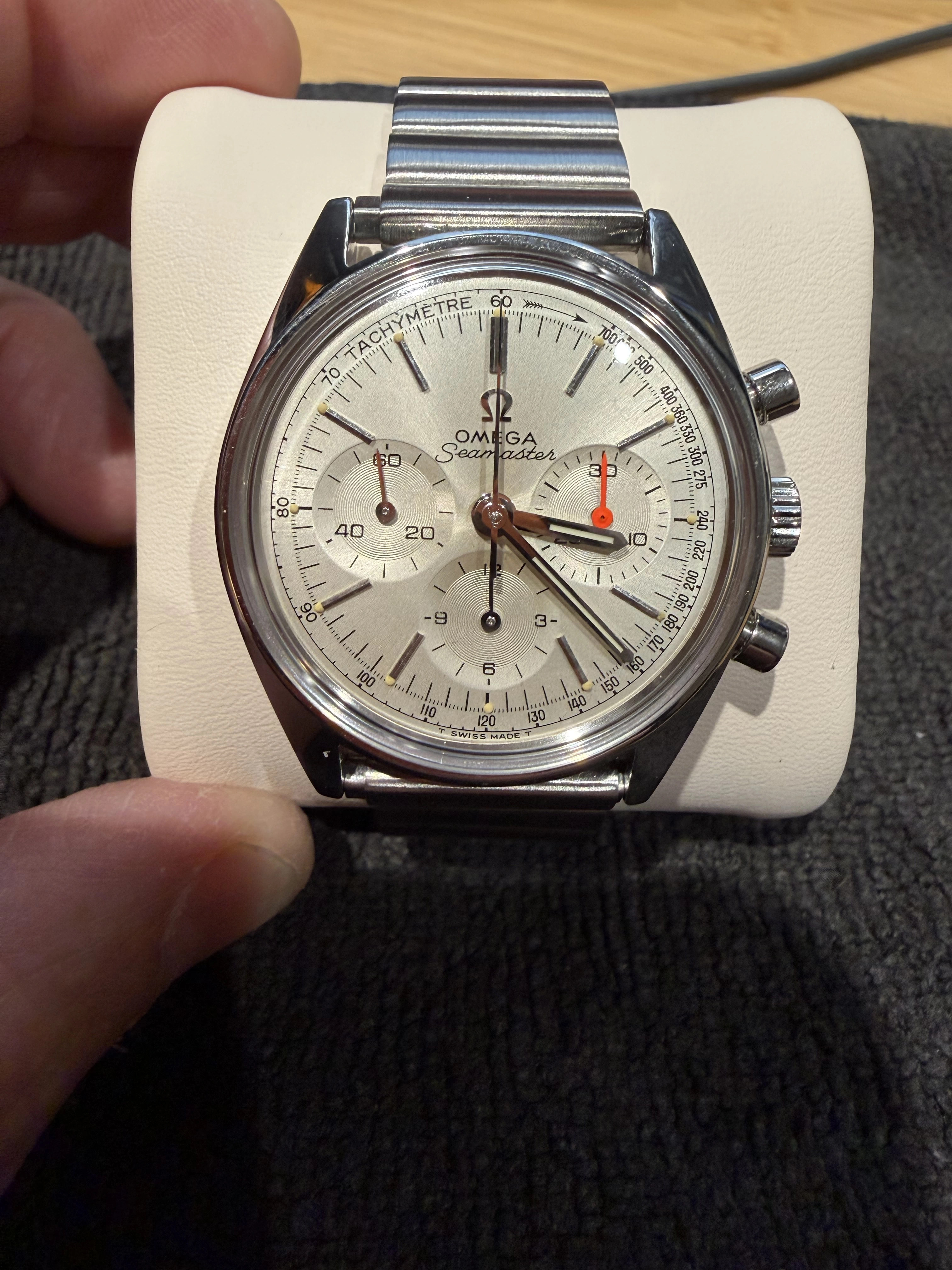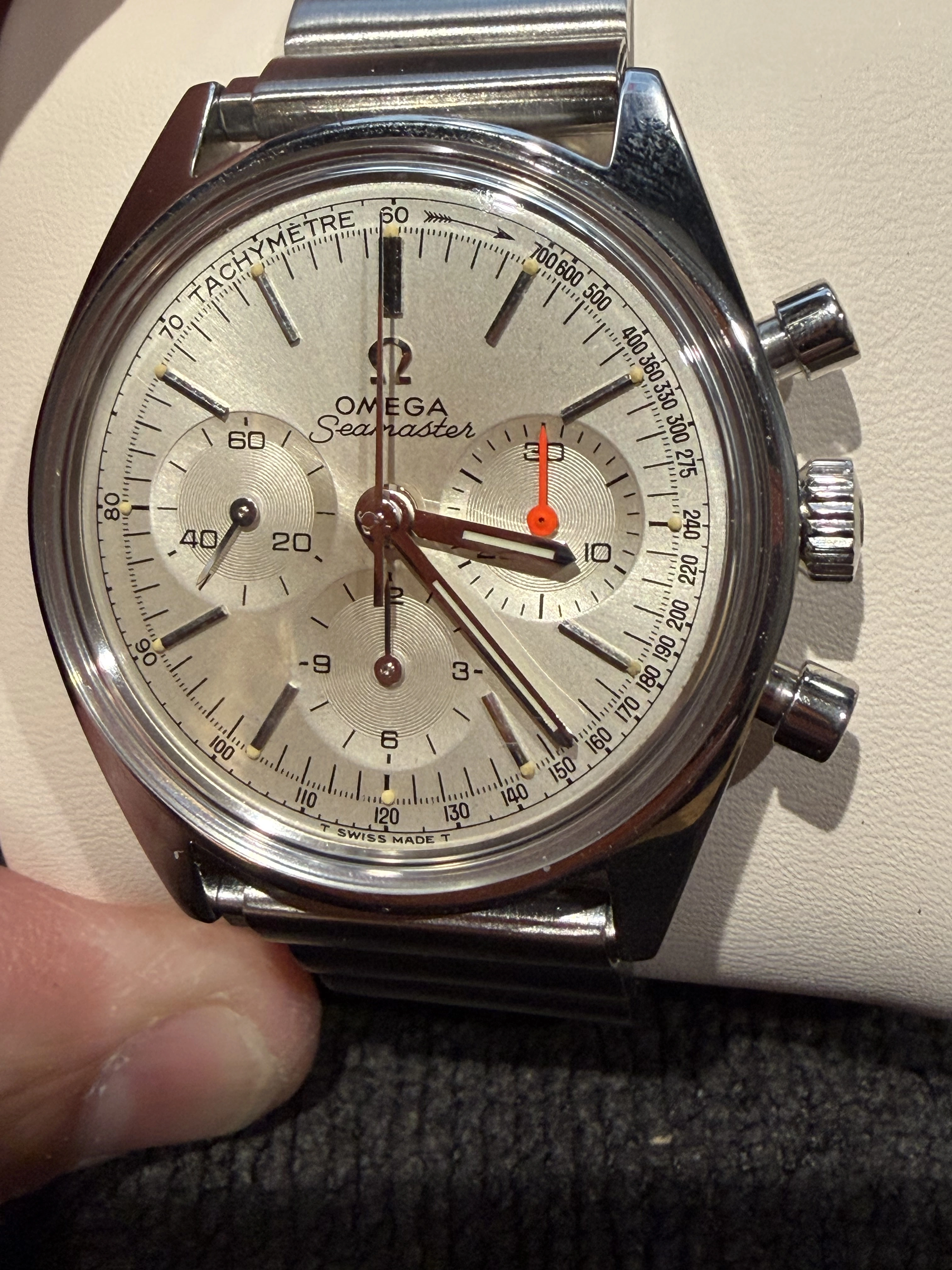 ·From my googling, this is a Seamaster 145.018 with a serial number of 27xxxxxx (which I can't find much info on, but it appears it's from 1968). I have yet to see one with a red hand like this. So here is what I know. I sent the watch back to Omega and had it factory serviced and "returned to factory specifications". The card from them says the average rating is +4 (no idea what that means). I learned that the band is not original, but it seems the watch itself is. I don't even know how to use the silly thing. The left smaller dial (complication?) is obviously the seconds hand, but the actual seconds hand doesn't move. I'm assuming that can be used as a stopwatch? The main crown only pulls out one stop. The top and bottom don't seem to do anything at all. I don't know what the other two small dials (complications?) are for/do.