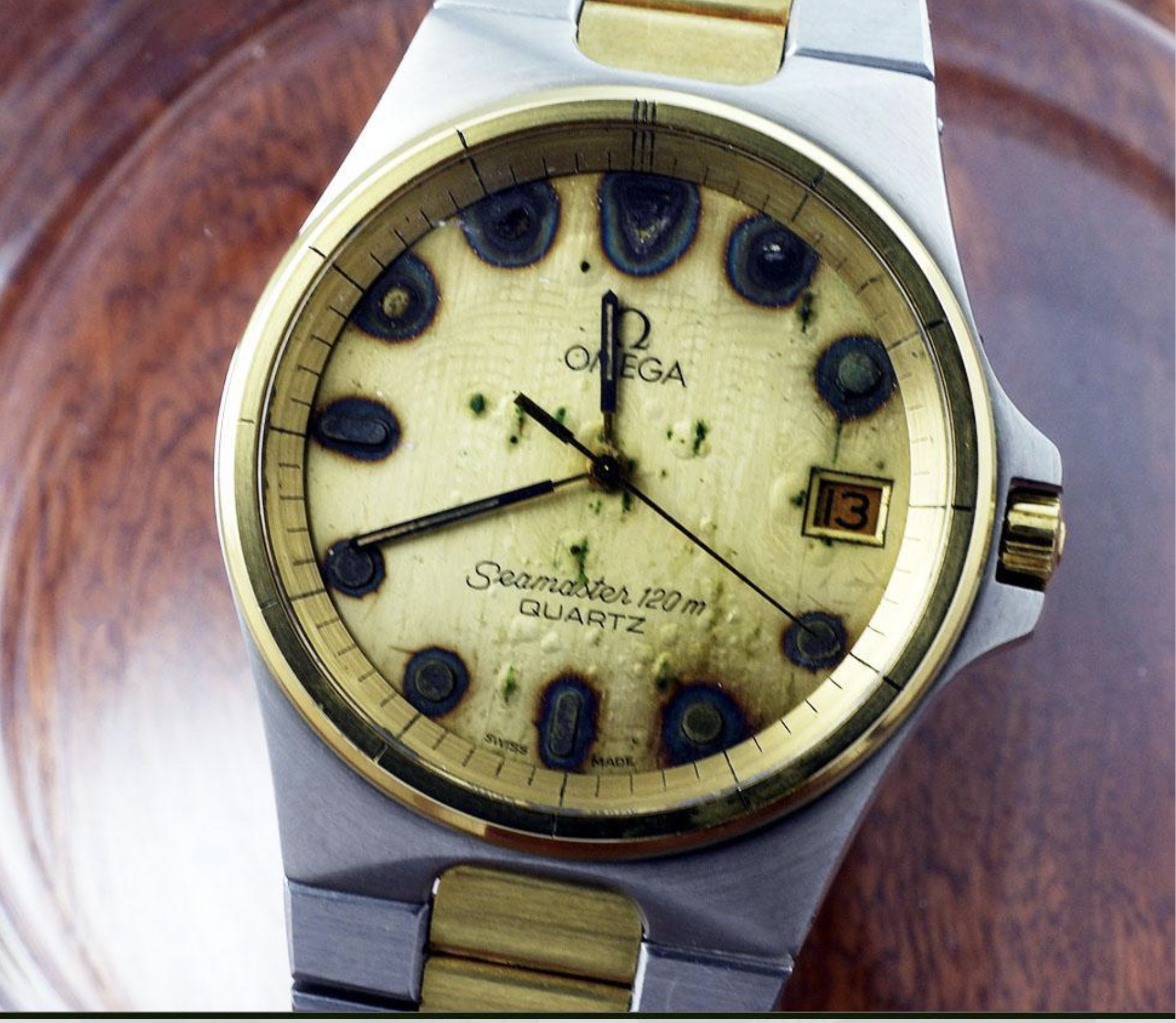 Posts 3,998 Likes 9,015 cvalue13 ·Apr 20, 2022 battery leak reacted with lume? never heard of that, but certainly seems like a chemical reaction localized around the lume. or alternatively, the watch was near a house fire and got just hot enough to ignite the lume and begin to bubble the dial paint?