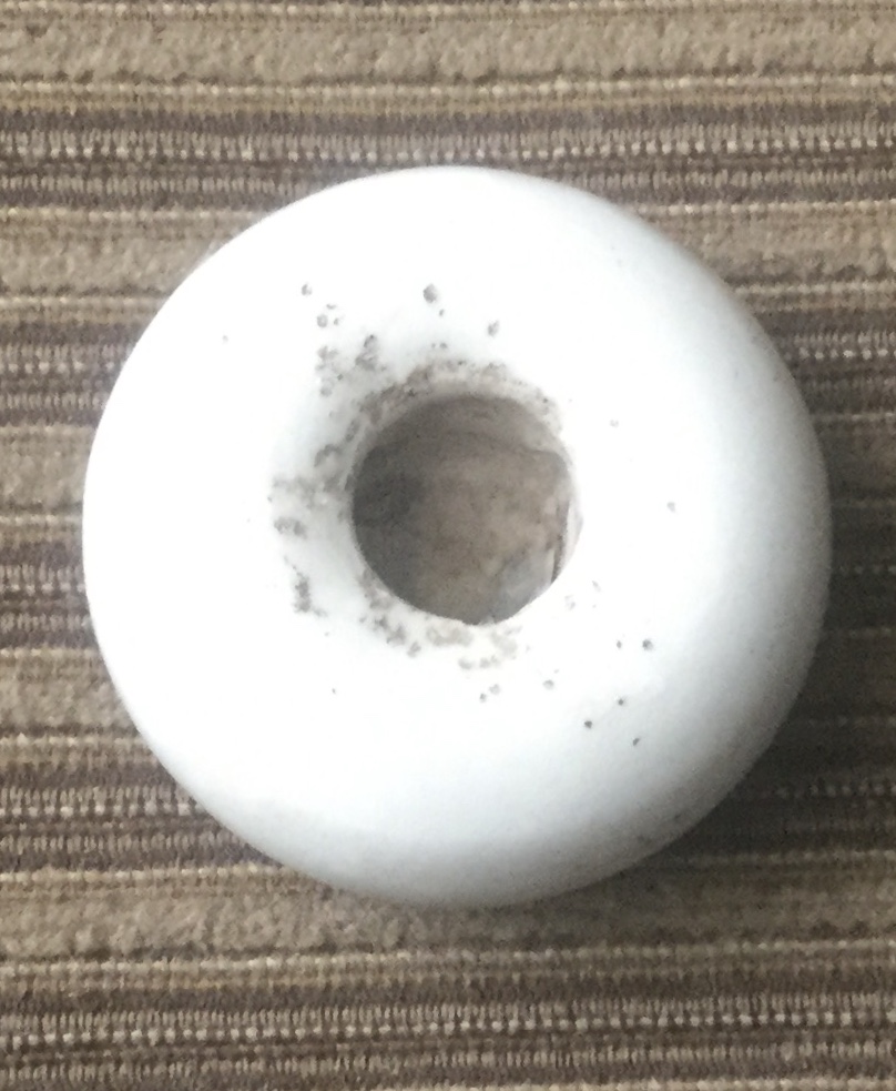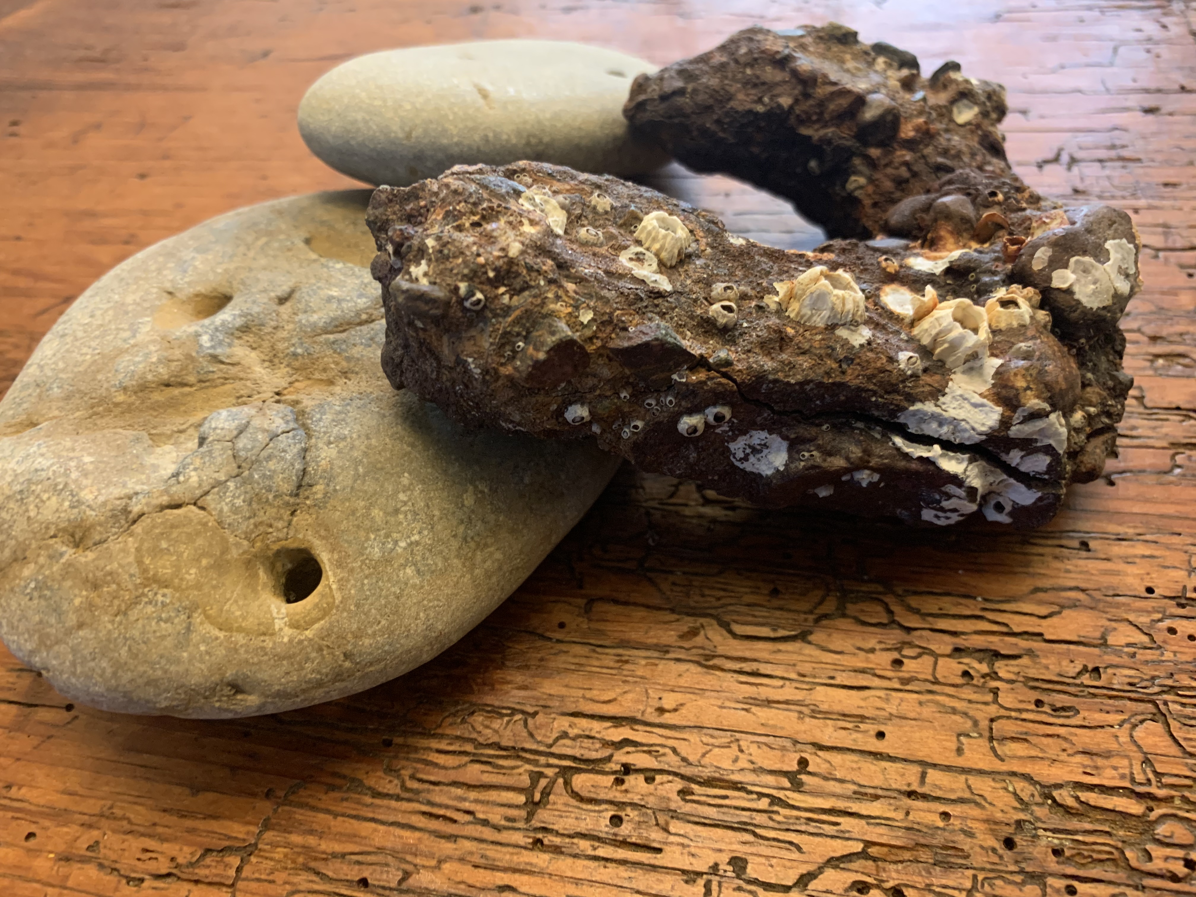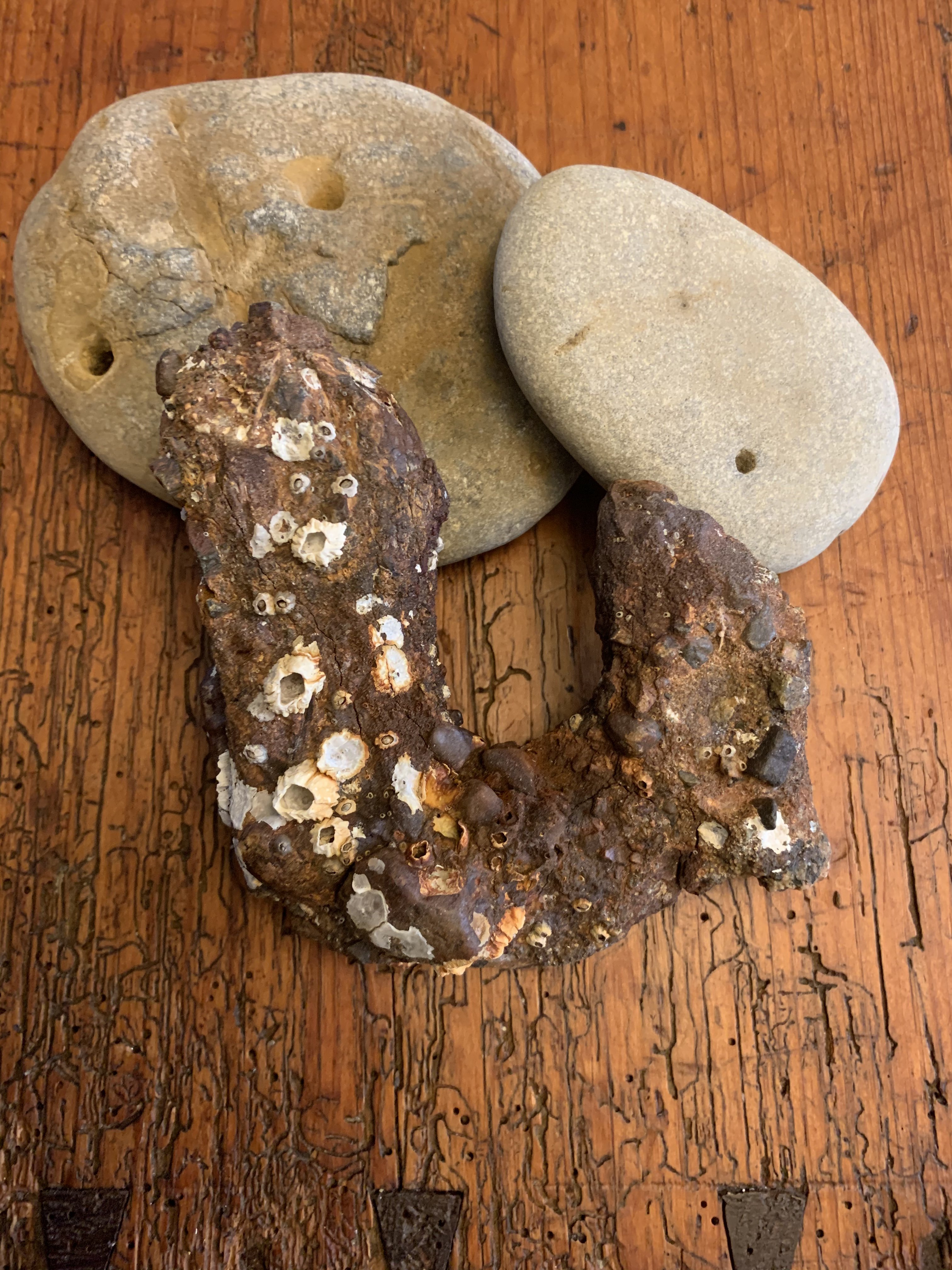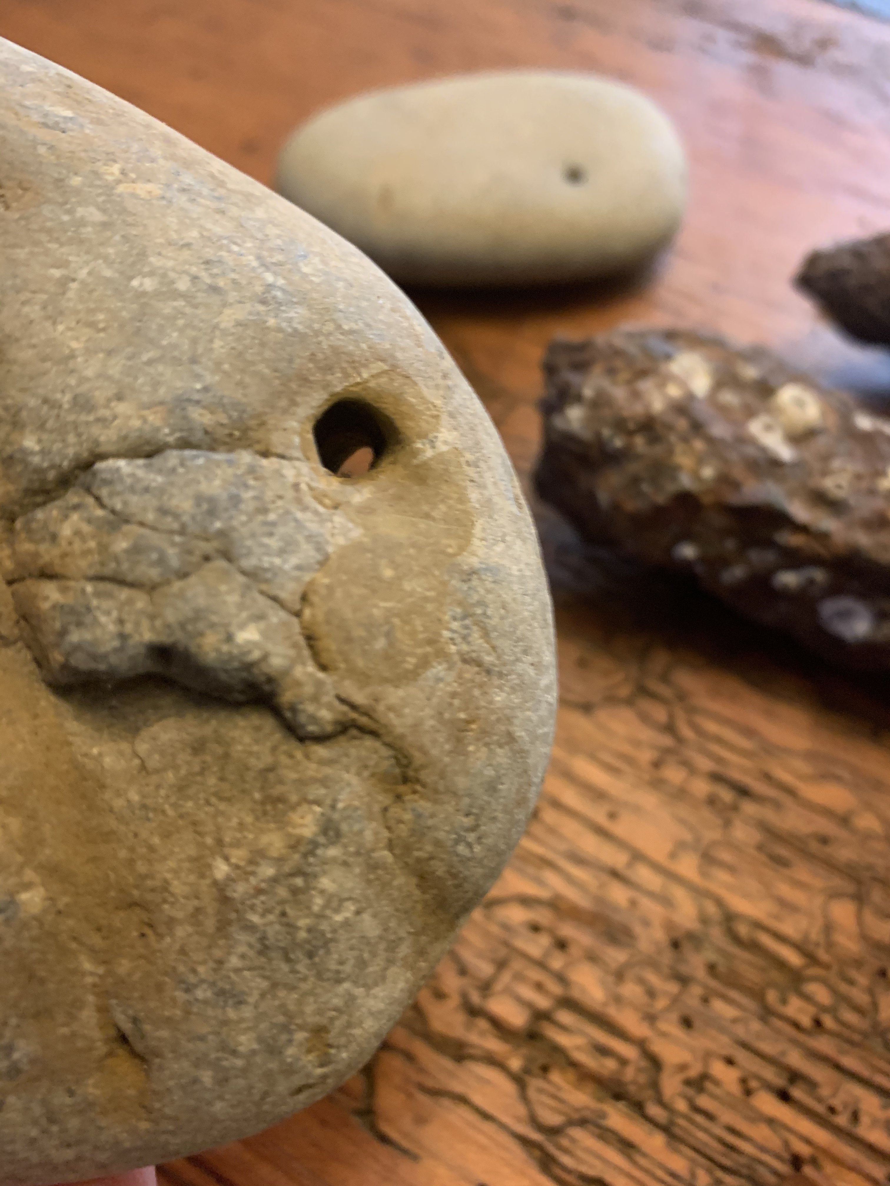 And net weights from a Lake Huron beach in Ontario. First Nations would drill holes in the rocks so they could tie these weights to the bottom of their nets back in the day. I used the same set up when smelt fishing back when I lived there. I didn’t have to hand-drill through rock though, just needed to get some weights at Canadian Tire 😝