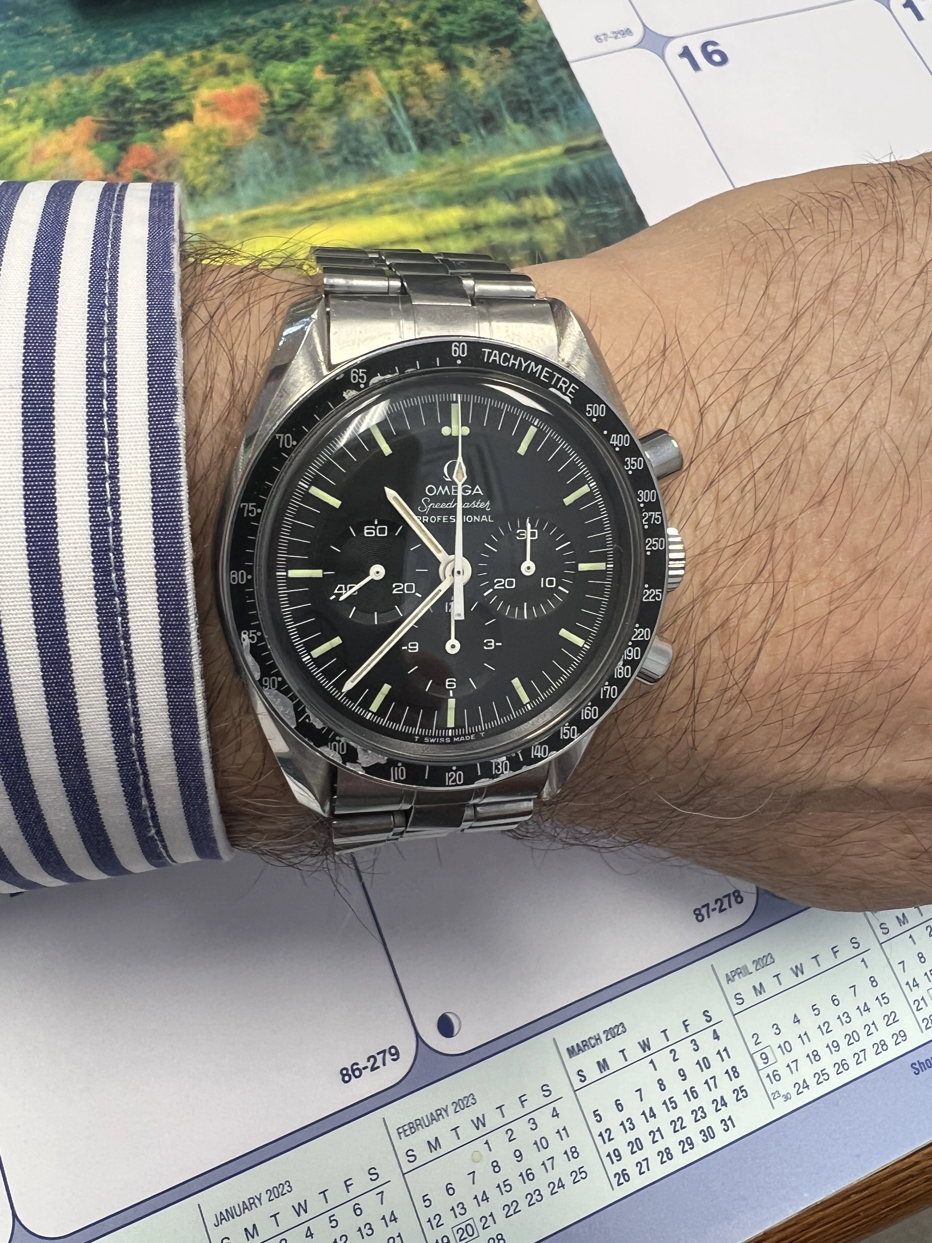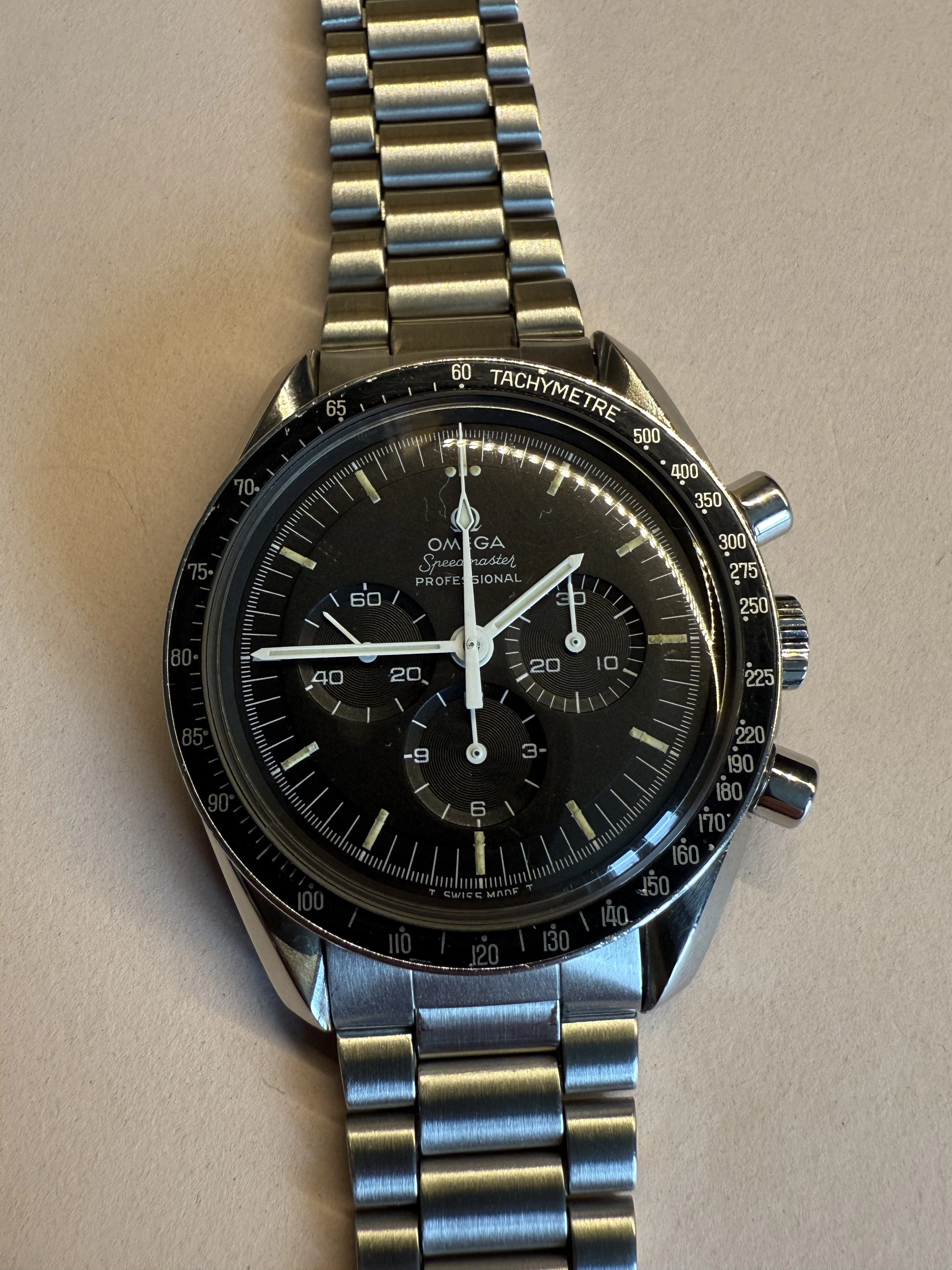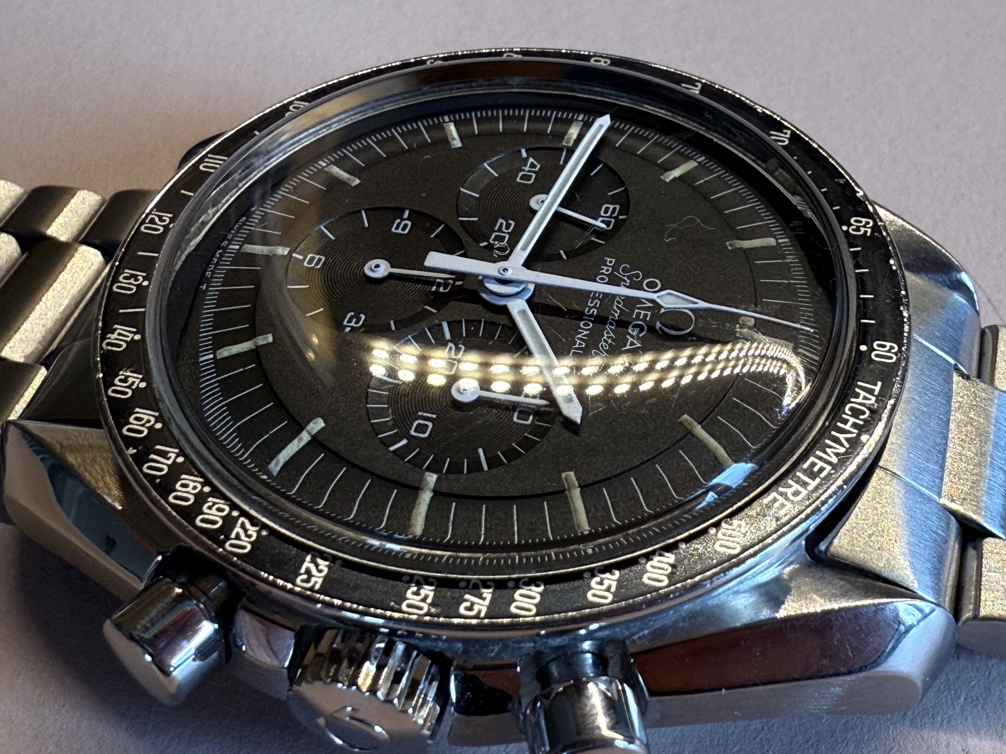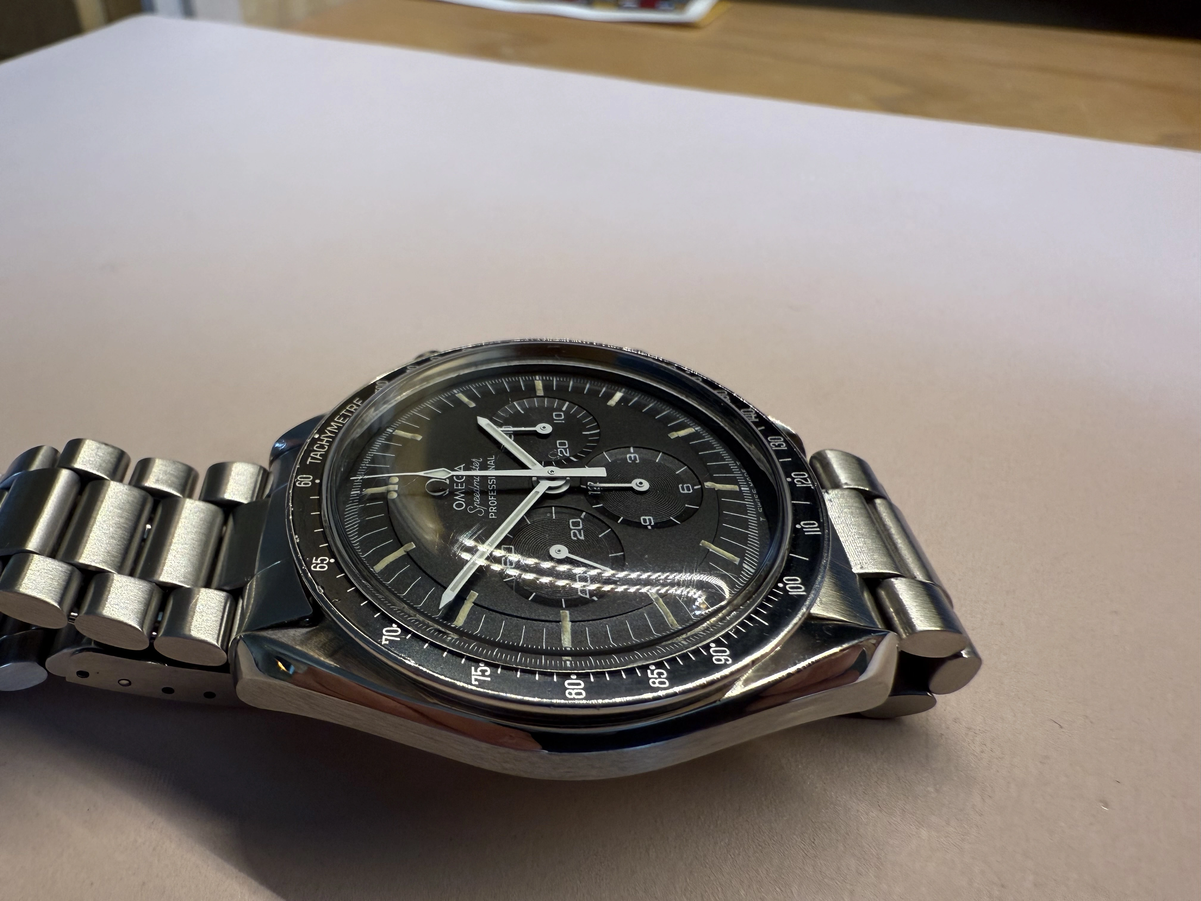 I'm from Munich, Germany, and a few years ago I used to go to a local watch fair from time to time. This was before the vintage hype. In other words, the time when you could buy a UG Polerouter or an Orfina Porsche Design for just a few hundred euros. These were penny watches that most people didn鈥檛 cared about. But I did and I was for a hunt. You have to imagine this fair as a big flea market for luxury watches, held in the congress hall of a large hotel. It was 2013 and I was strolling past the display cases of the mostly professional dealers. One dealer had all sorts of watches jumbled up in his display. You had to scan all the watches like lego parts in the kids room. Not like most of the others, with their Rolexes, APs or Panerais neatly lined up. I still remember seeing my Speedmaster literally lying under two other watches. Totally scratched and without a strap. Really bad optical condition. The hands had no lume and the mainspring was broken. But at least it was unpolished and in my novice eyes not a Frankenstein. I was able to get it for 1300 Euros, which was really good for a 145.022 in 2013.