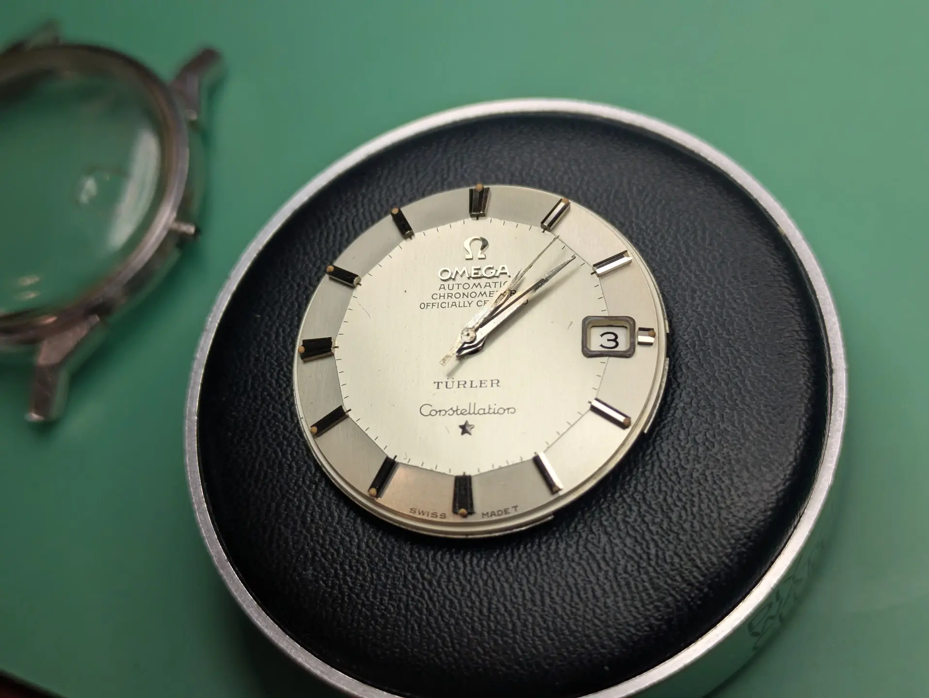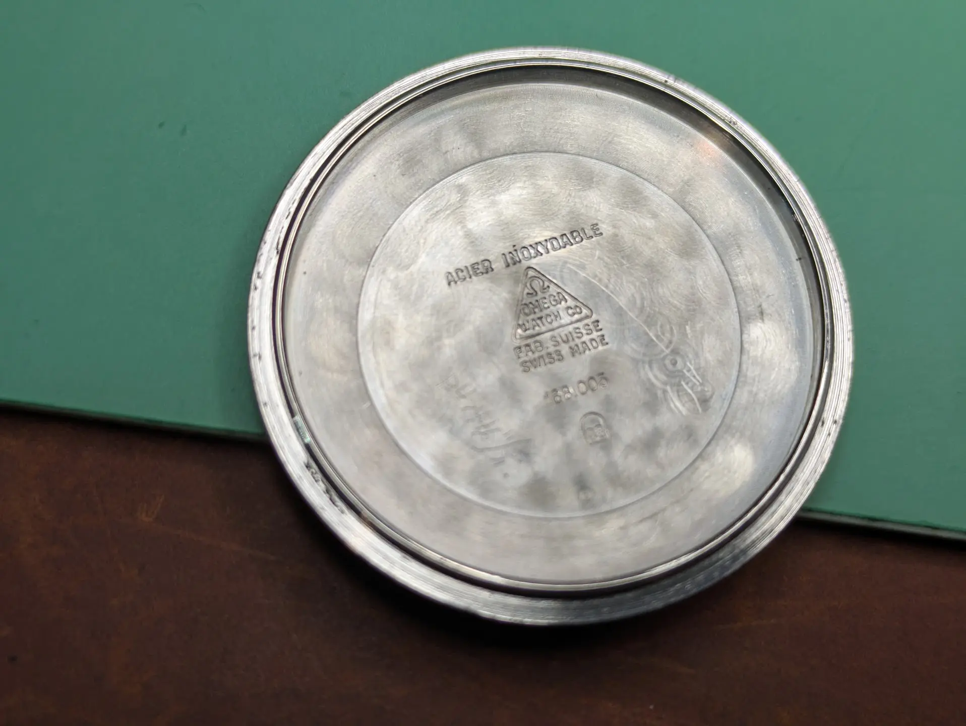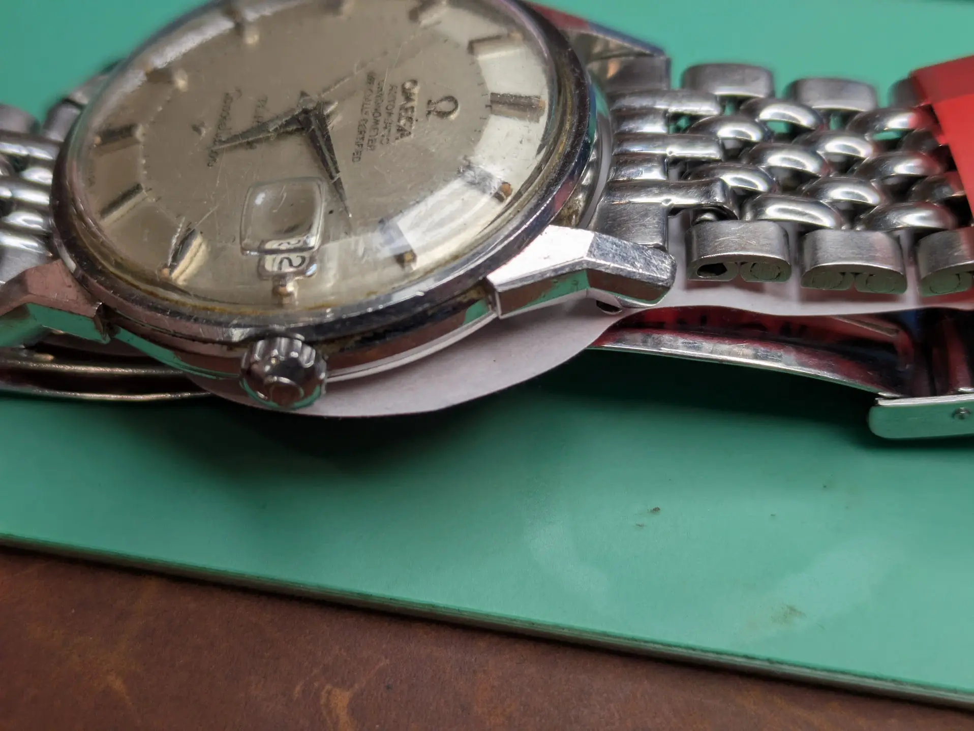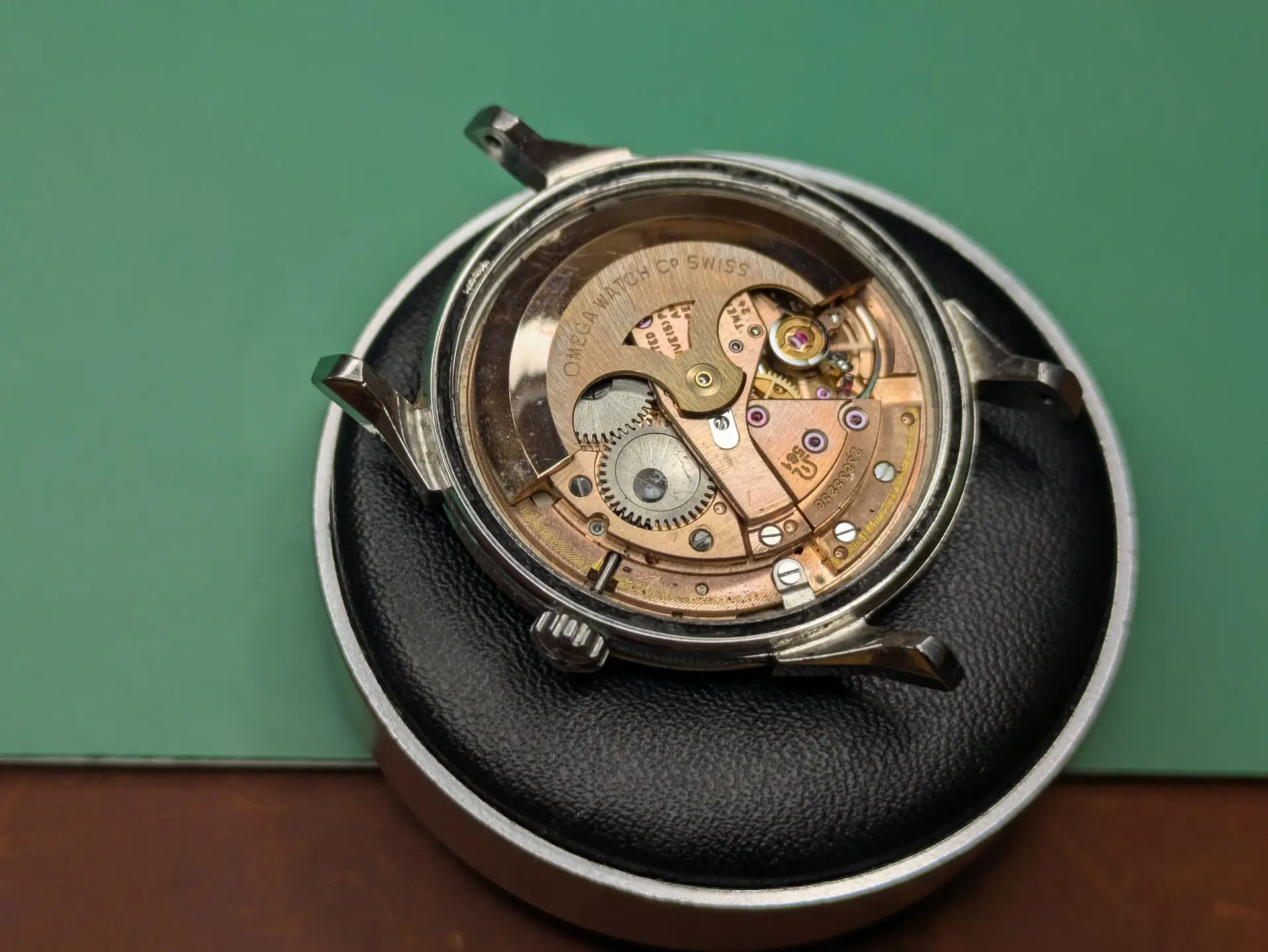 Bracelet is a off-brand one that'll end up in my junk pile (Spiedel, not Omega). I have some nice leather for it. There seems to be some rotor rub damage, but it doesn't rub anymore, so someone replaced the bearing along the way (which is a relief, as I cannot find a reamer of .702mm for the life of me!).