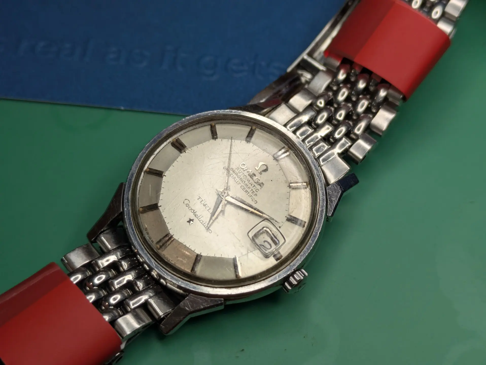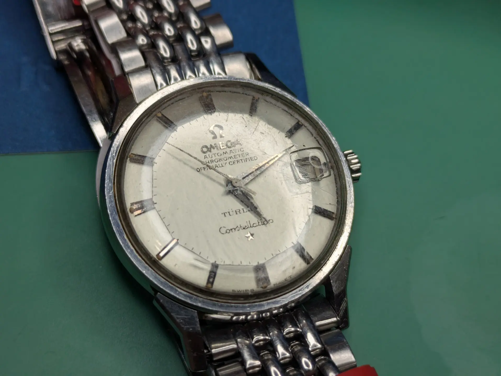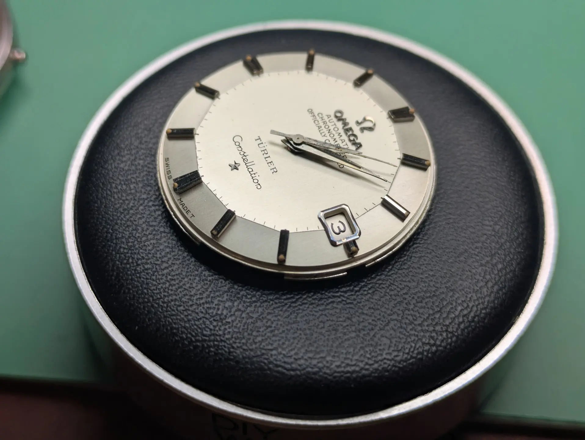 Bracelet is a off-brand one that'll end up in my junk pile (Spiedel, not Omega). I have some nice leather for it. There seems to be some rotor rub damage, but it doesn't rub anymore, so someone replaced the bearing along the way (which is a relief, as I cannot find a reamer of .702mm for the life of me!).