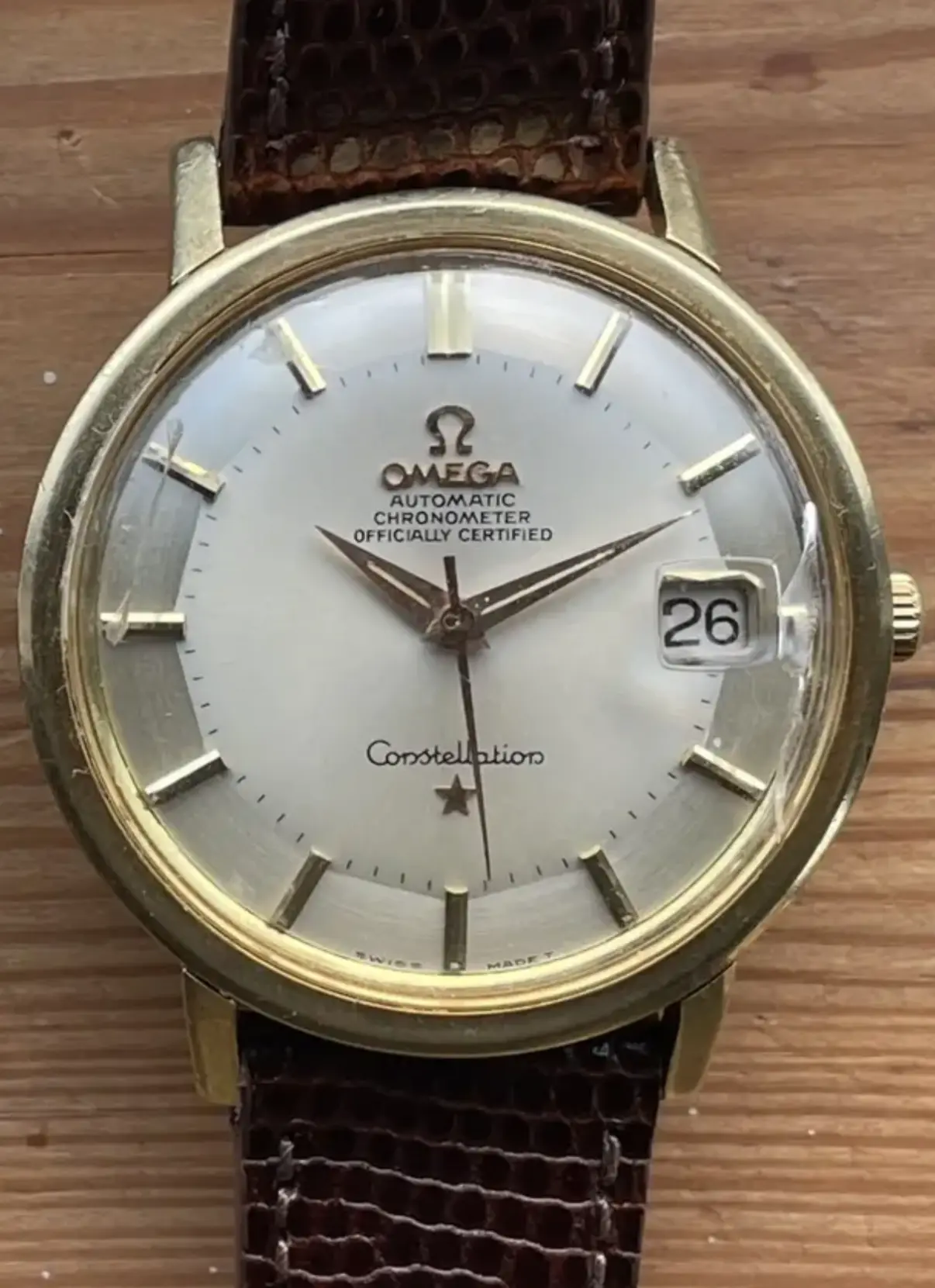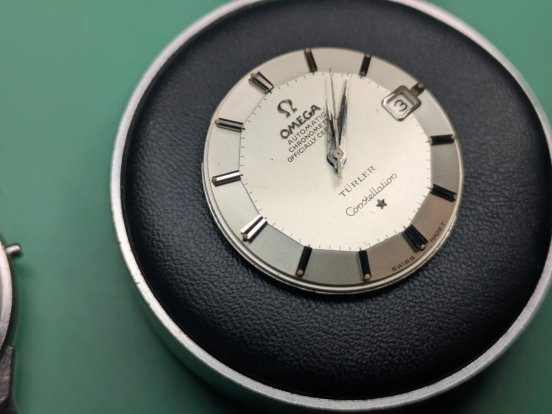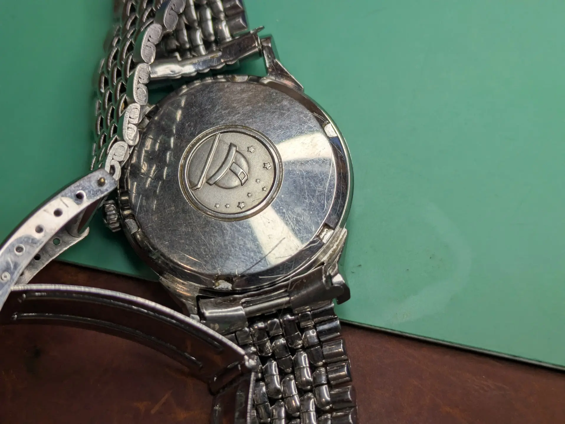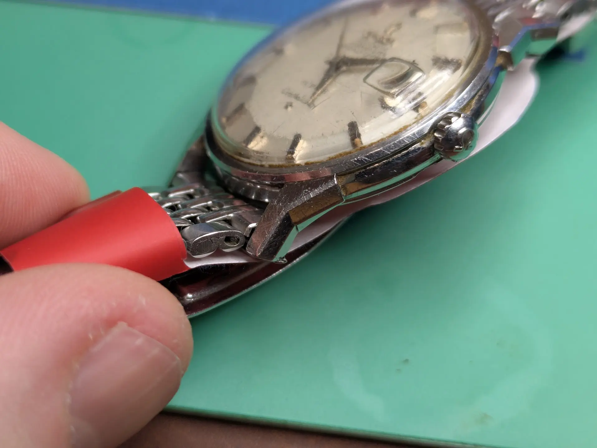 Bracelet is a off-brand one that'll end up in my junk pile (Spiedel, not Omega). I have some nice leather for it. There seems to be some rotor rub damage, but it doesn't rub anymore, so someone replaced the bearing along the way (which is a relief, as I cannot find a reamer of .702mm for the life of me!).